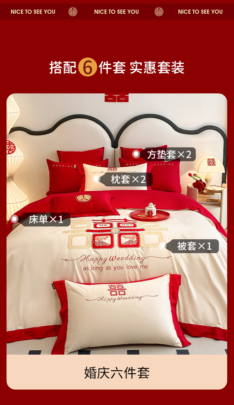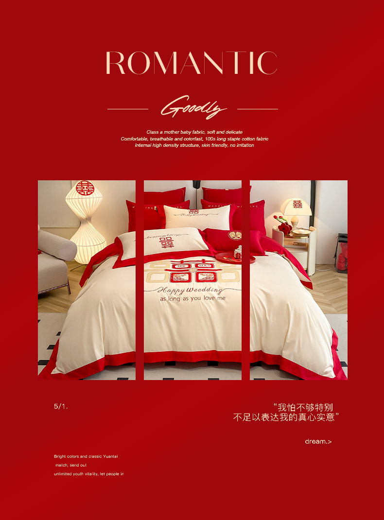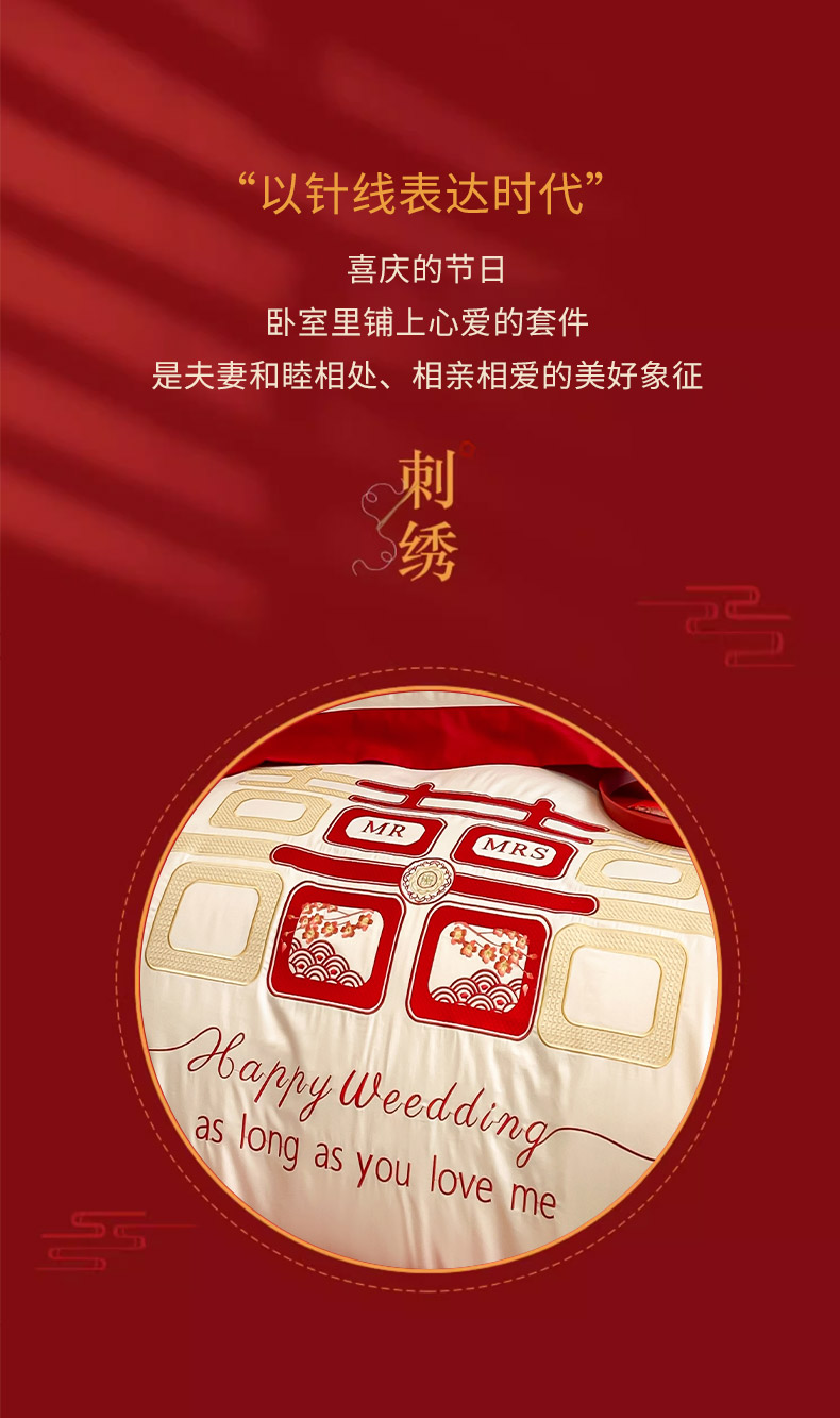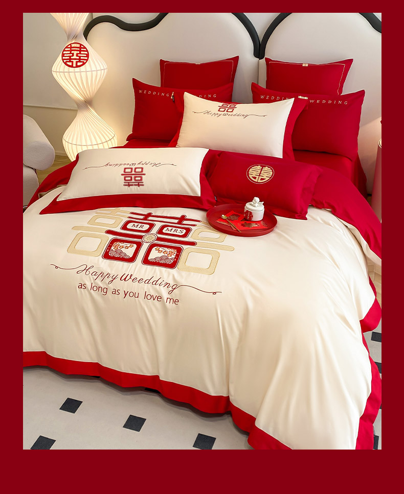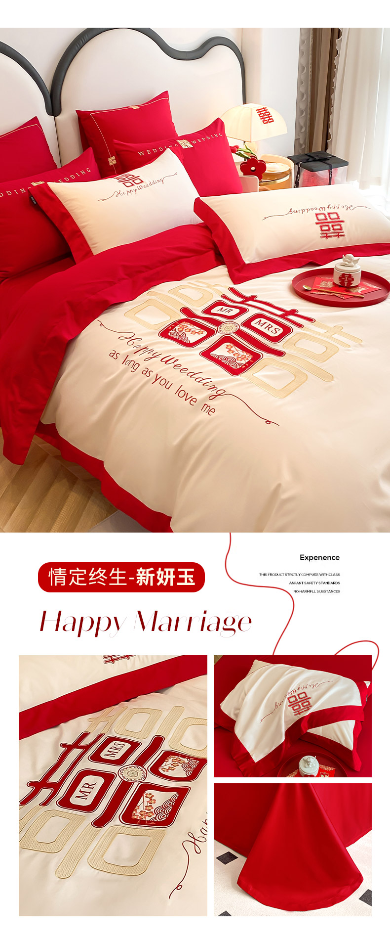当前位置: 91家纺网 > 商品网购 > 床品套件 > 四件套 > 婚庆四件套 > 2024新款长绒棉婚庆四件套系列三 情定终生-新妍玉