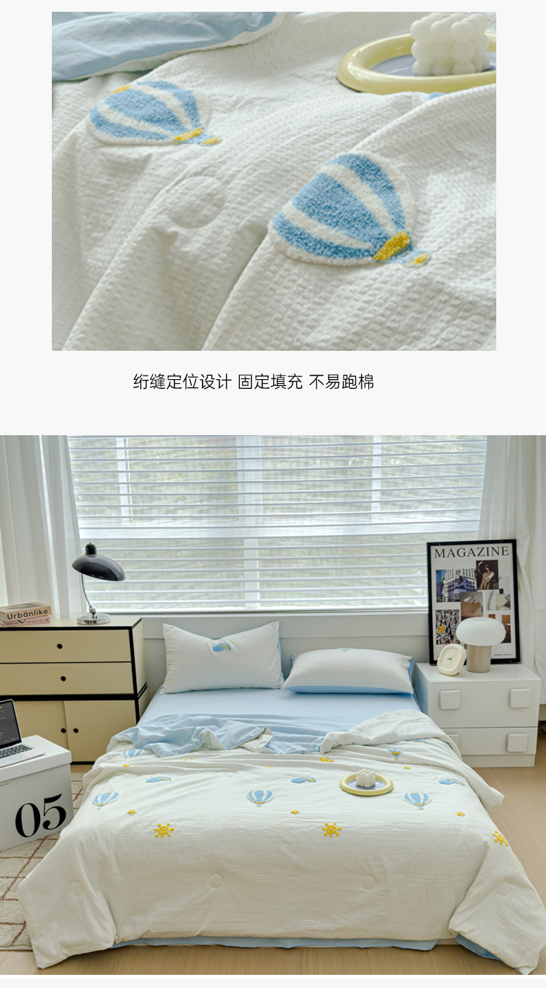 当前位置: 91家纺网 > 商品网购 > 被子 > 夏被 > 红嘴企鹅 2025新款华夫格水洗棉毛巾绣夏被四件套 华夫格热气球