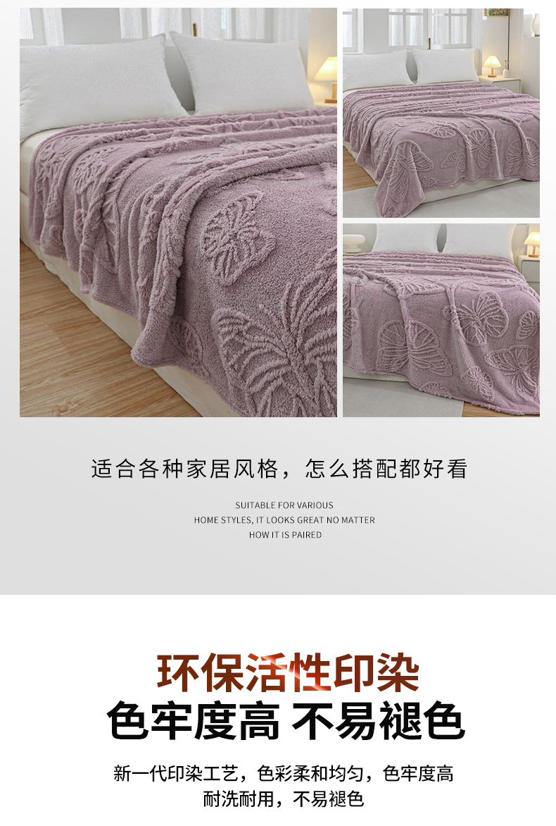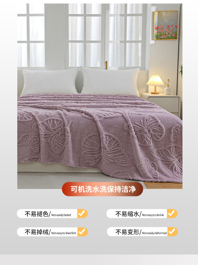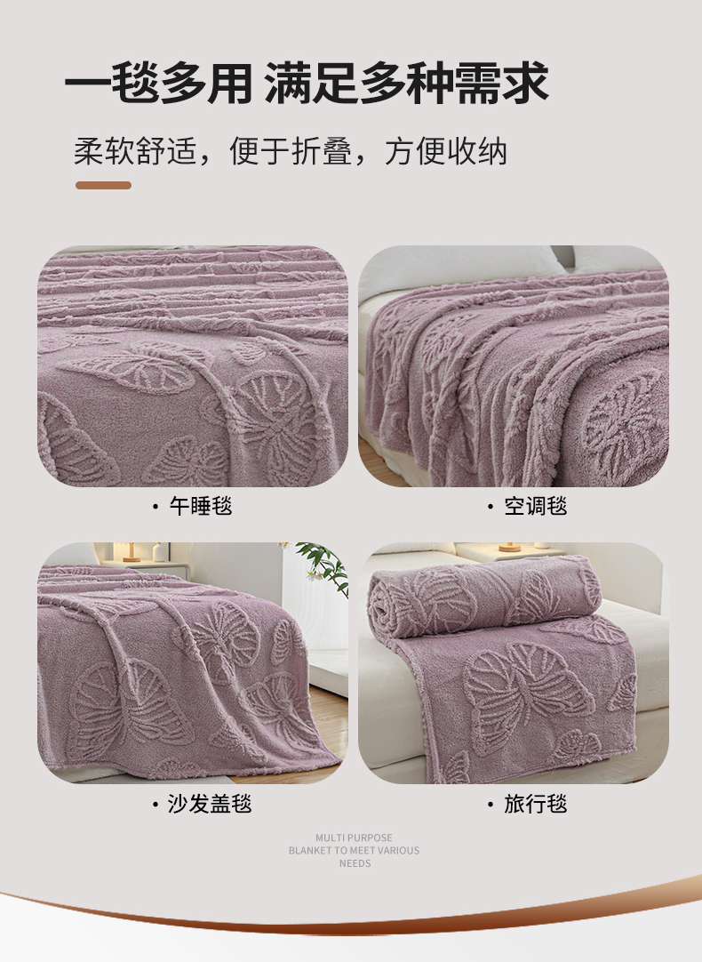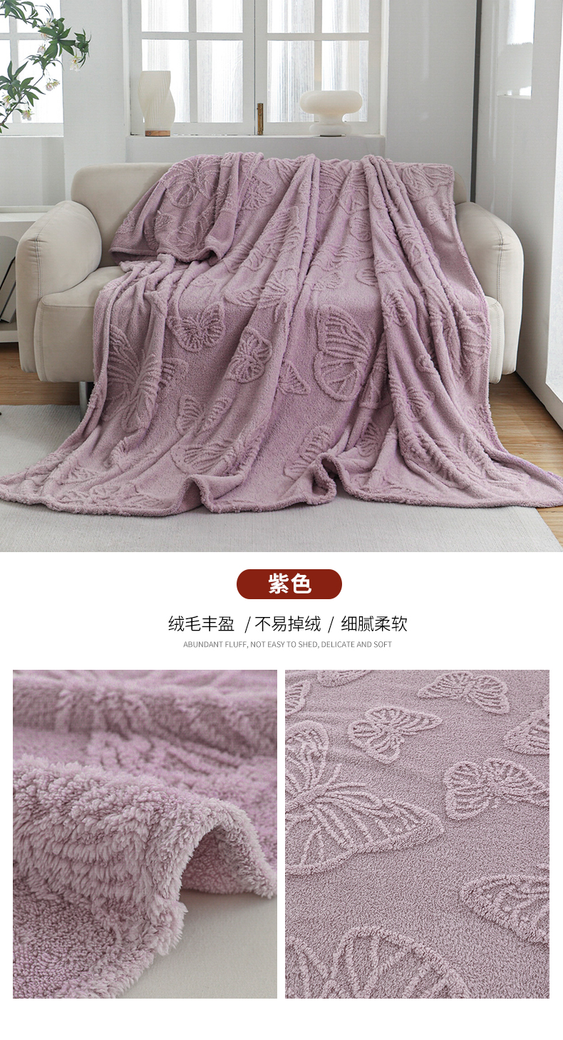 商品名称:枋梢家纺 2024新款跨境电商塔芙绒纯色蝴蝶花提花多功能盖毯午睡毯子办公毛毯 紫色
