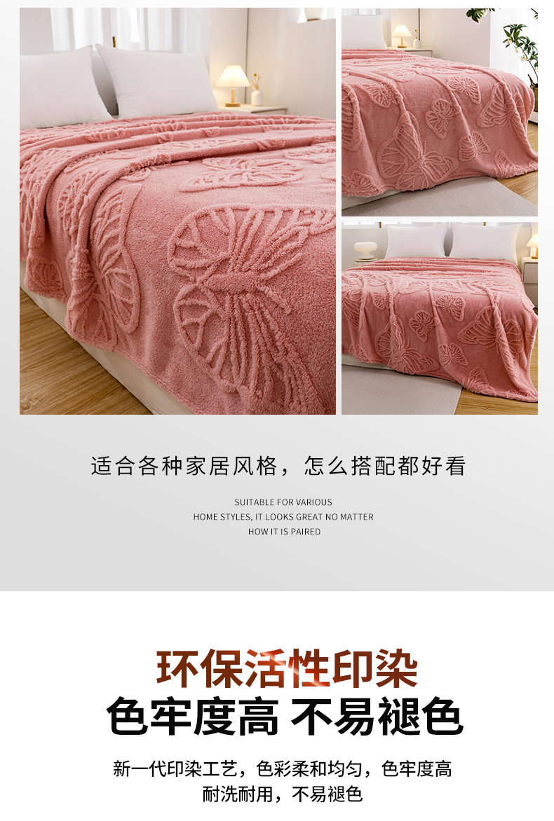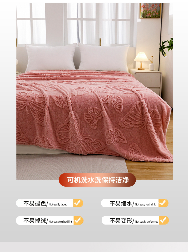 商品名称:金来家纺 2024新款单层双面塔芙绒蝴蝶花提花毛毯 蝴蝶粉色