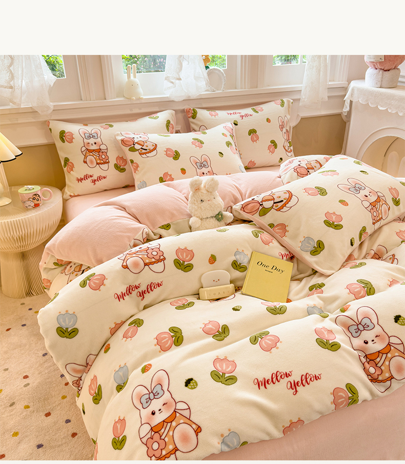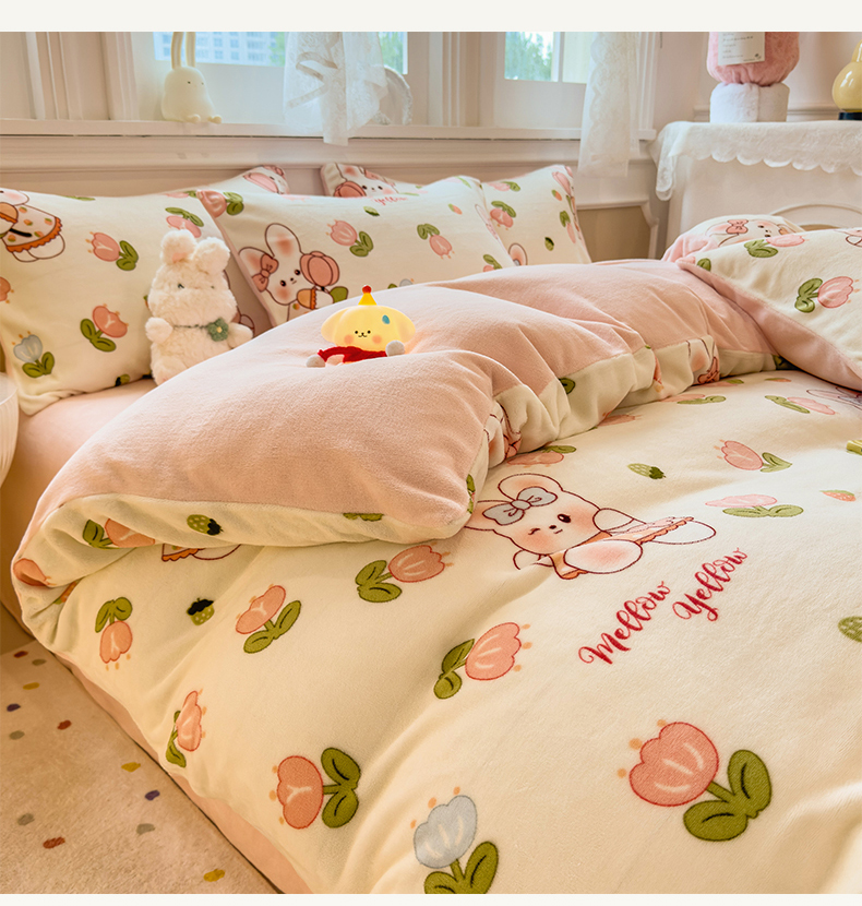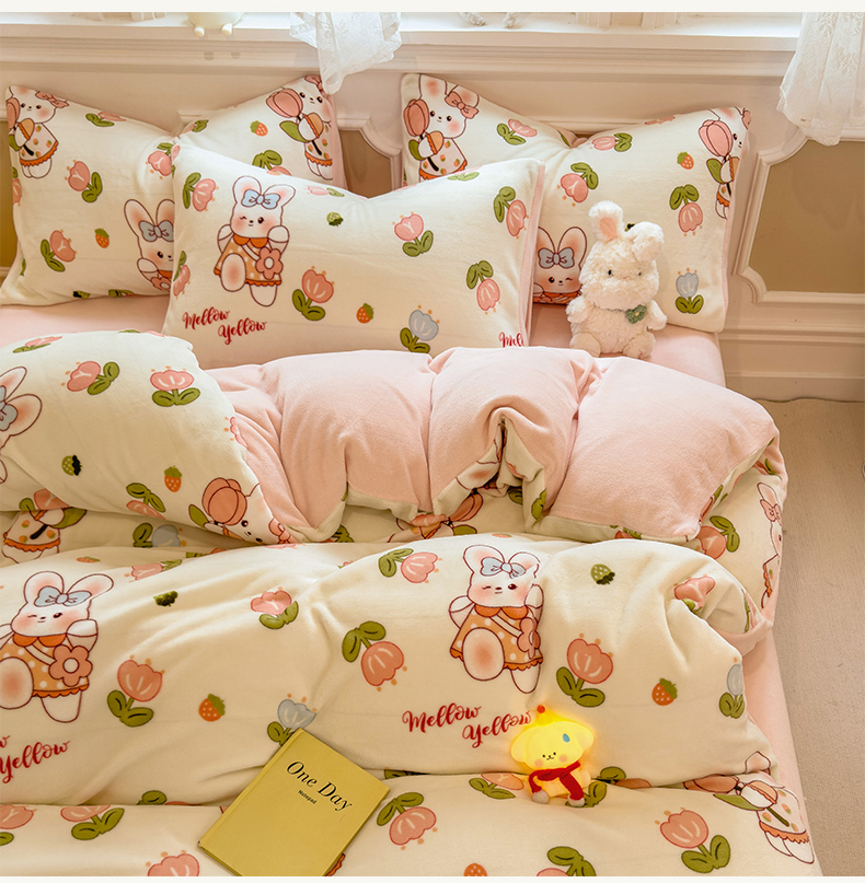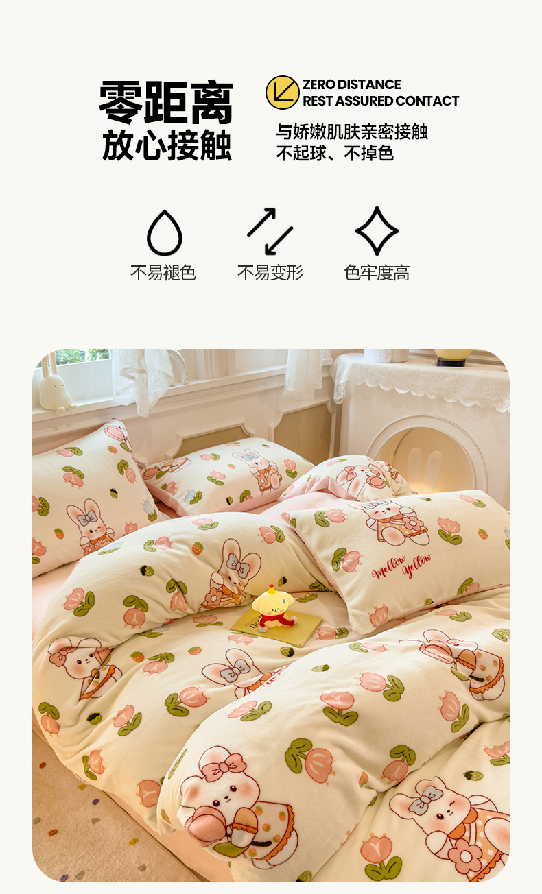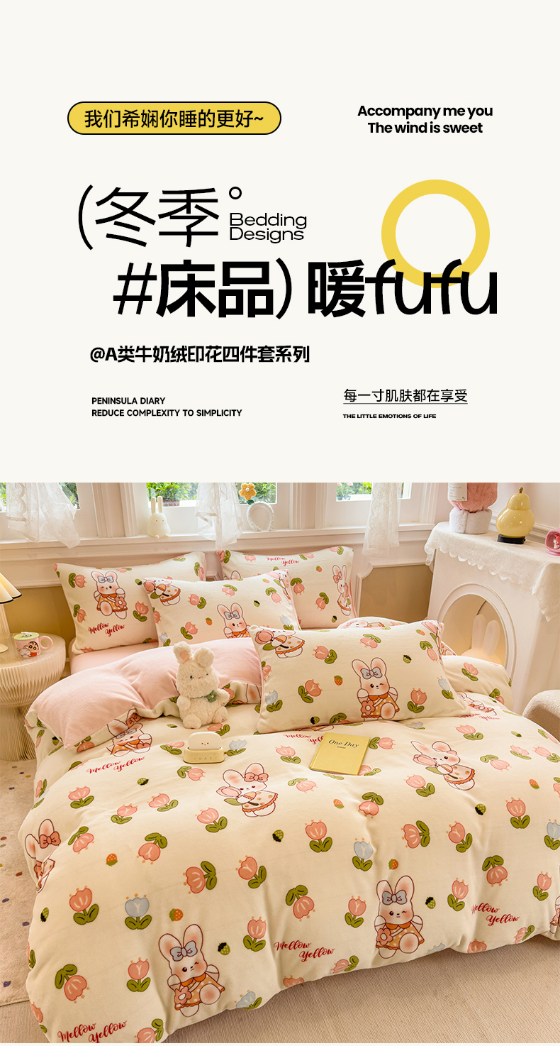 当前位置: 91家纺网 > 商品网购 > 床品套件 > 四件套 > 牛奶绒四件套 > 摩妮卡 2025新款小清新牛奶绒印花四件套床单款床笠单被套-场景1 早安兔