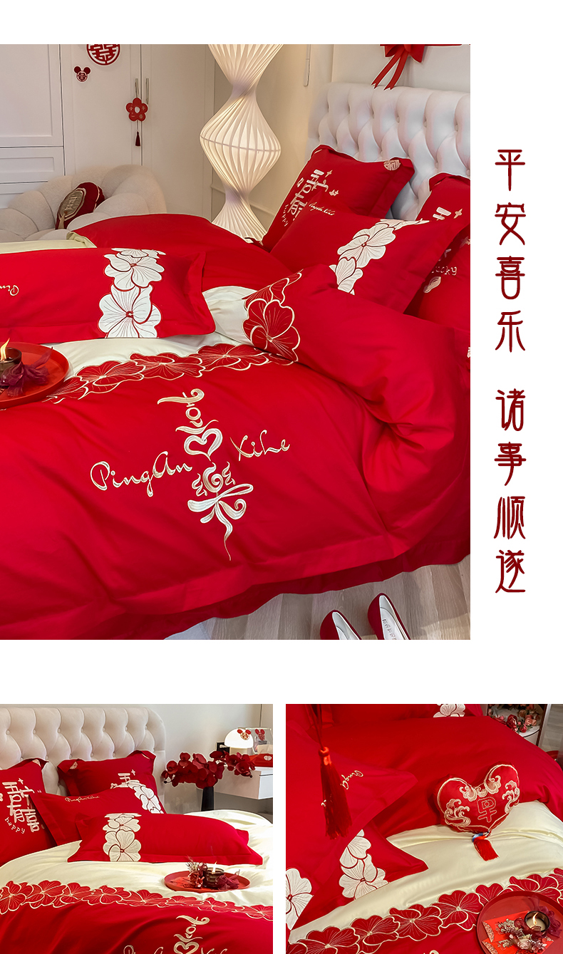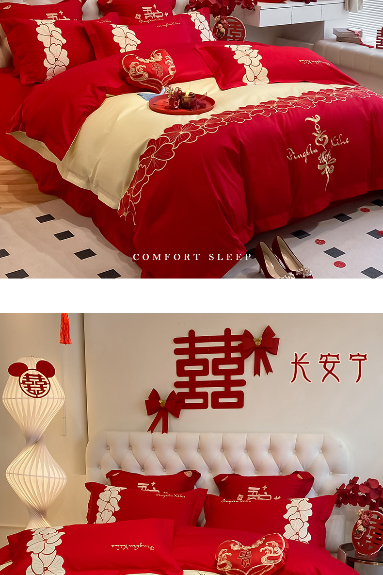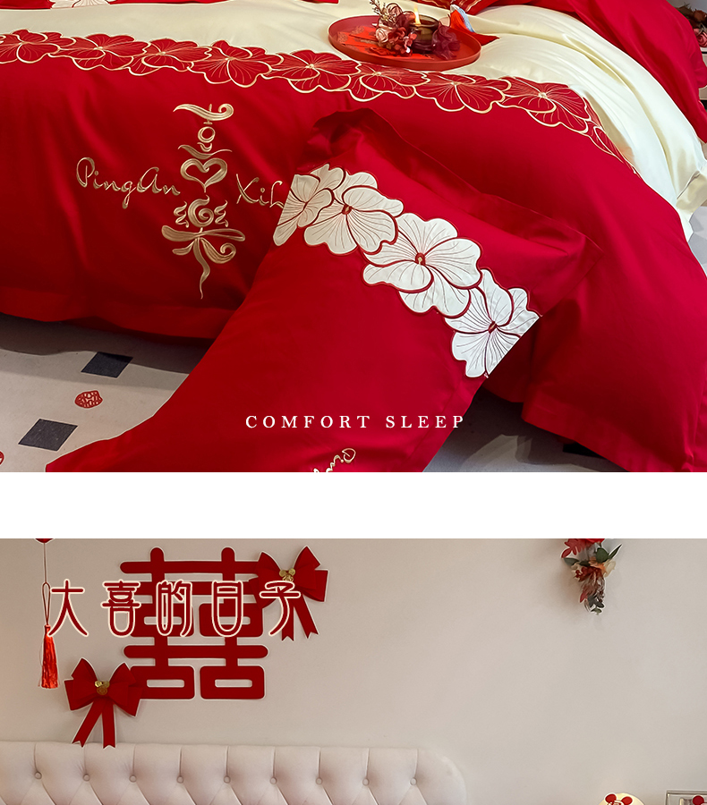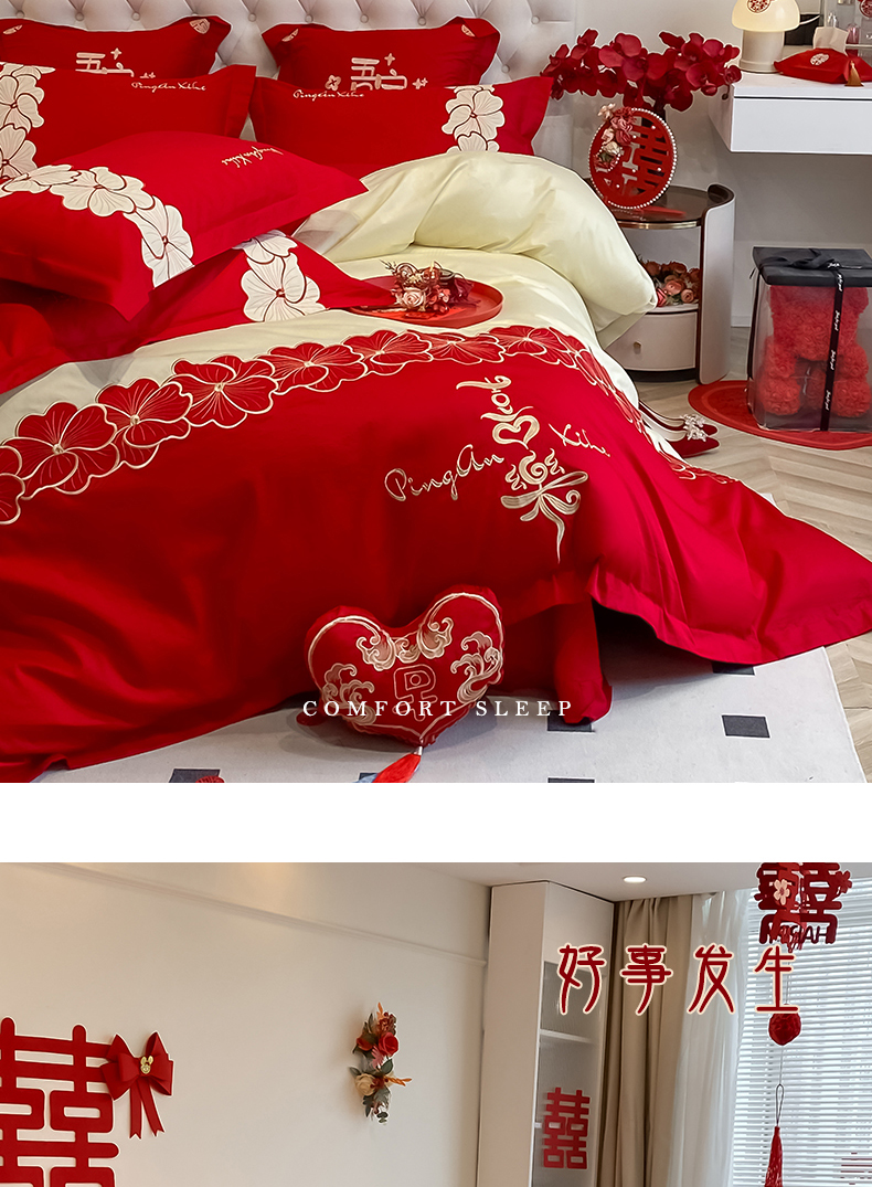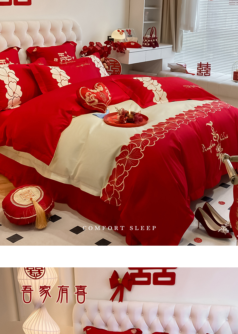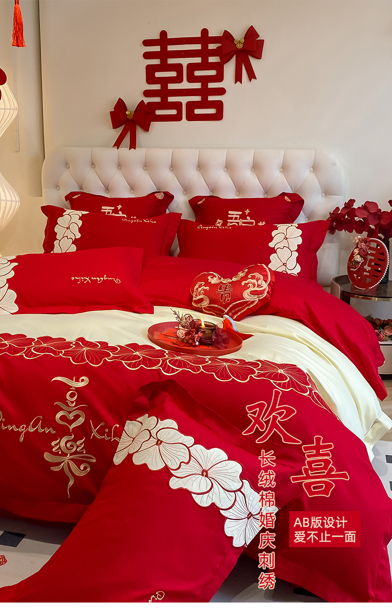 当前位置: 91家纺网 > 商品网购 > 床品套件 > 四件套 > 婚庆四件套 > 玉雅家纺 2025新款60支长绒棉时尚拼色浮雕刺绣婚庆四件套 定情