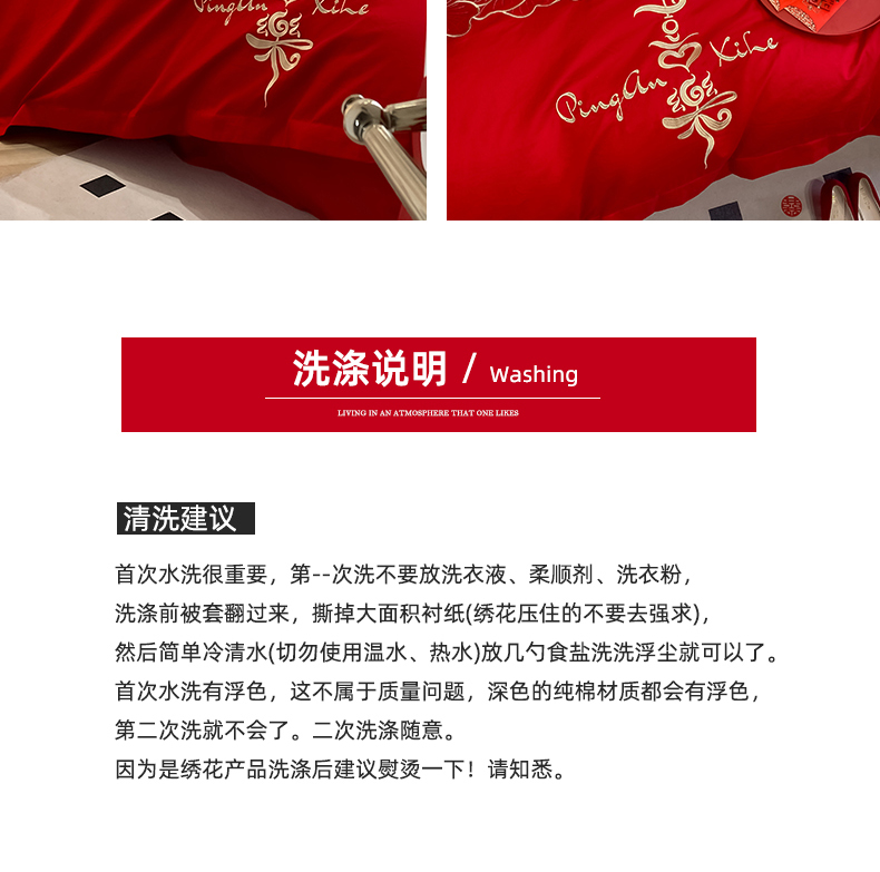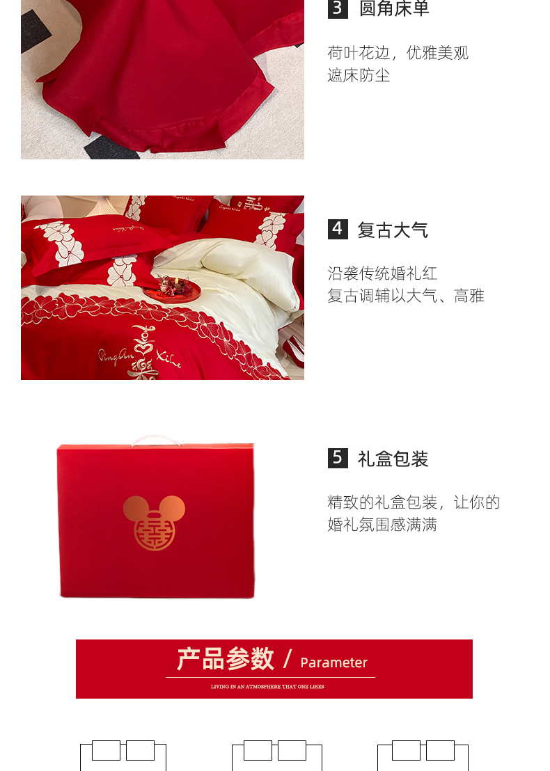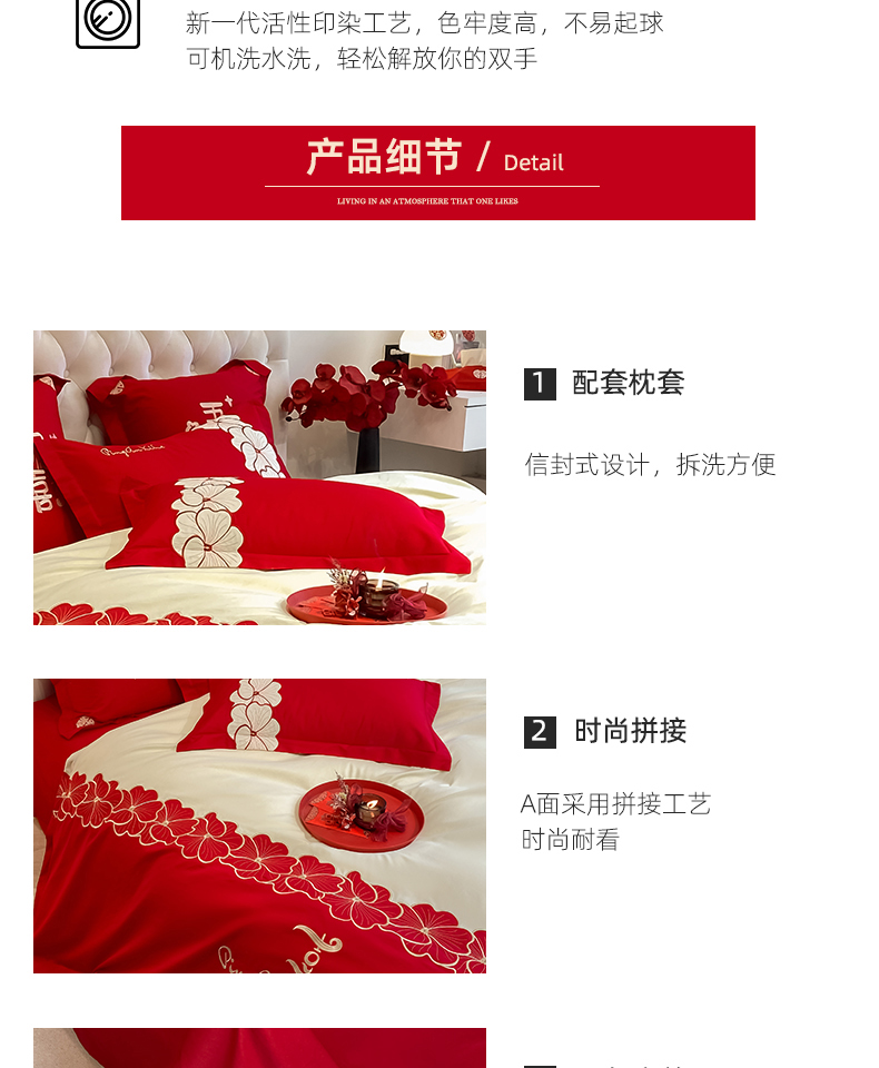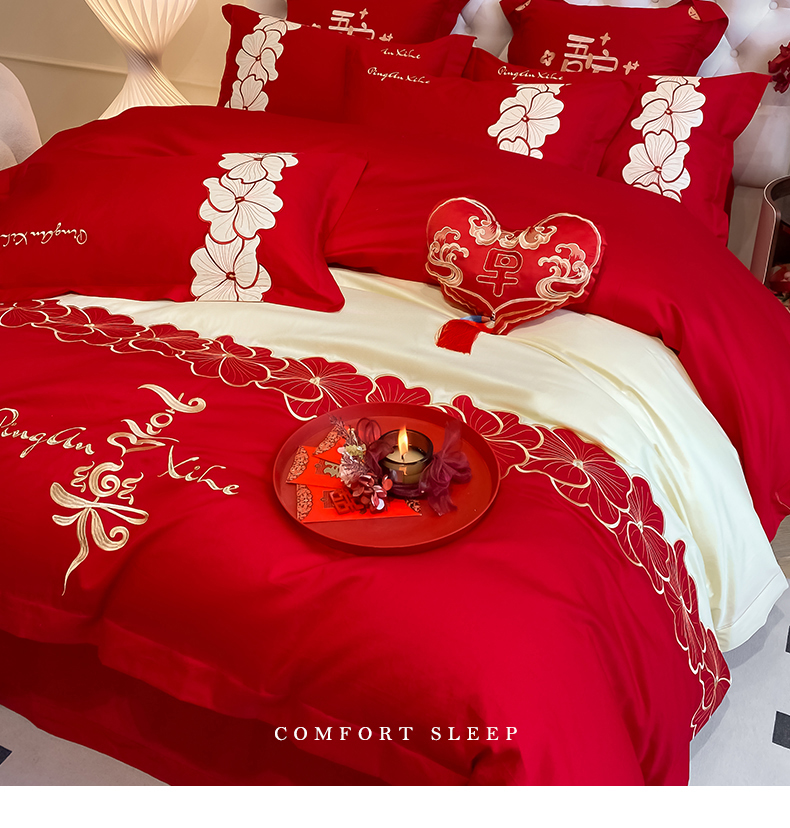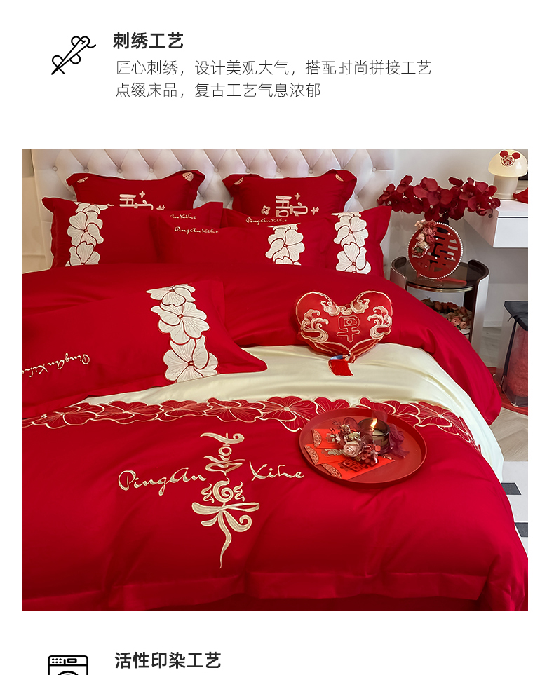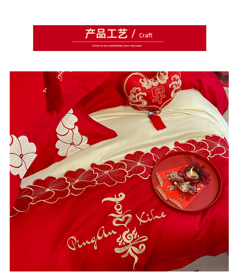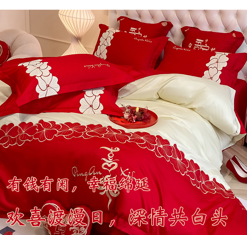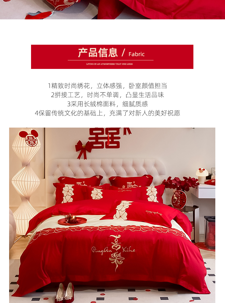 当前位置: 91家纺网 > 商品网购 > 床品套件 > 四件套 > 婚庆四件套 > 玉雅家纺 2025新款60支长绒棉时尚拼色浮雕刺绣婚庆四件套 定情