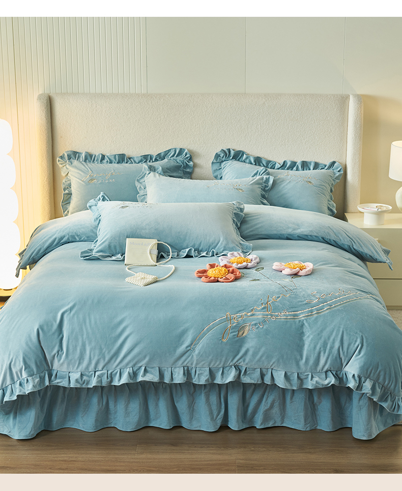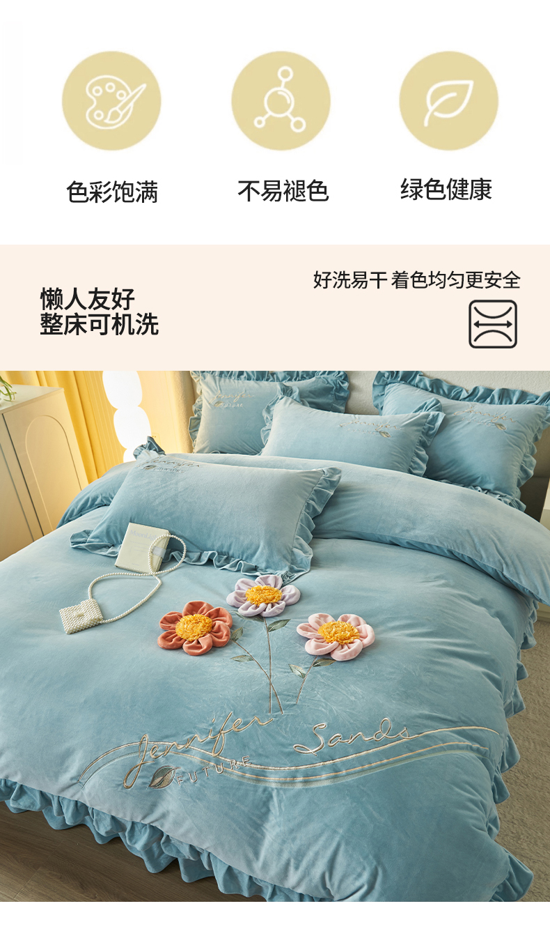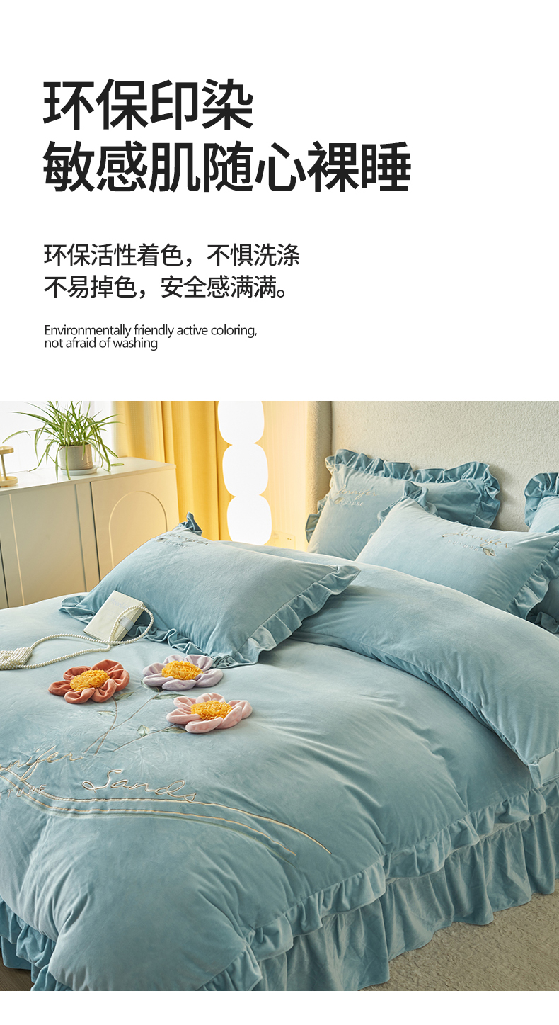 (总)恒爱 2022新款秋冬轻奢宝宝绒刺绣床裙款四件套,爱玛橙,宾利蓝,豆沙红,橄榄绿,高级灰,酒红,梦想粉,浅灰蓝,温馨粉,喜庆红,香妃粉,香芋紫