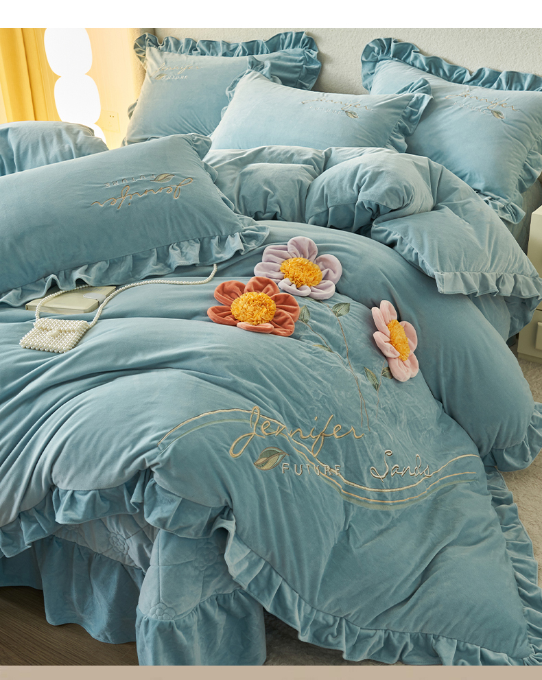 2024新款向阳花开宝宝绒刺绣四件套 浅灰蓝