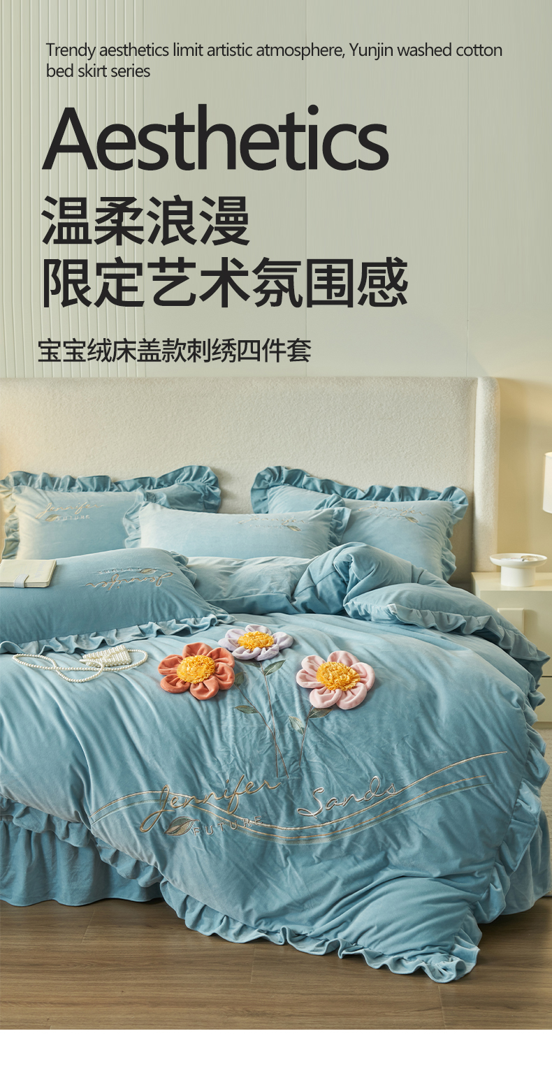 (总)恒爱家纺 2025新款牛奶绒贴布绣夹棉床裙四件套,豆沙红,浪漫紫,天空蓝,温馨粉,象牙白