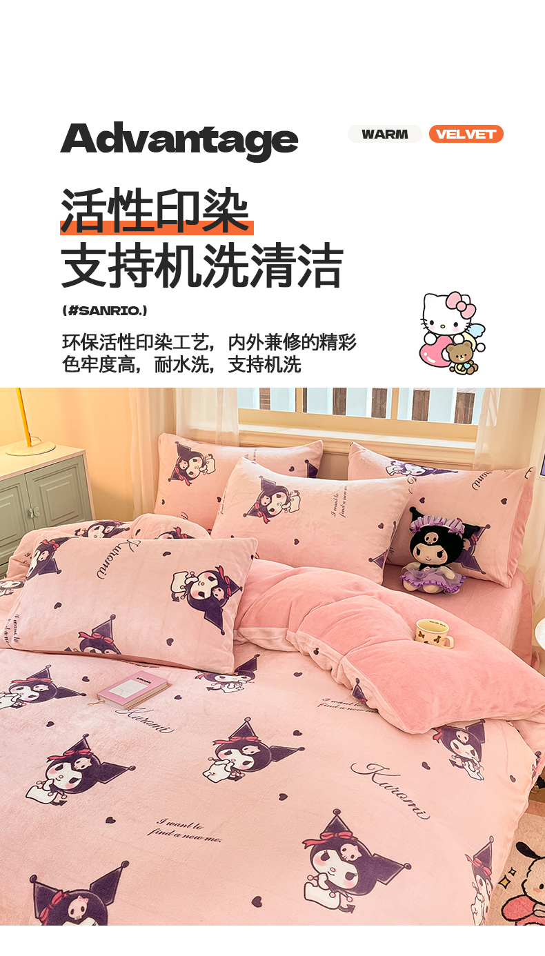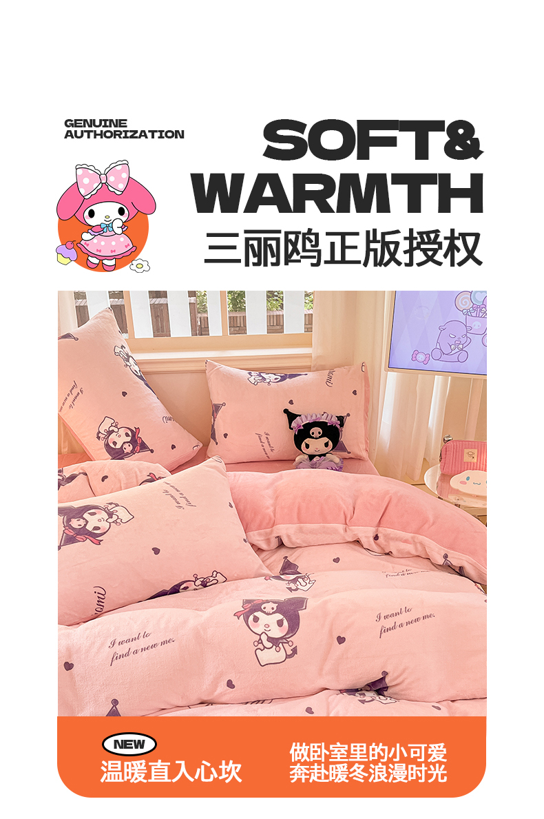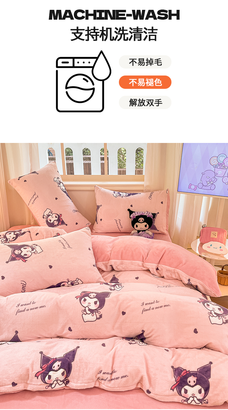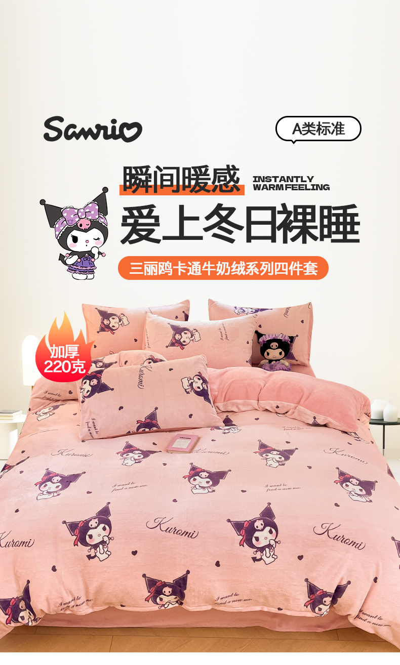 当前位置: 91家纺网 > 商品网购 > 床品套件 > 四件套 > 牛奶绒四件套 > 桃子家居 2024新款三丽鸥卡通加厚高克重200克牛奶绒系列四件套 绒三丽鸥-可爱库洛米