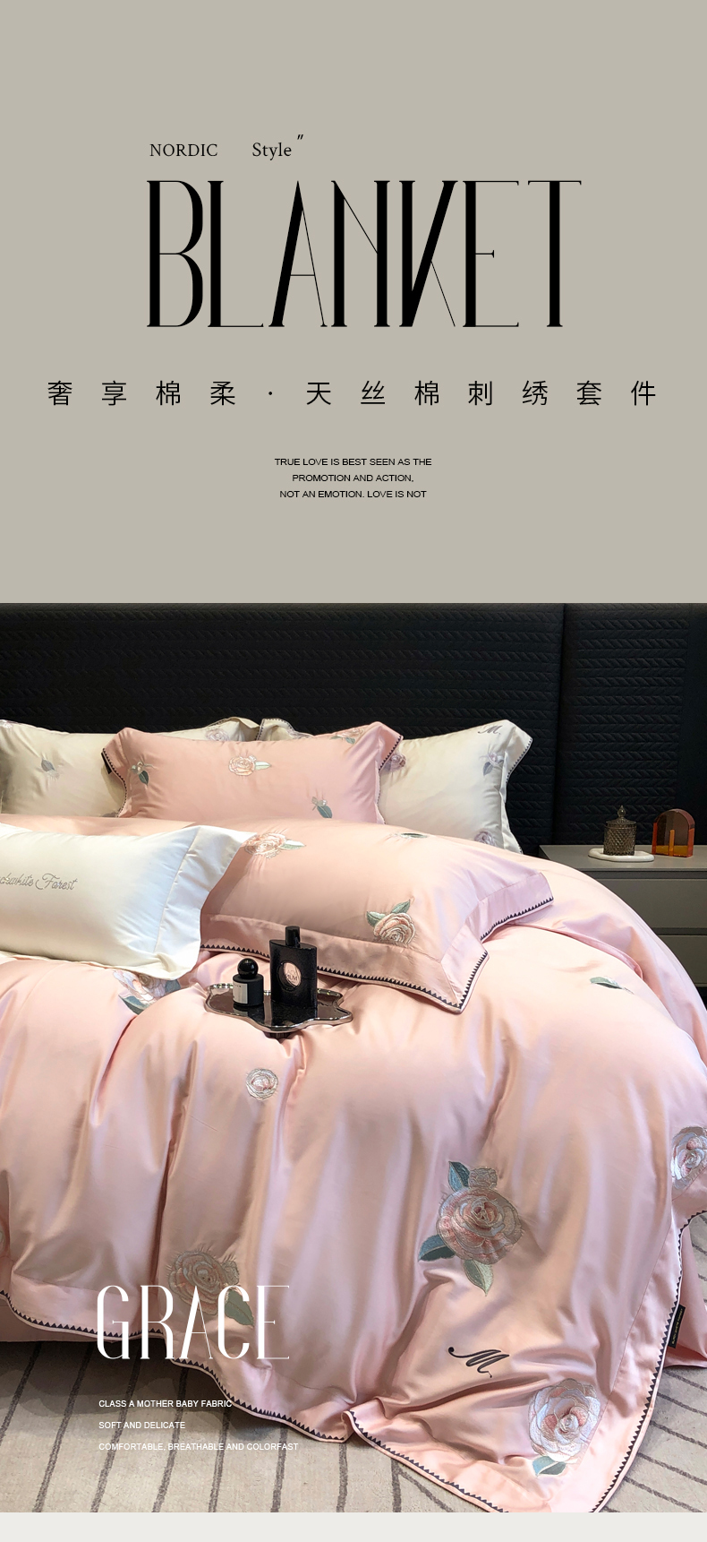 (总)黑白森林2024款 80X80S高支天丝棉四件套镂空蕾丝花边天丝全棉,尚美-晨夕粉,尚美-古象白,尚美-青砂绿,尚美-银雪灰