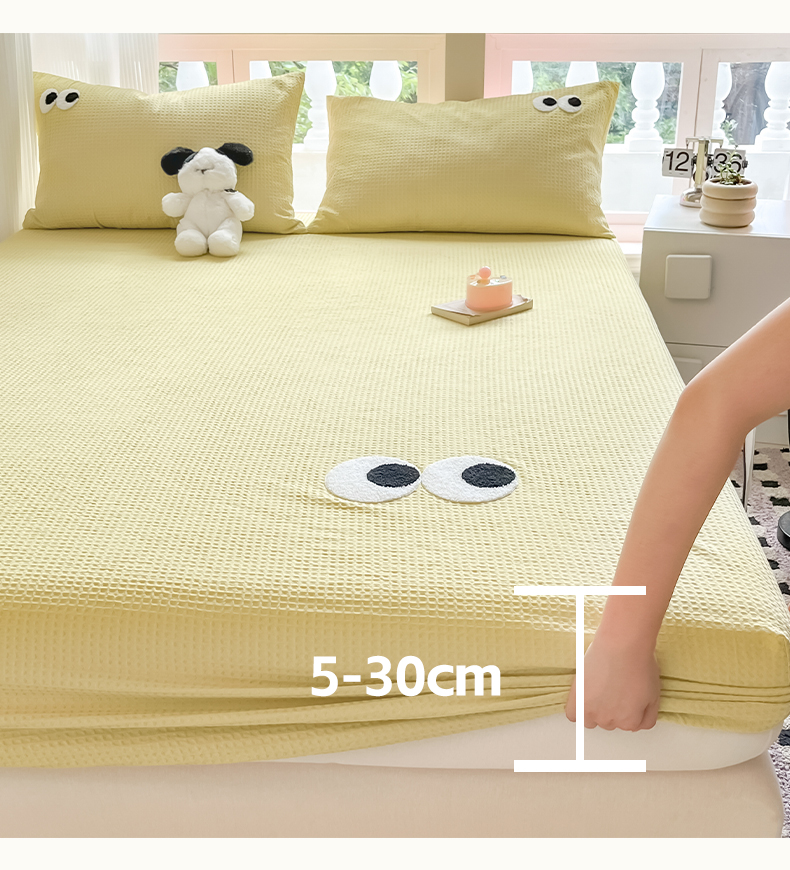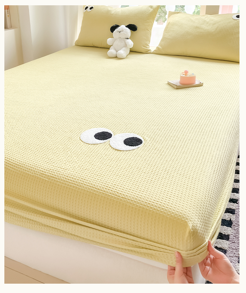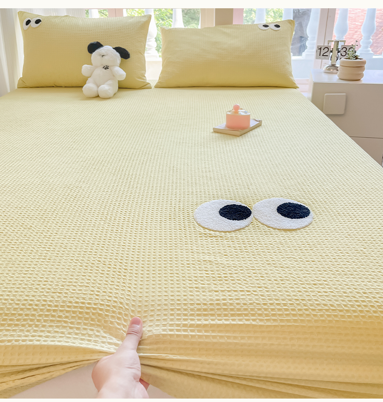 居眠 2024新款全棉华夫格毛巾绣床笠 呆呆大眼-黄