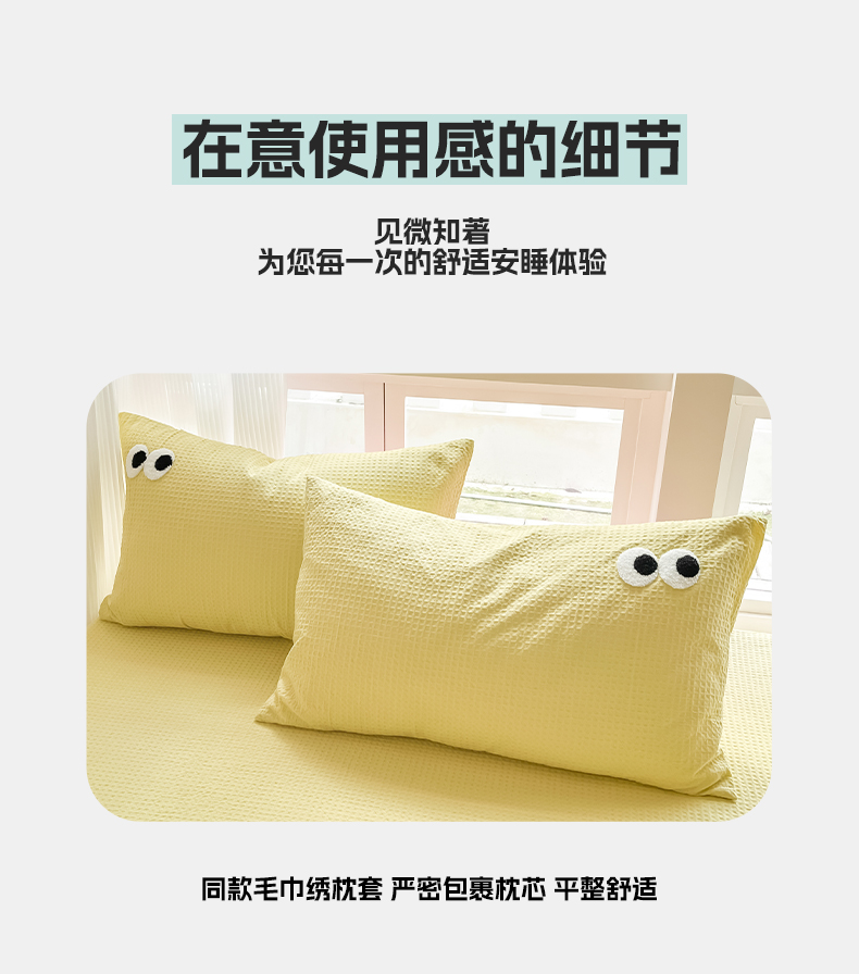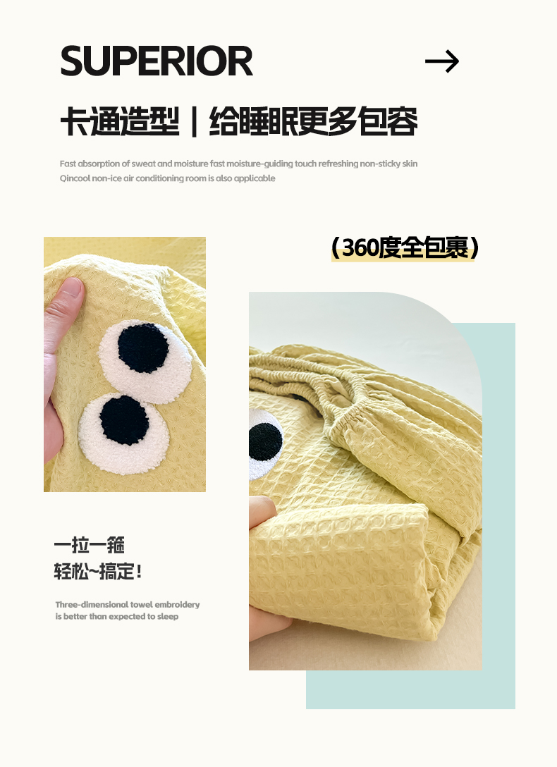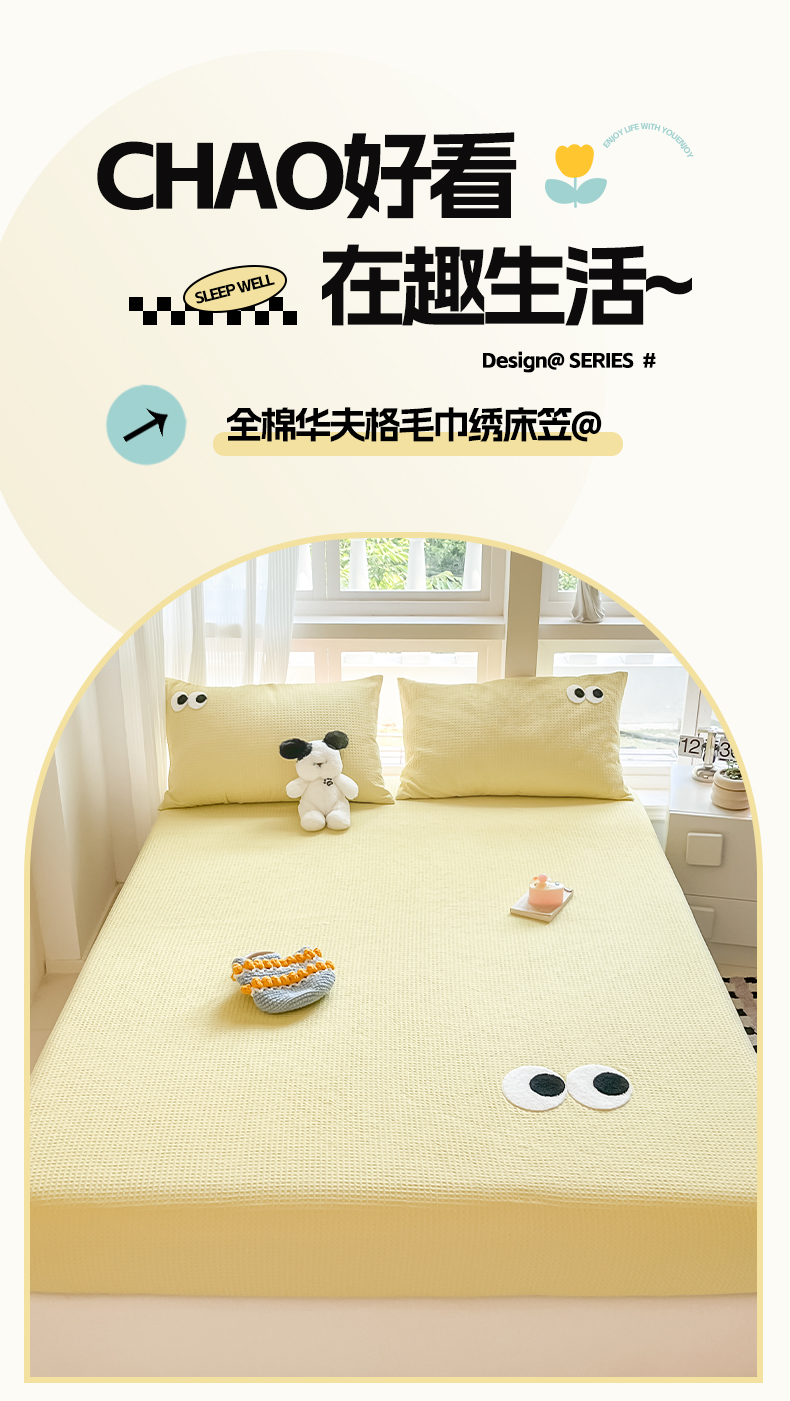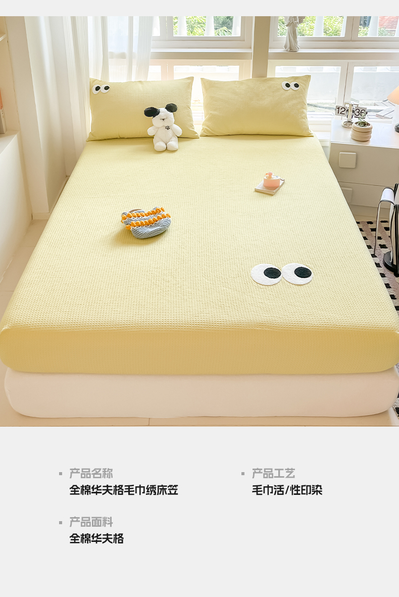 商品名称:居眠 2024新款全棉华夫格毛巾绣床笠 呆呆大眼-黄