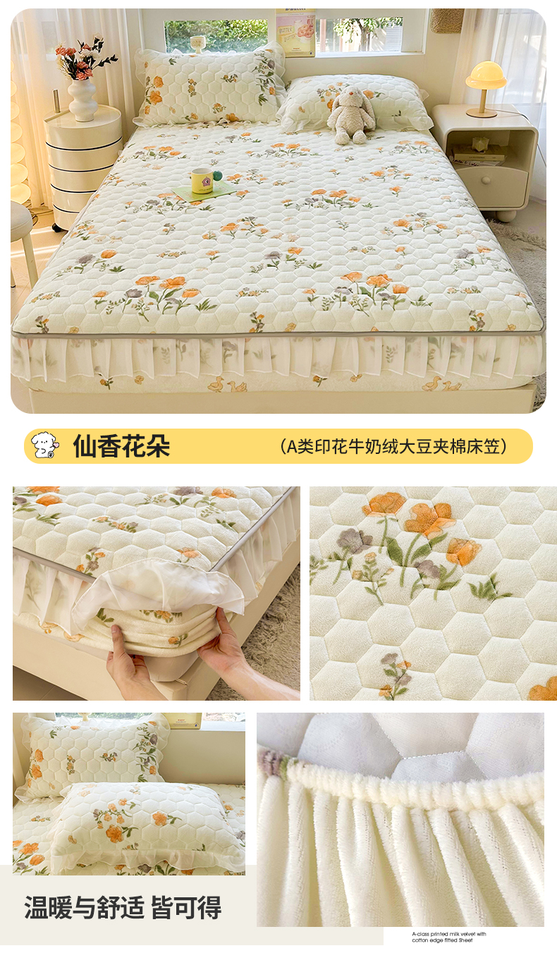 • 91家纺网 家纺一手货源 找家纺 伊人坊 2024冬季加厚牛奶绒花边夹棉床笠三件套纯色印花花边款床垫保护套 仙香花朵