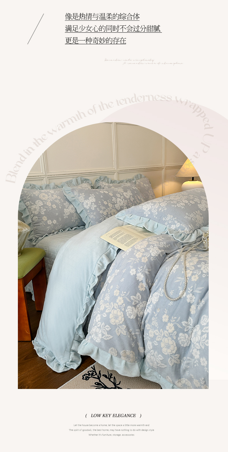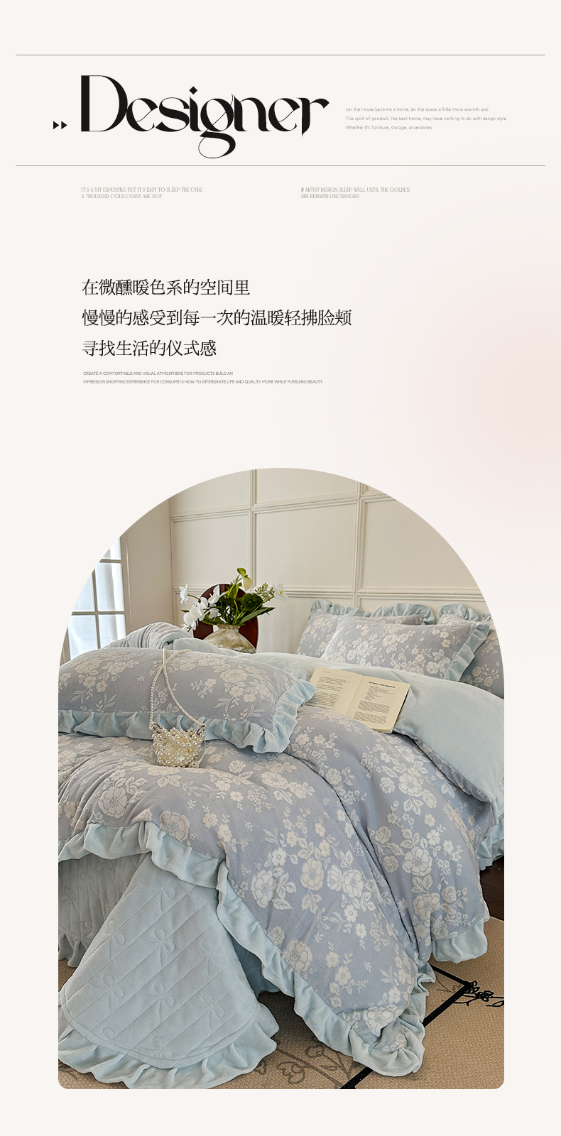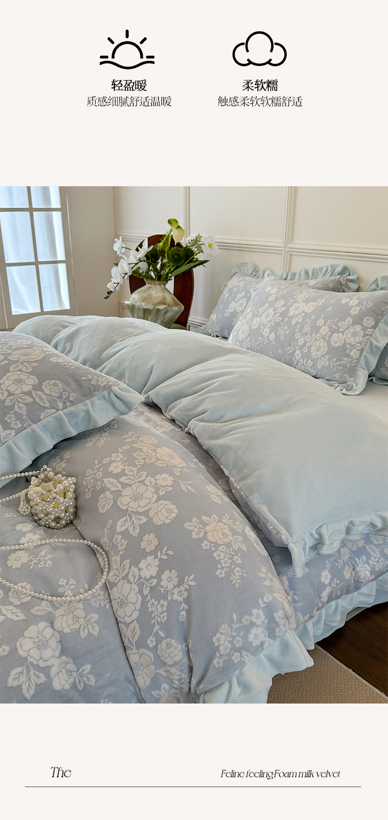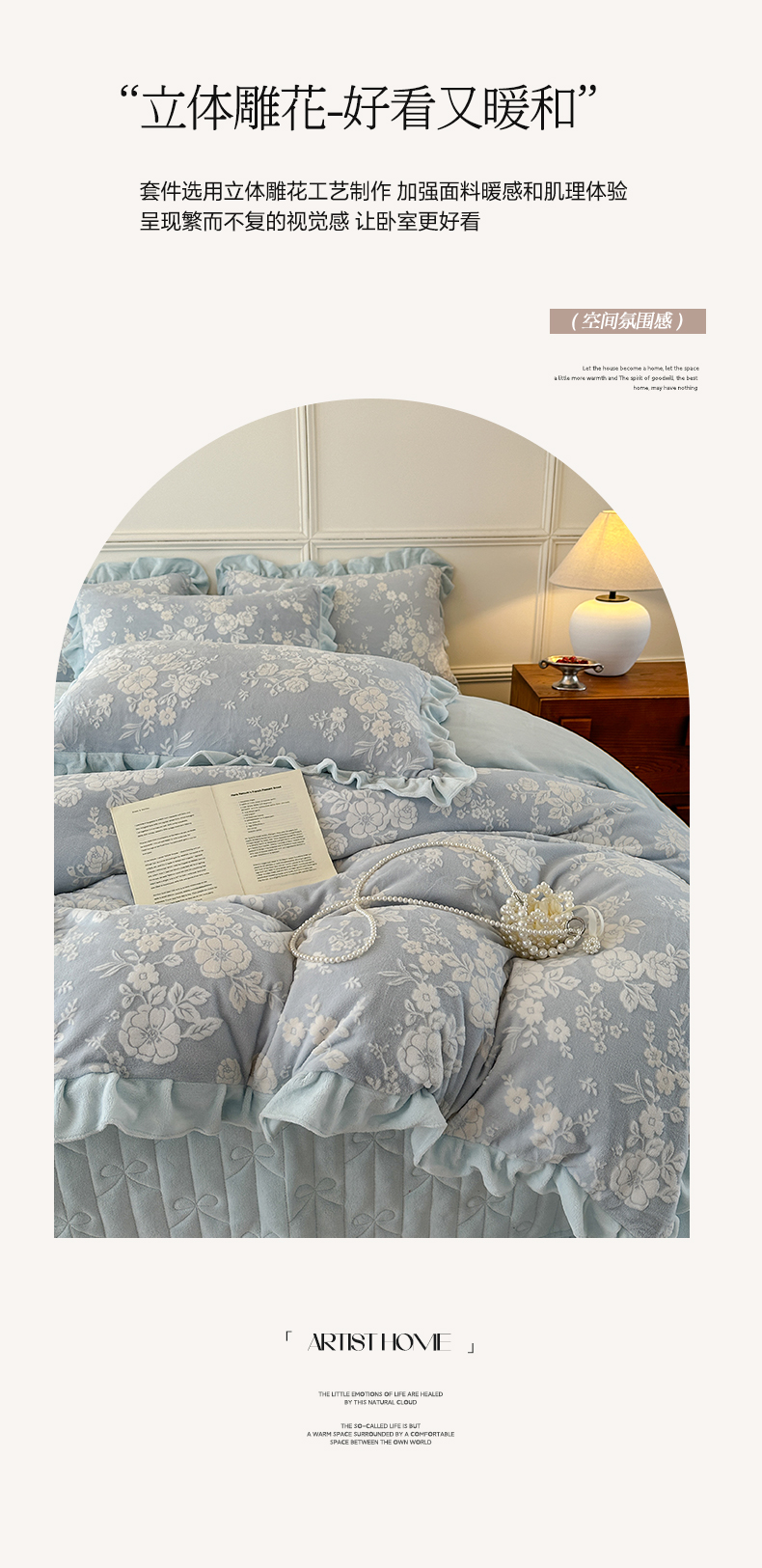 当前位置: 91家纺网 > 商品网购 > 床品套件 > 四件套 > 牛奶绒四件套 > 野合家纺 2024新款法式A类雕花牛奶绒韩版公主风四件套床盖款床单款床笠款 花开花艳-蓝