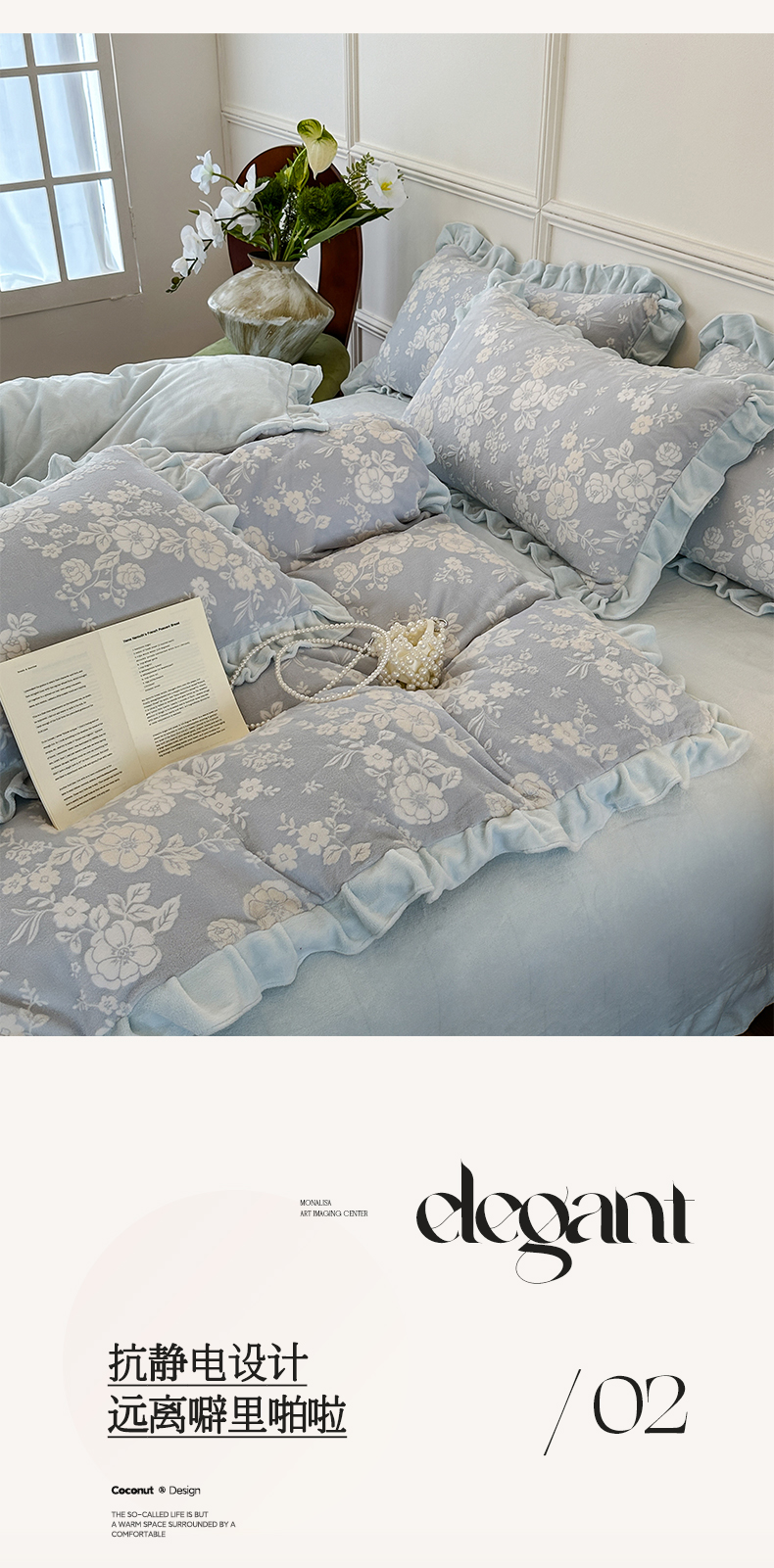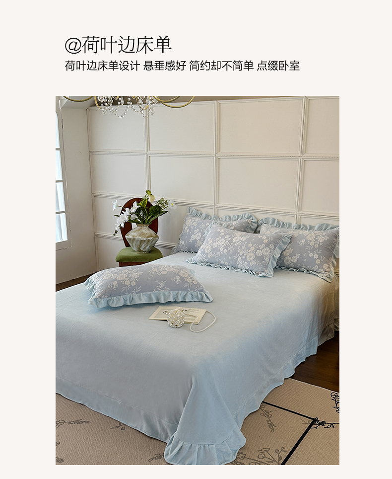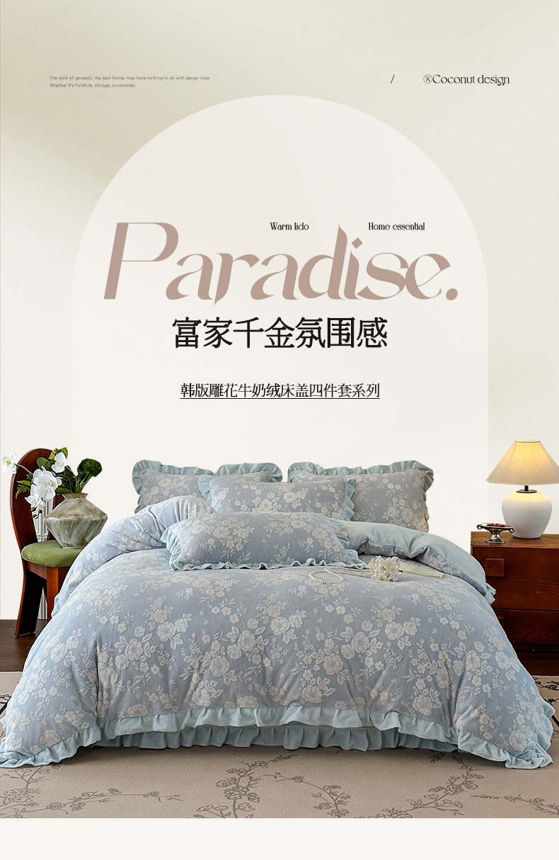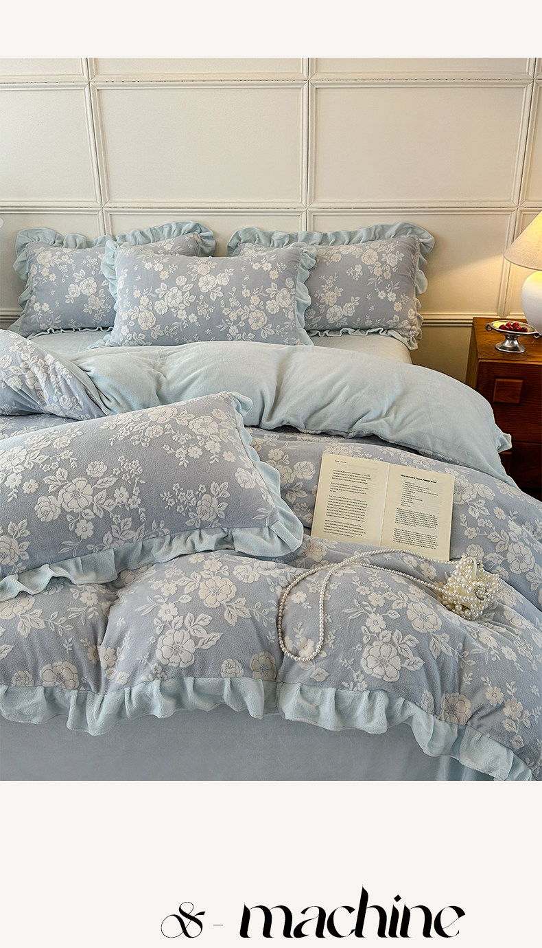 当前位置: 91家纺网 > 商品网购 > 床品套件 > 四件套 > 牛奶绒四件套 > 野合家纺 2024新款法式A类雕花牛奶绒韩版公主风四件套床盖款床单款床笠款 花开花艳-蓝