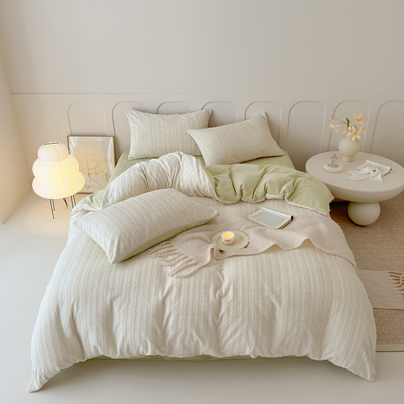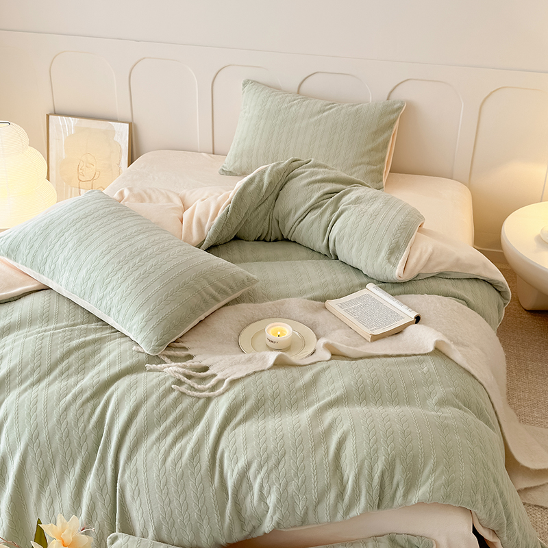 (总)潘朵拉 2023新款直播爆款撞色牛奶绒提花四件套,梦境-粉灰,梦境-蓝黄,梦境-米咖,山茶花-绿粉,山茶花-奶绿
