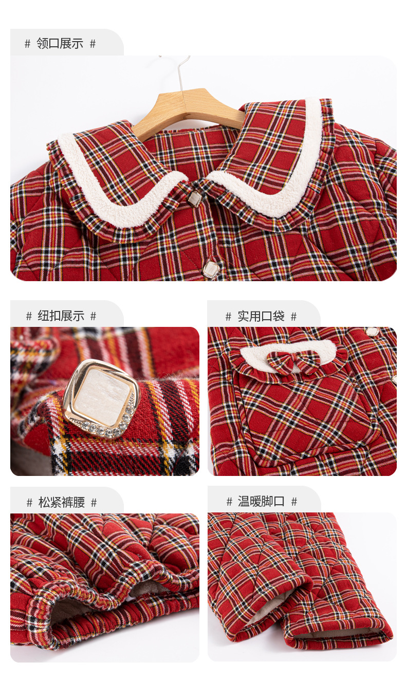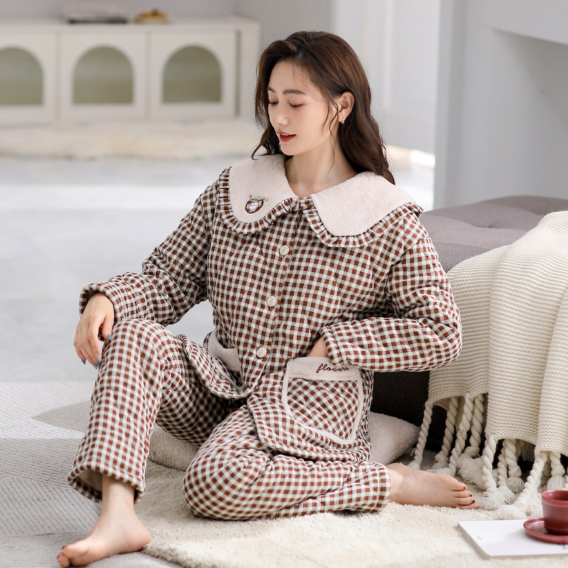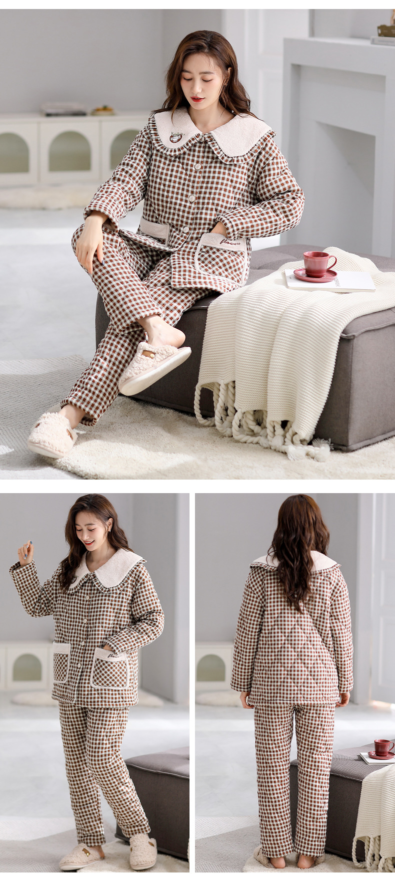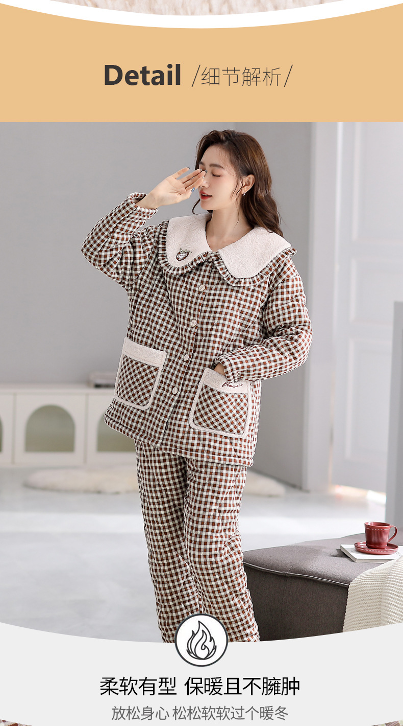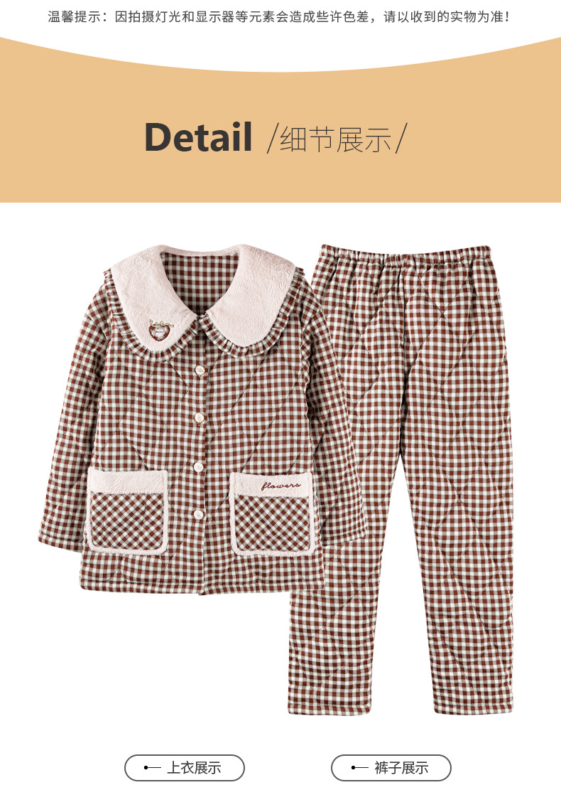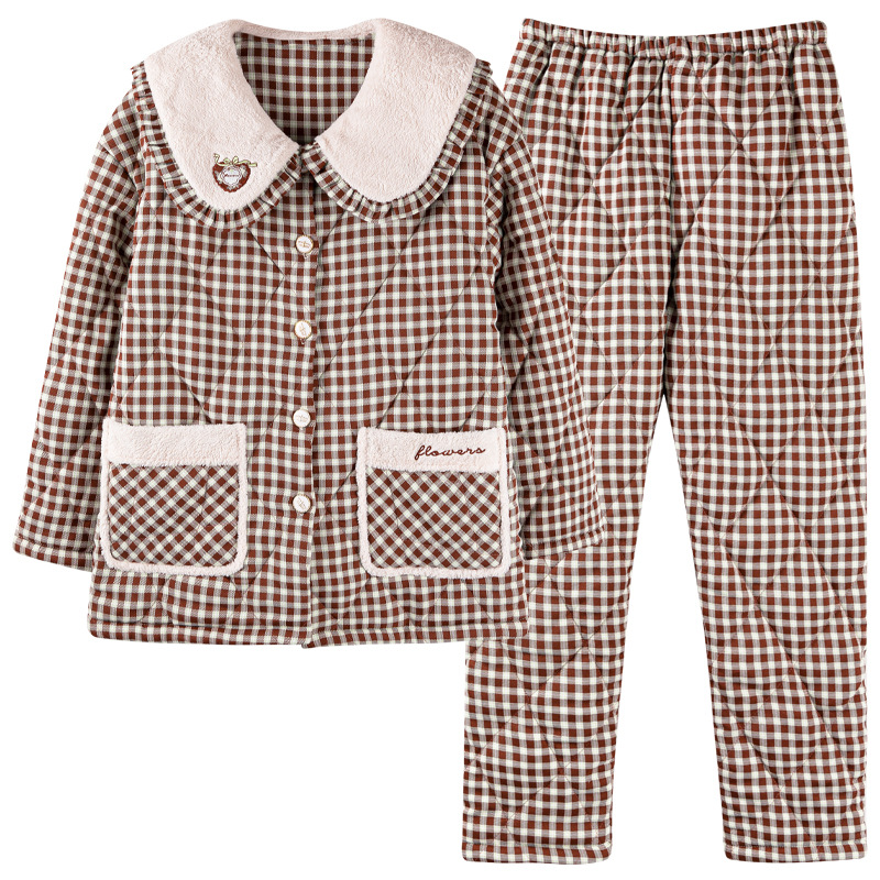 (总)洛兰沙家居馆 2024新款清新款睡衣女秋冬季三层夹棉珊瑚绒加厚保暖两件套女士可外穿加绒家居服,咖小格,粉小格,黑小格,绿小格,红小格,棕小格