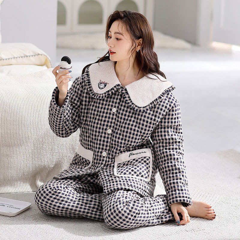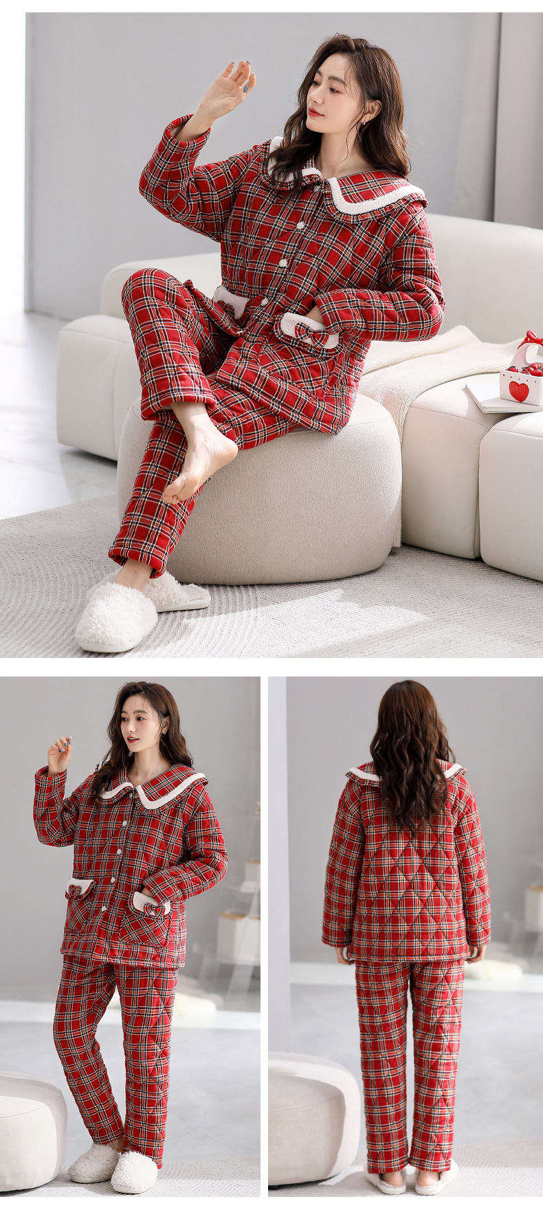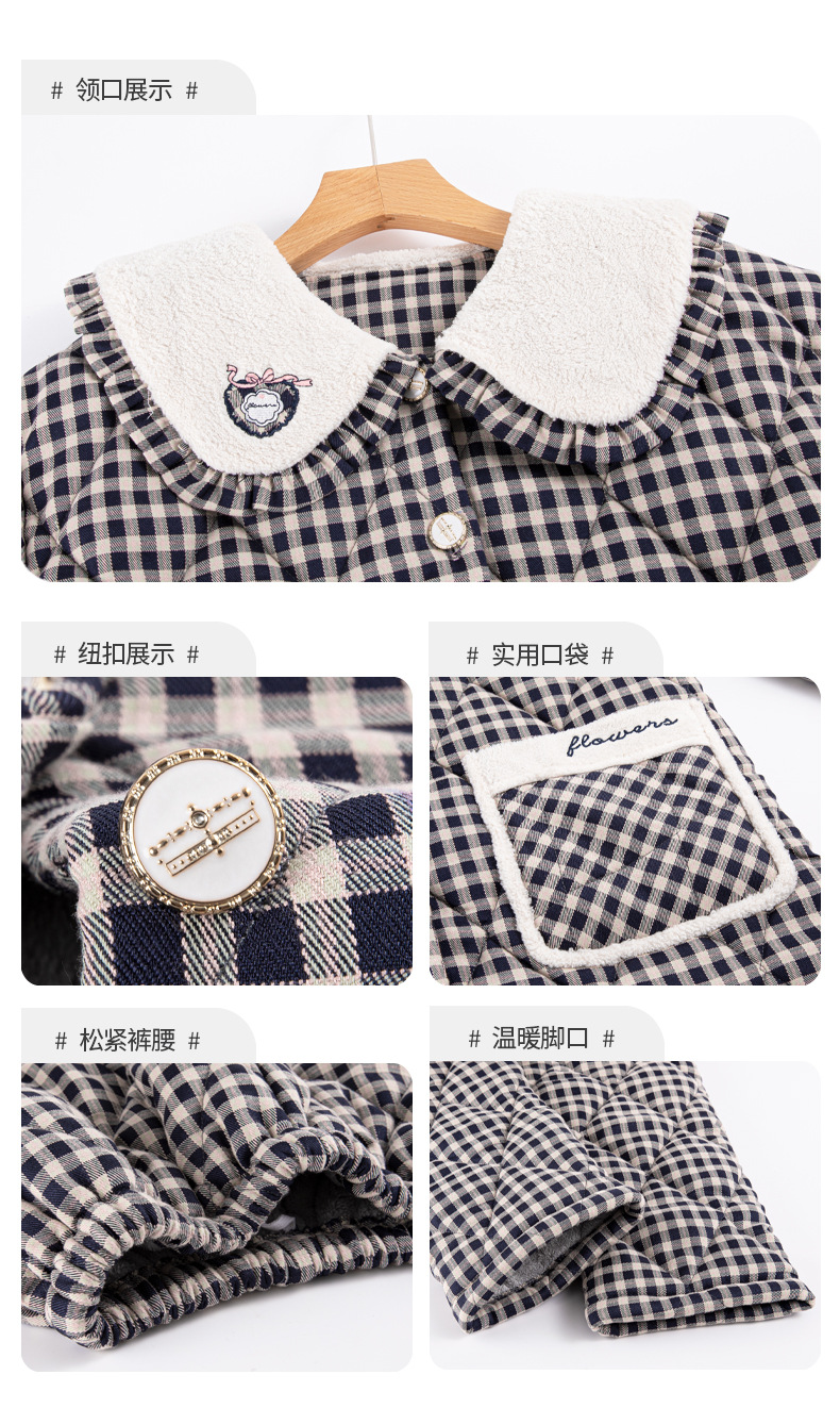 (总)洛兰沙家居馆 2025新款三层保暖女士秋冬家居服翻领长袖长裤套装简约宽松空气棉睡衣软糯,女士保暖千禧格套装-粉色,女士保暖千禧格套装-暮光蓝,女士保暖千禧格套装-奶油黄,女士保暖千禧格套装-紫色,组合图仅供展示不可下单