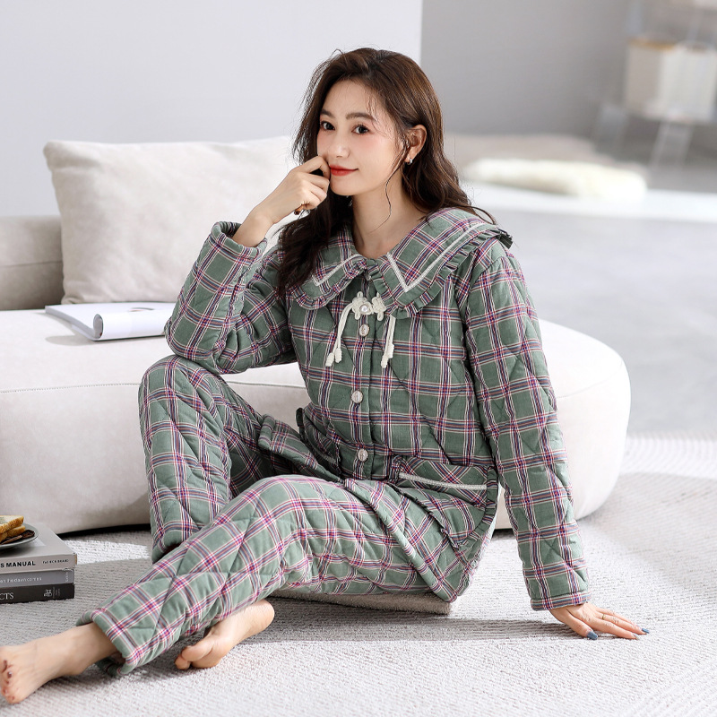 洛兰沙家居馆 2024新款清新款睡衣女秋冬季三层夹棉珊瑚绒加厚保暖两件套女士可外穿加绒家居服 绿小格
