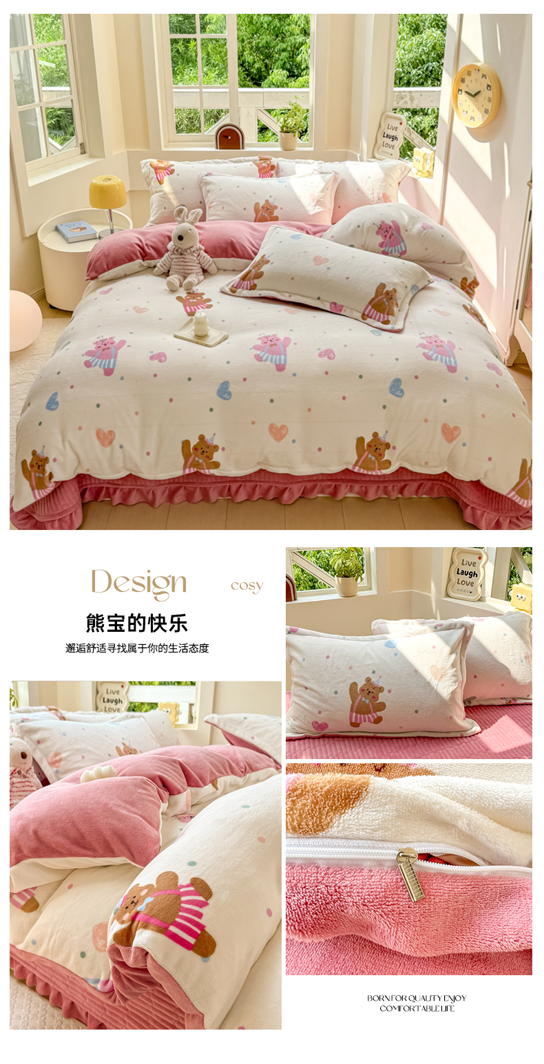 尚美 2024新款高克重印花花边牛奶绒床盖四件套 熊宝的快乐