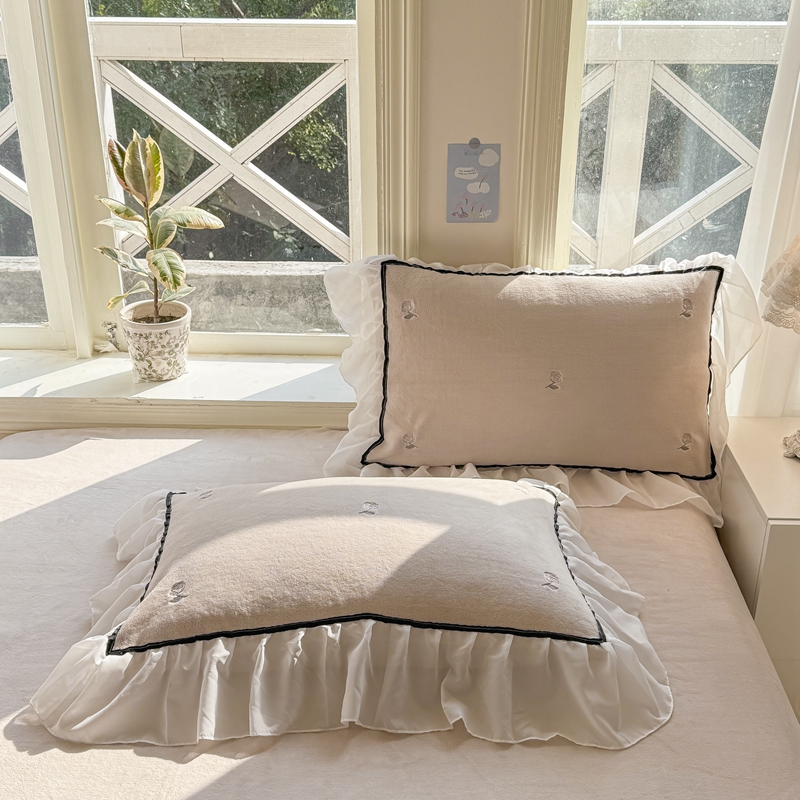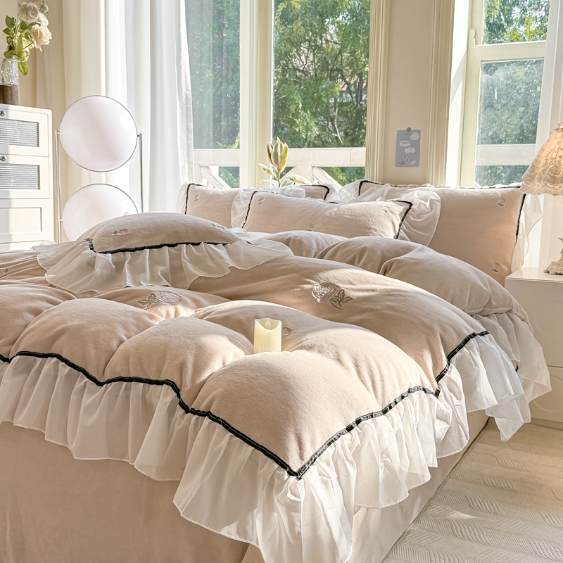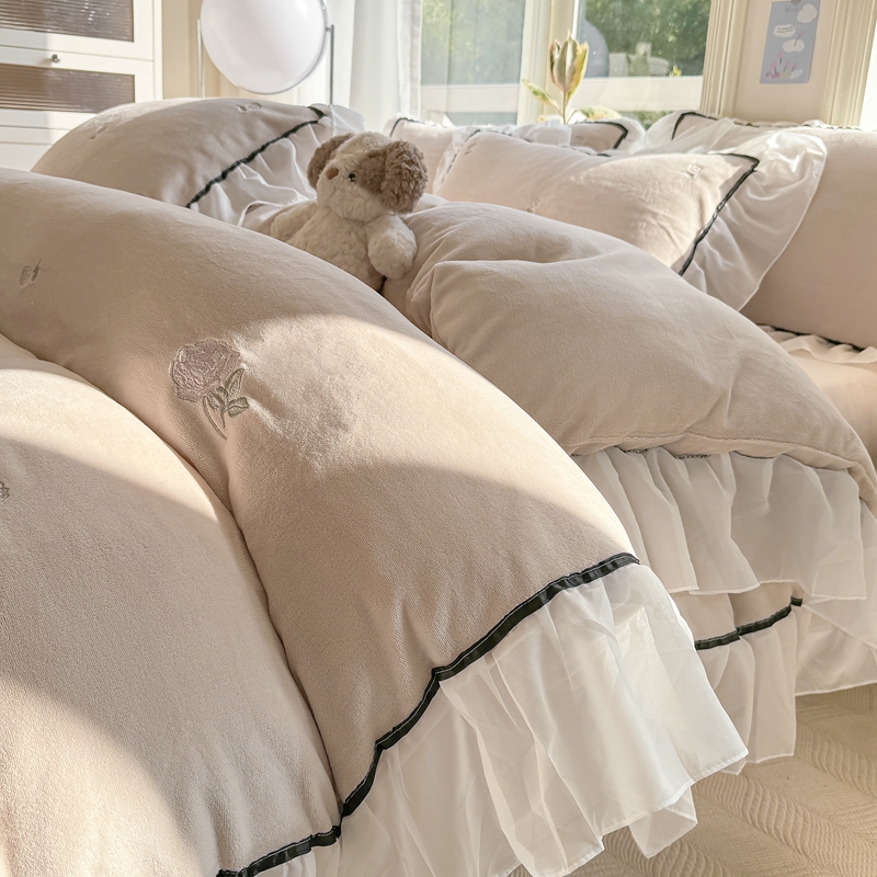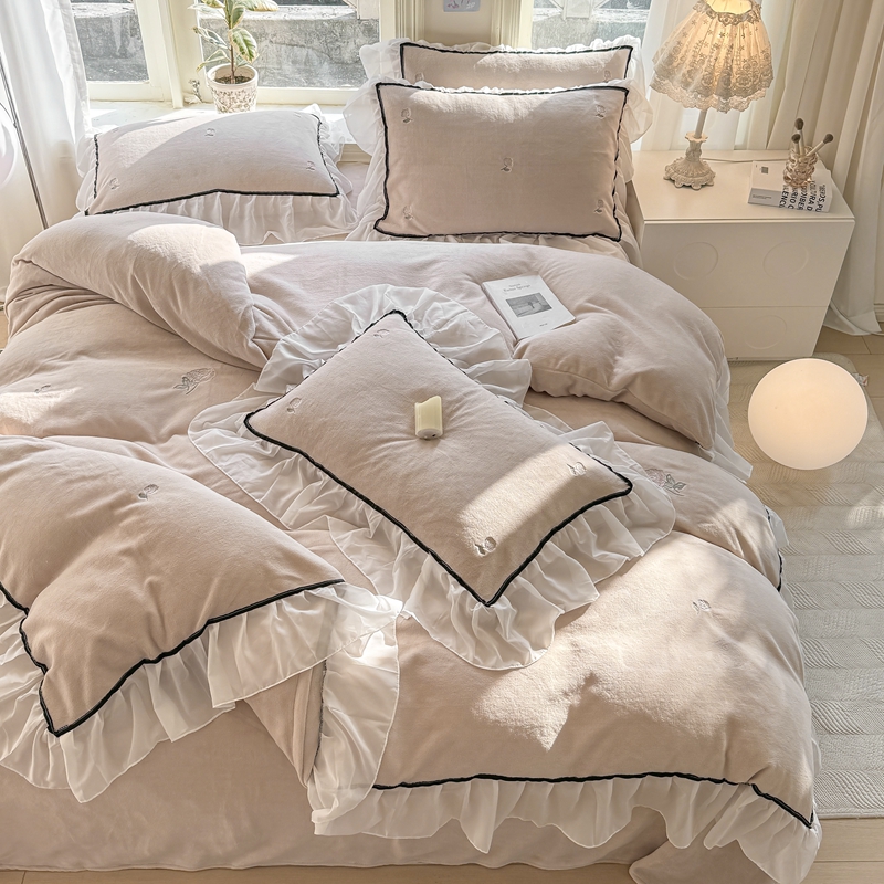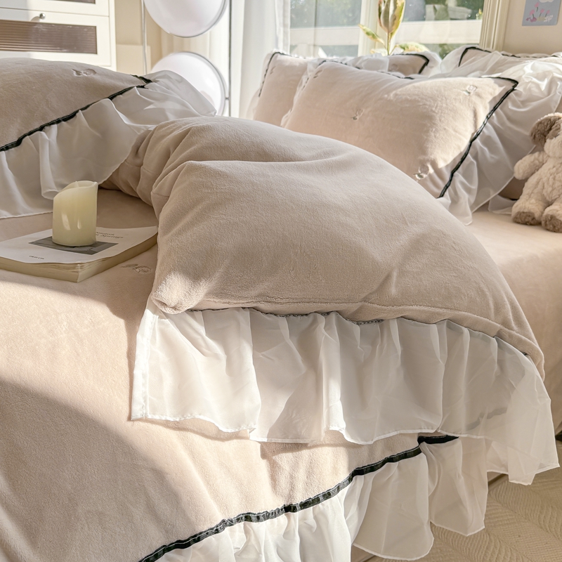 (总)二八年华 2025新款韩式花边款牛奶绒四件套,天蓝,豆沙,鹅黄,粉玉,水绿,鸢紫
