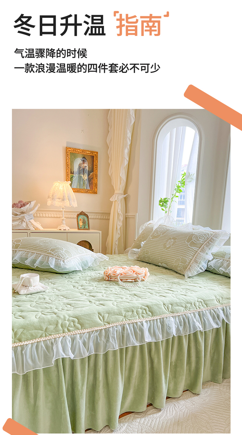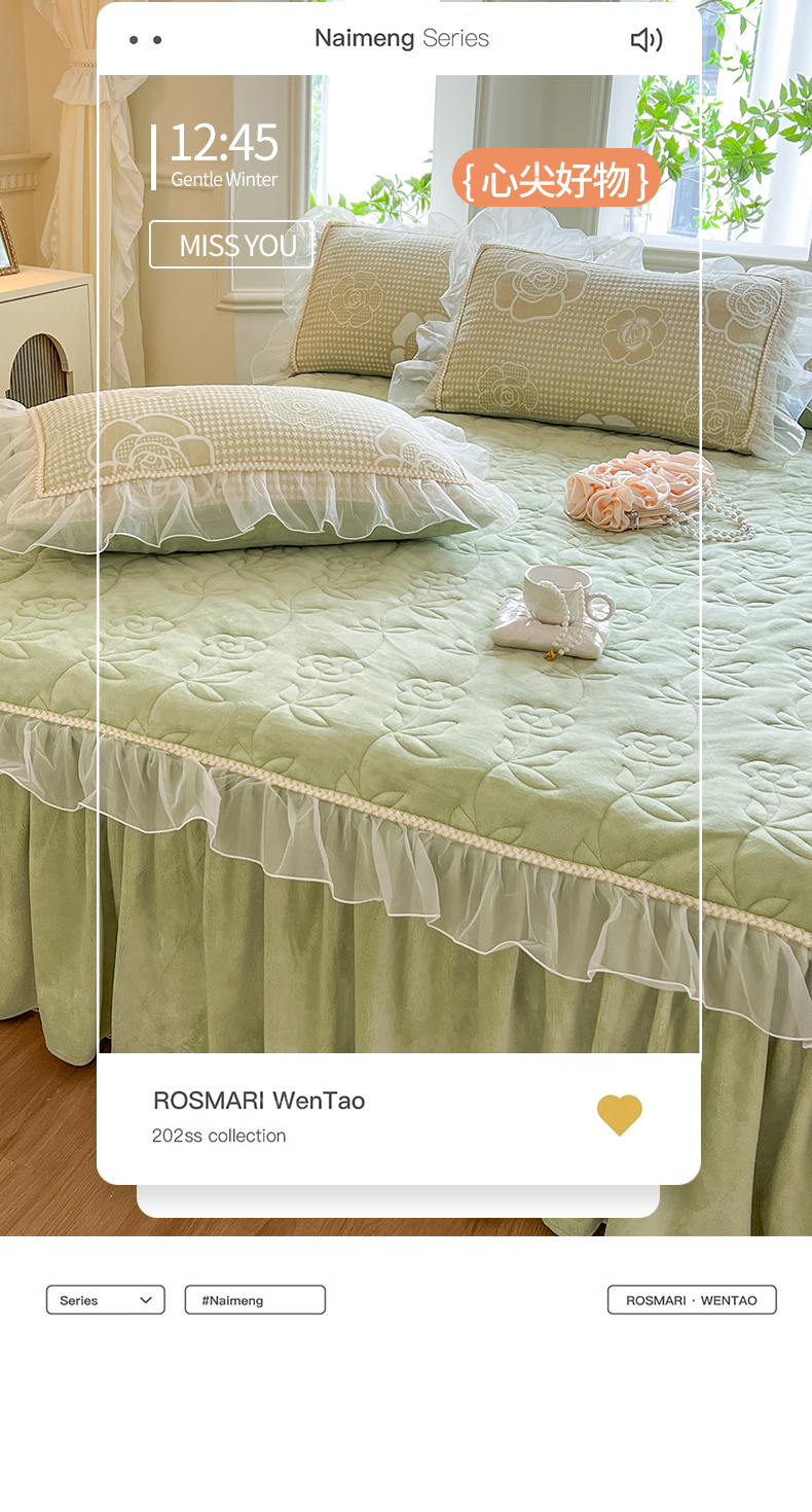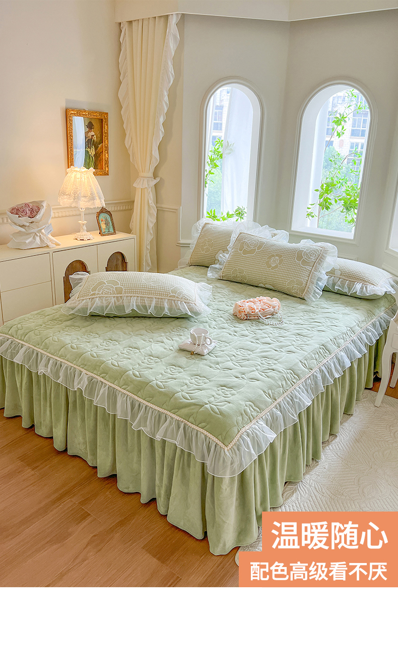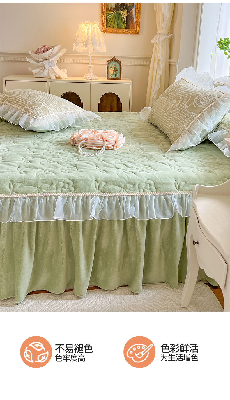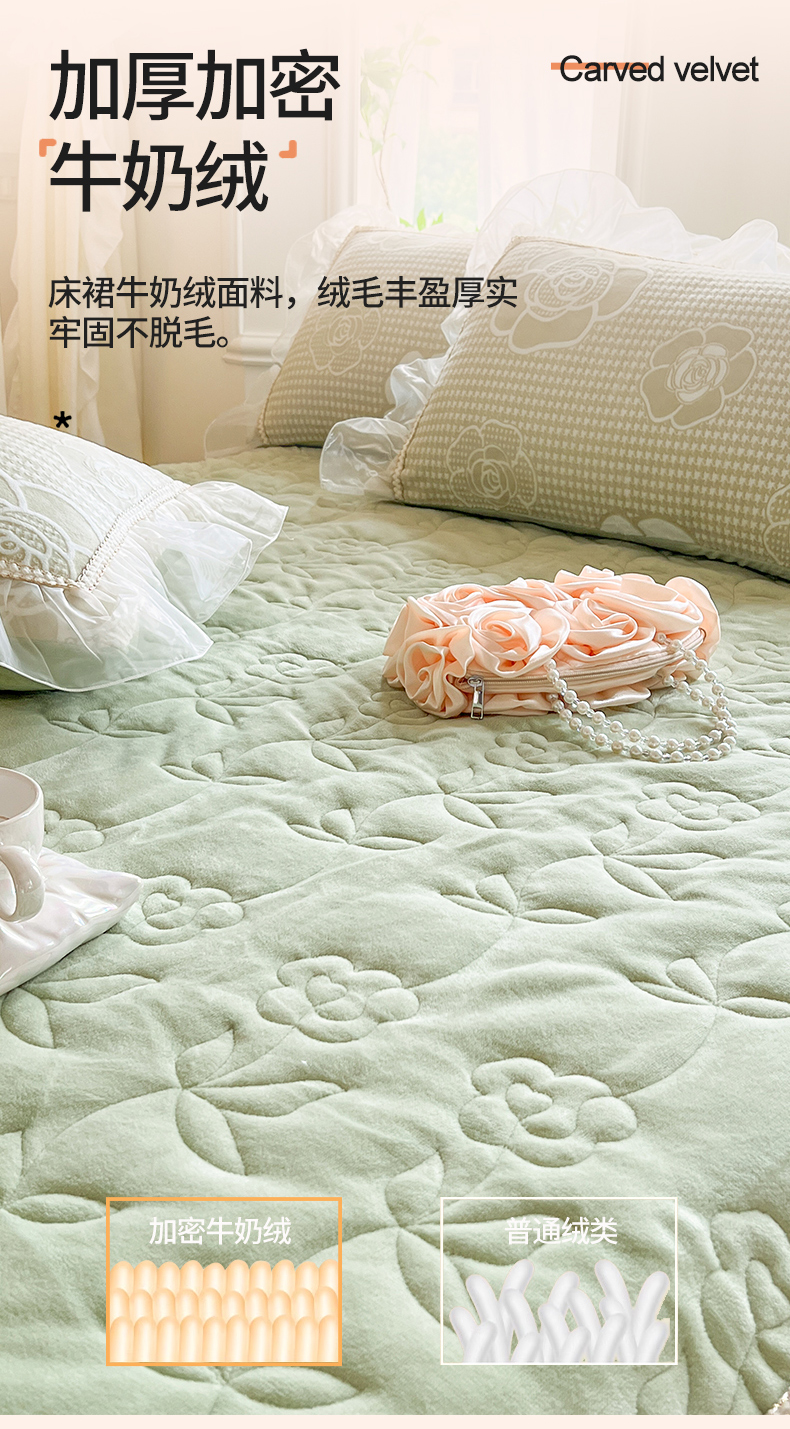商品名称:网红馆(ck家纺) 2025新款雕花绒床裙三件套-浪漫印记 浪漫印记-浅绿