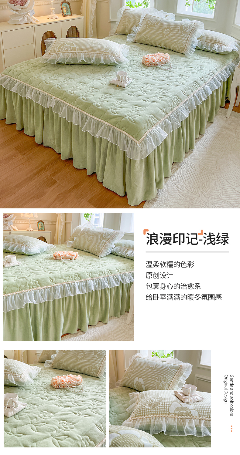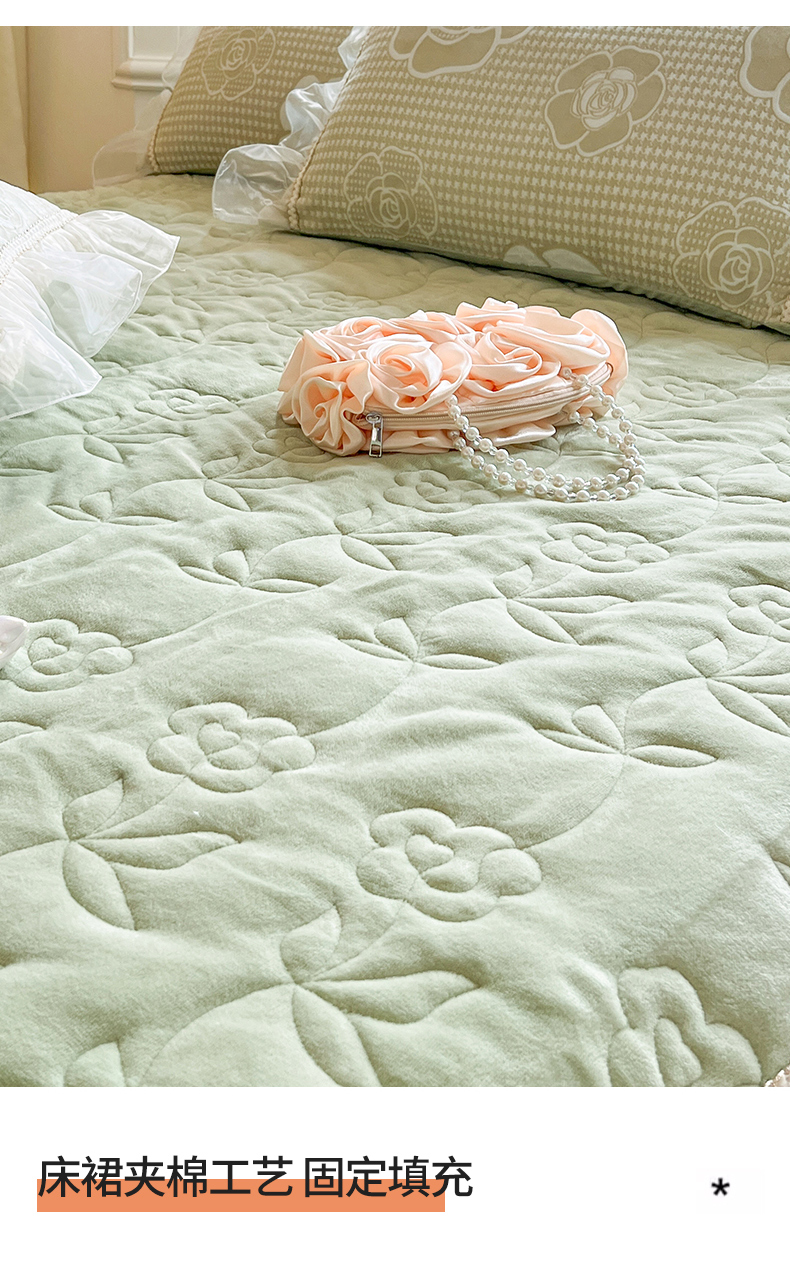 网红馆(ck家纺) 2025新款雕花绒床裙三件套-浪漫印记 浪漫印记-浅绿