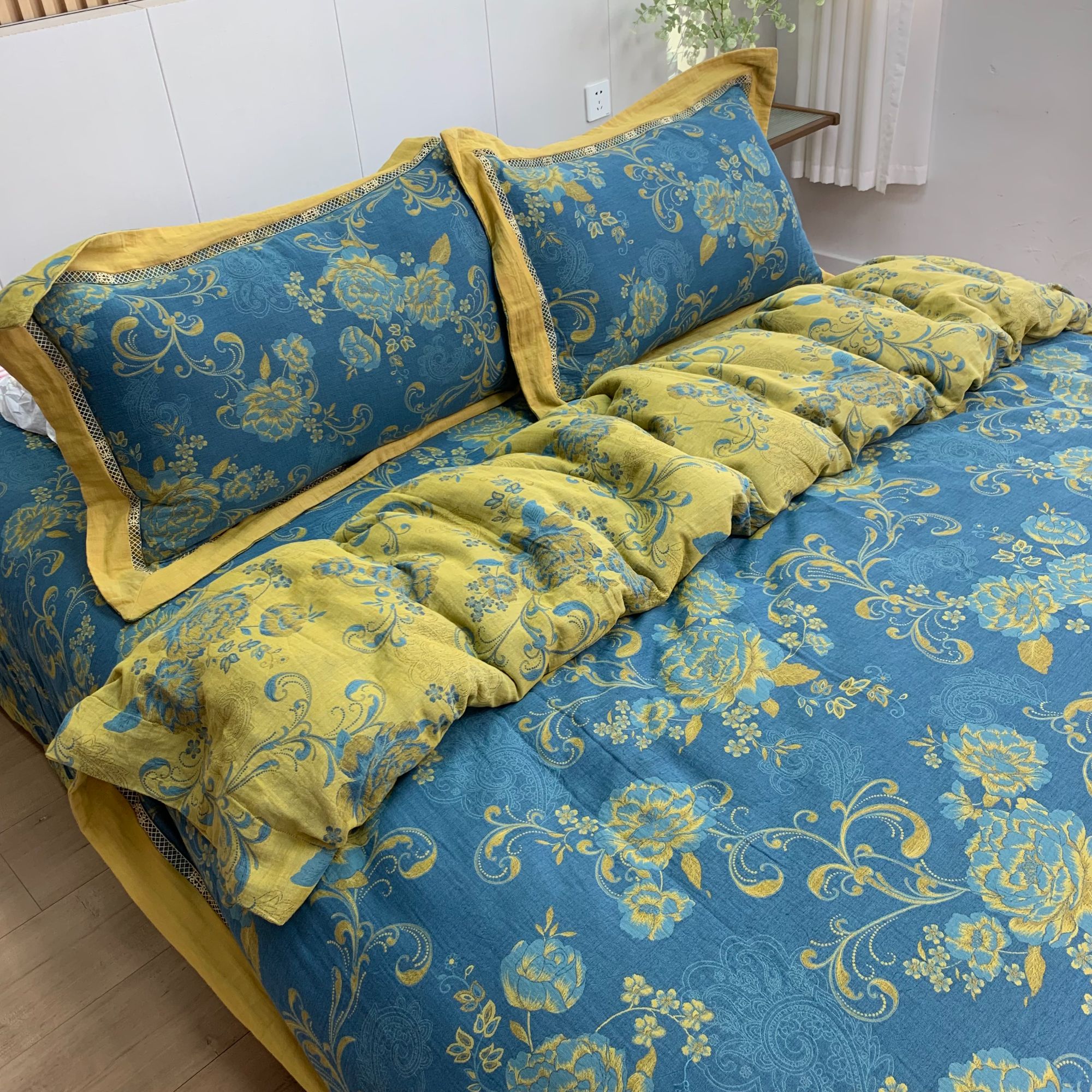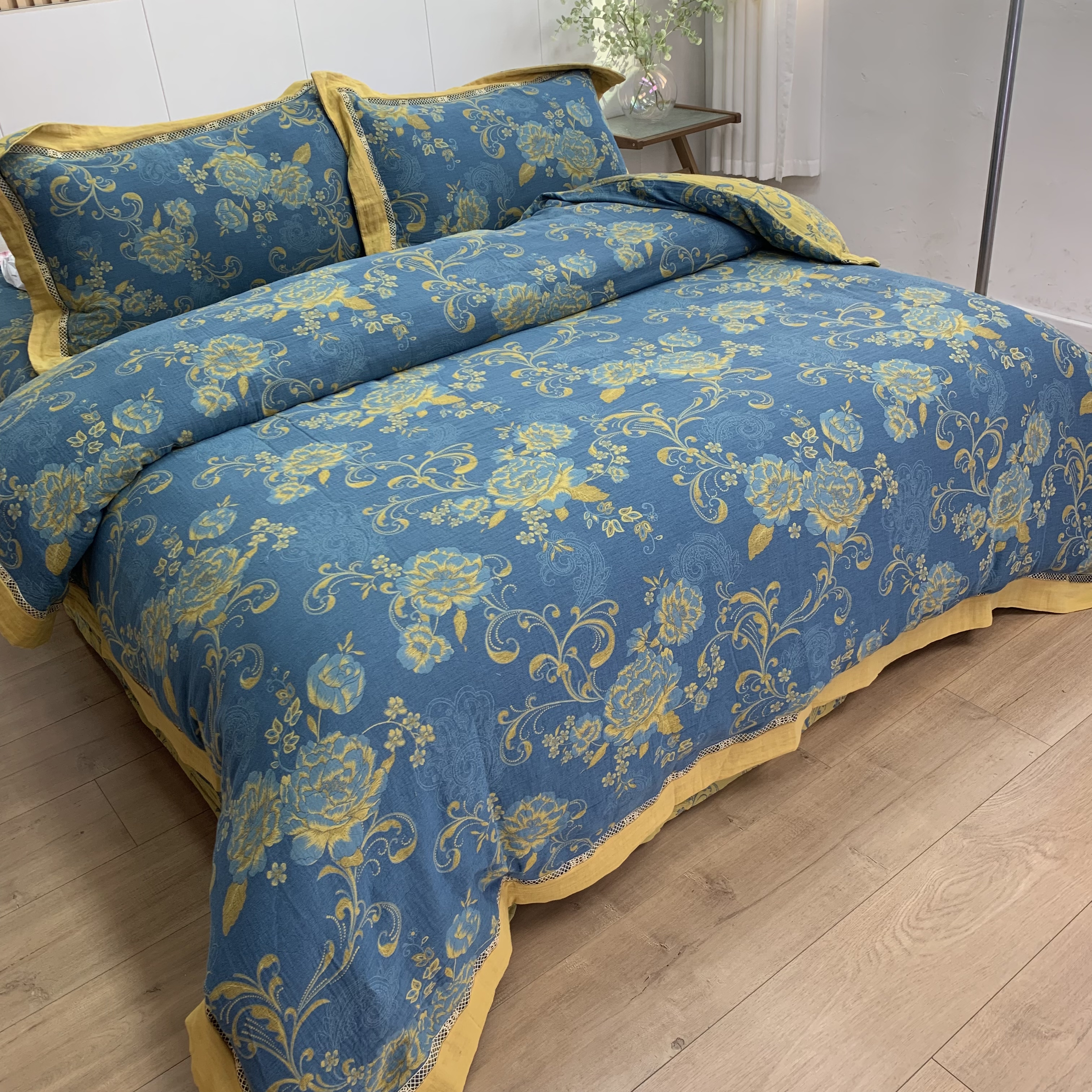 商品名称:鲁爱 2025新款全棉色织双层纱新款镂空四件套 陌上花开-深蓝