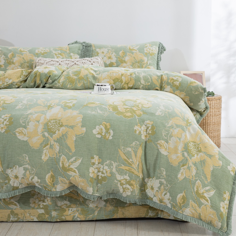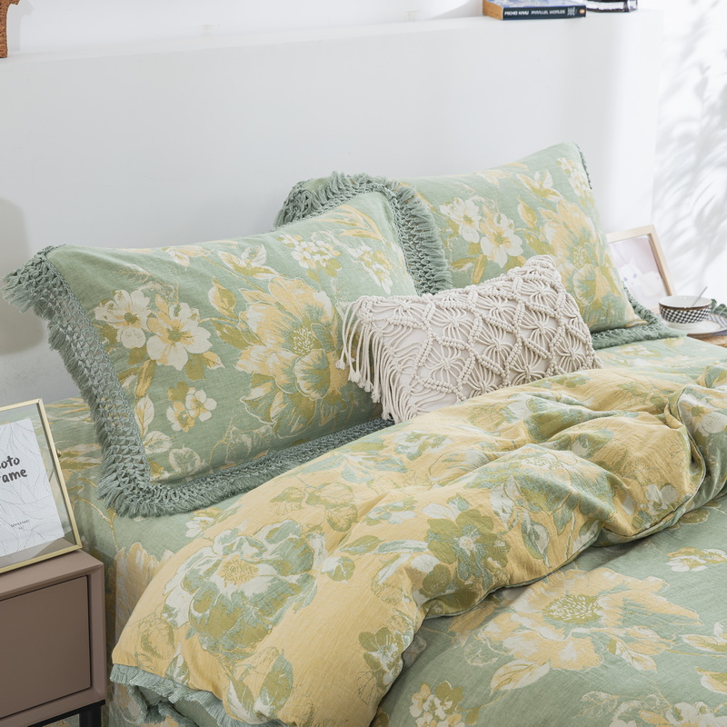 商品名称:鲁爱 2025新款全棉双层纱流苏花边四件套 寻芳-绿
