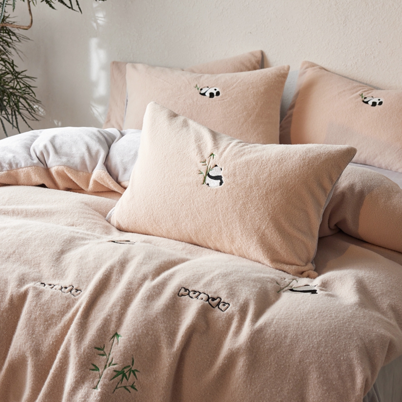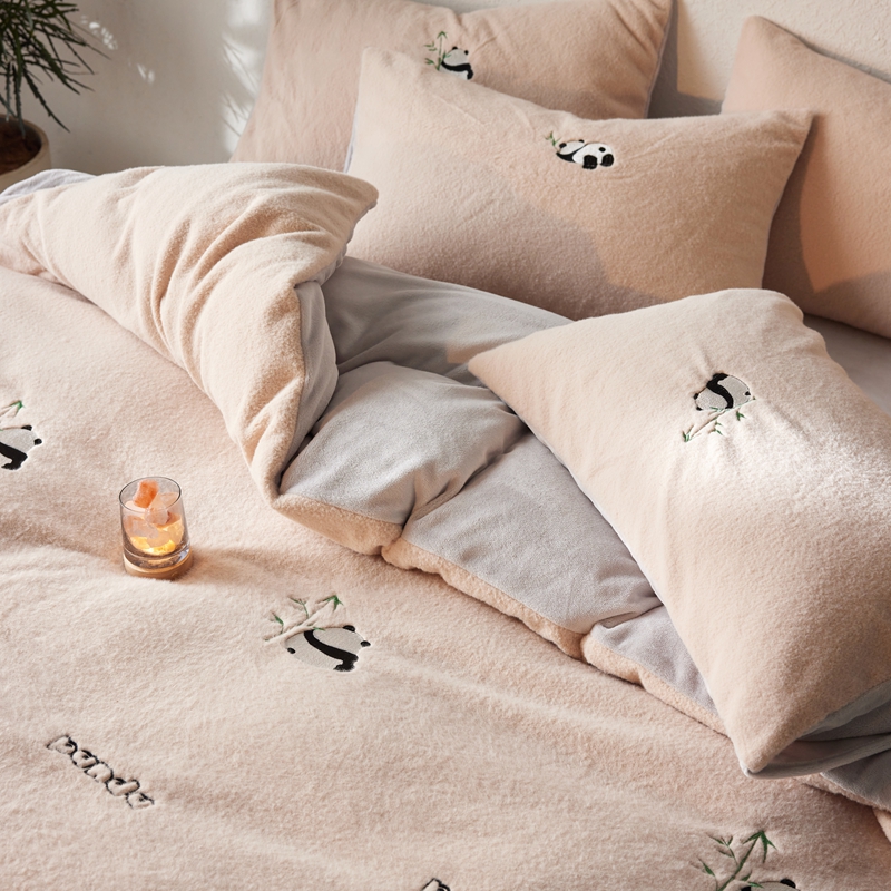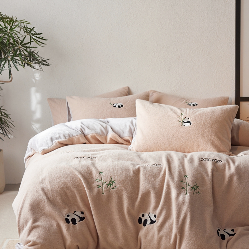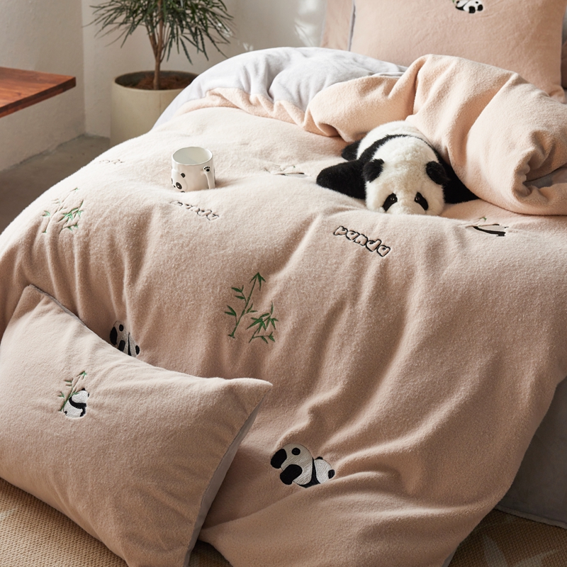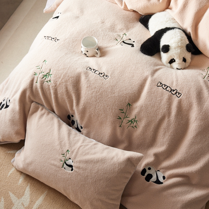 商品名称:初拾 2024新款300g暖羊绒绣花四件套-熊猫噗噗 熊猫噗噗-粉咖