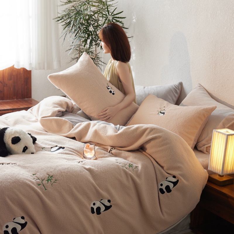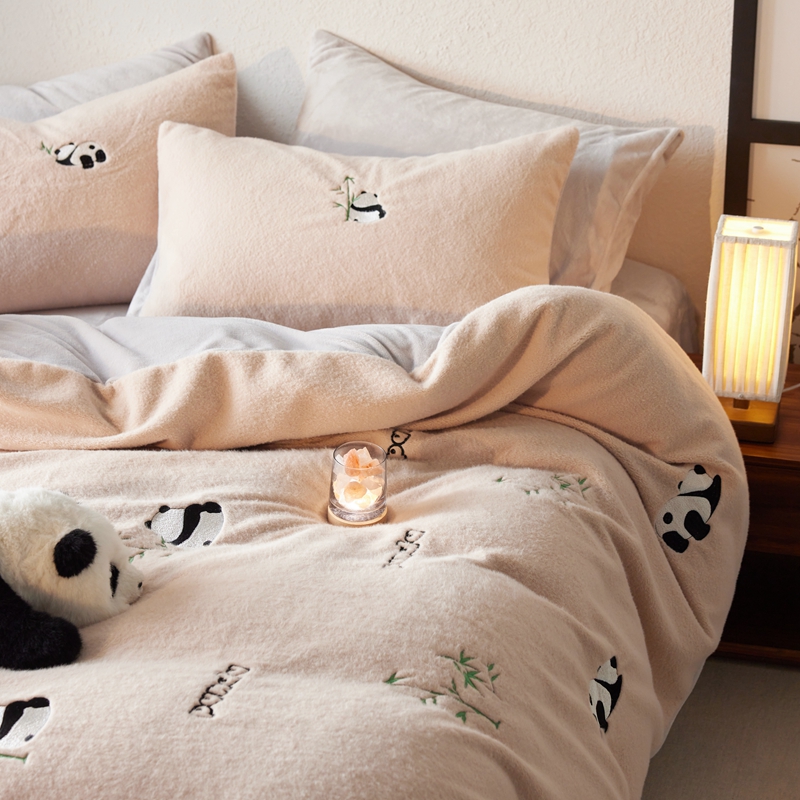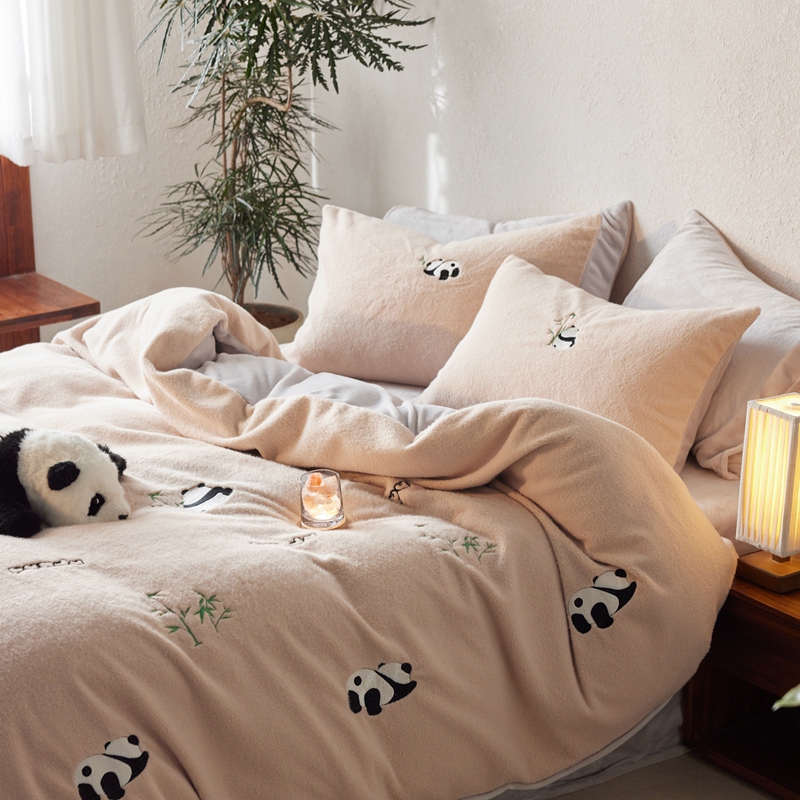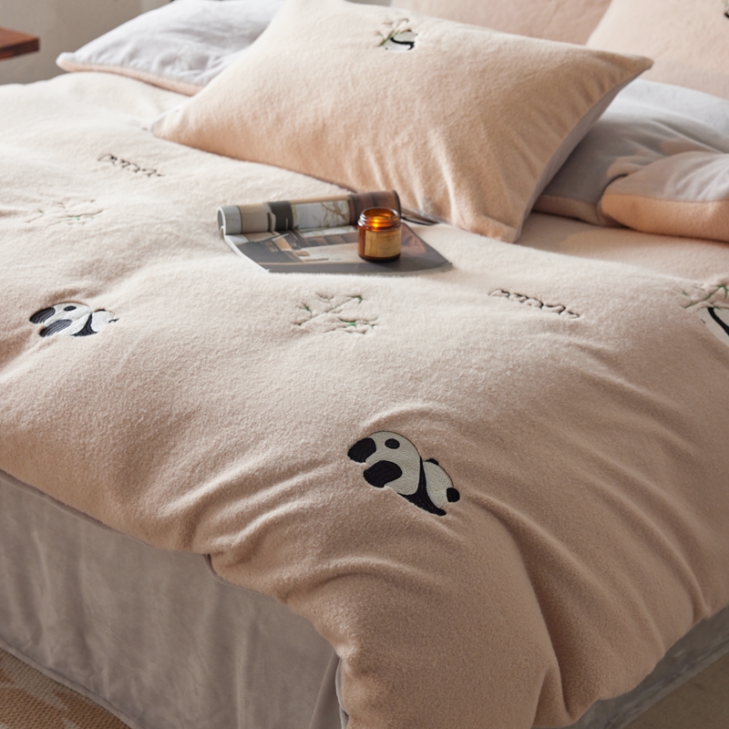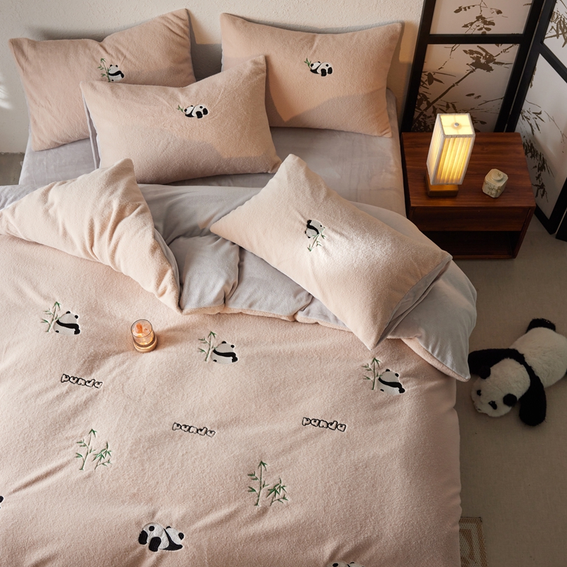商品名称:初拾 2024新款300g暖羊绒绣花四件套-熊猫噗噗 熊猫噗噗-粉咖