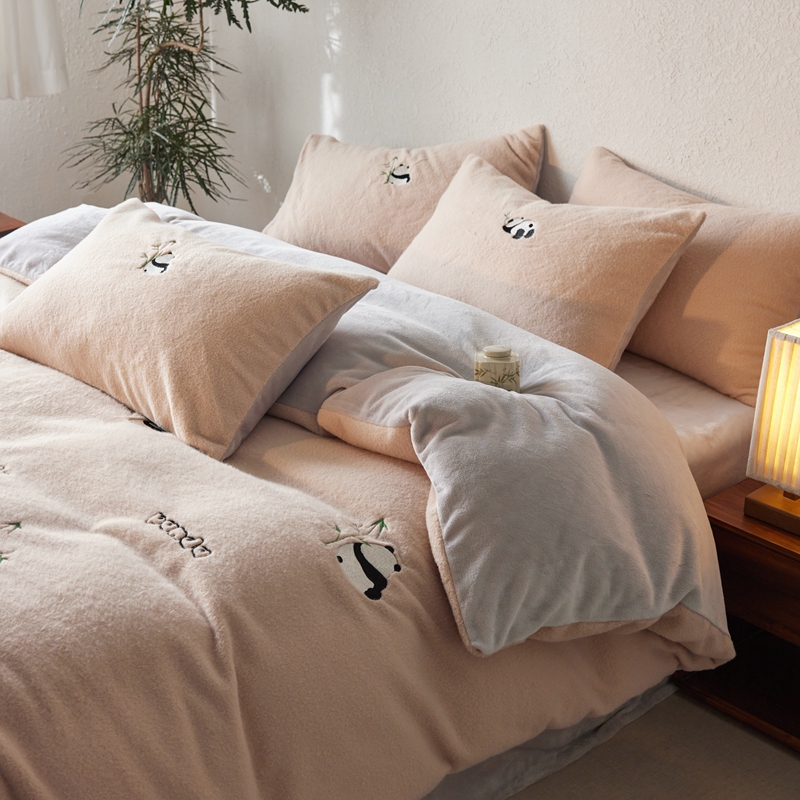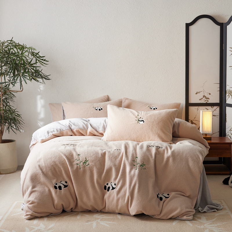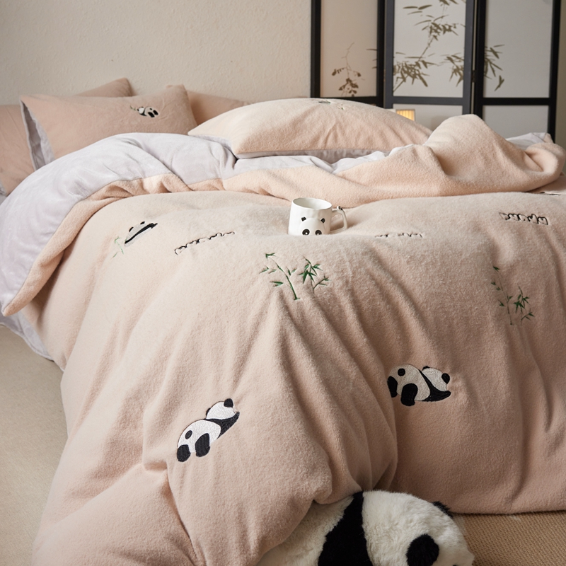 初拾 2024新款300g暖羊绒绣花四件套-熊猫噗噗 熊猫噗噗-粉咖