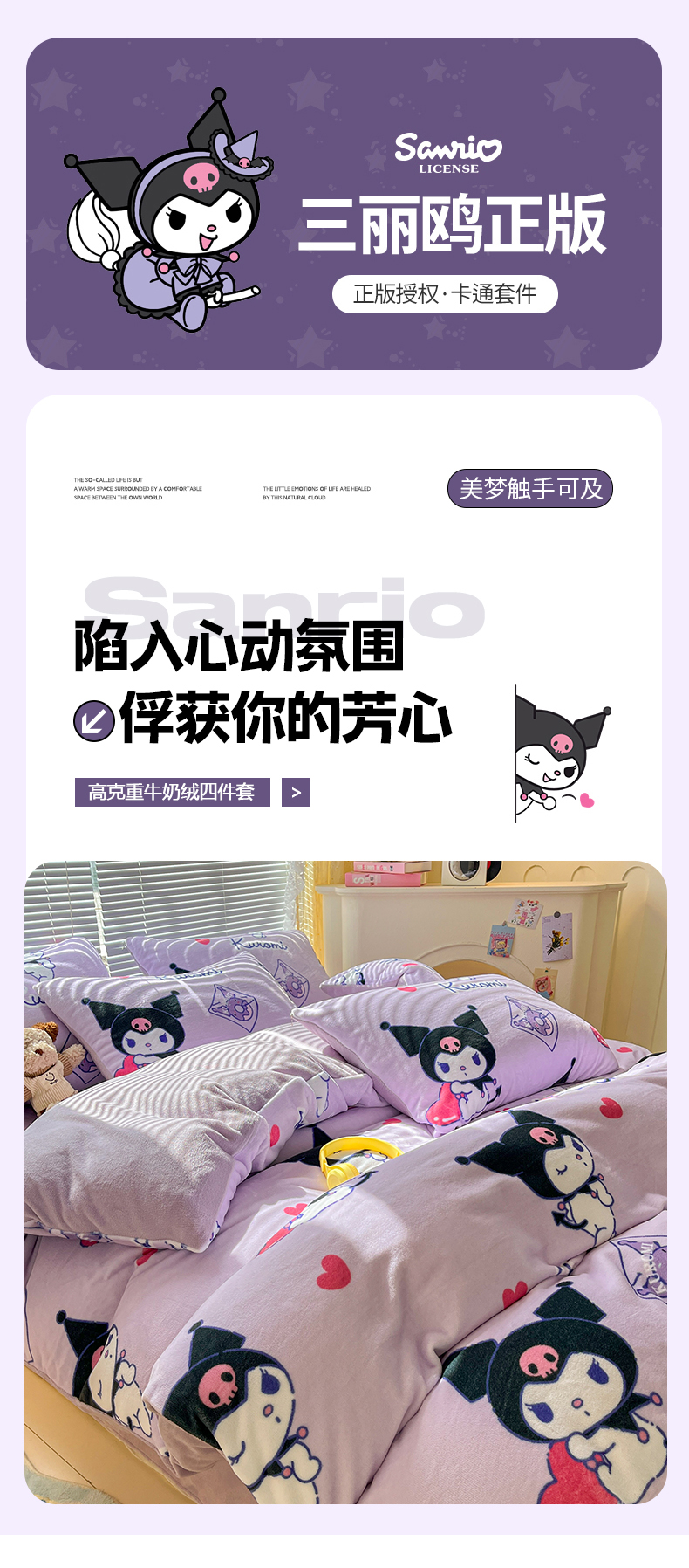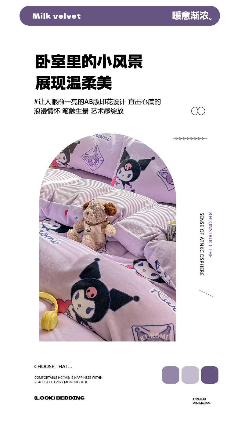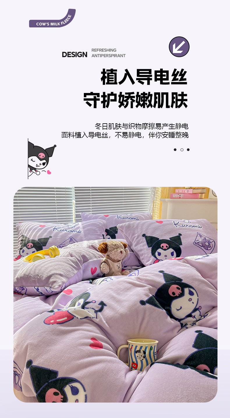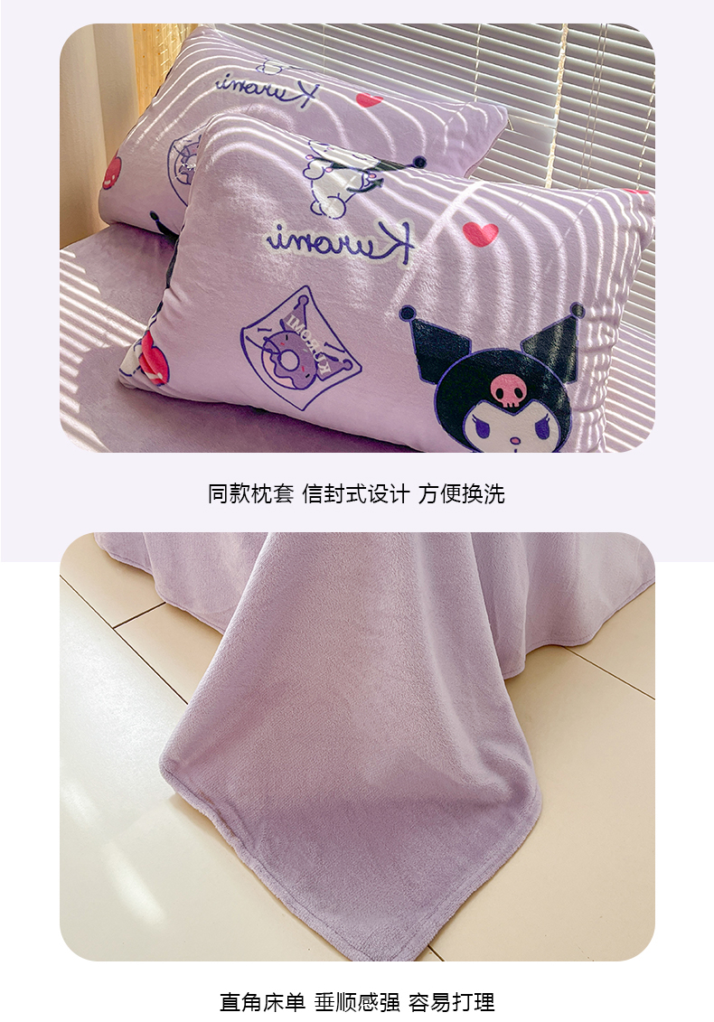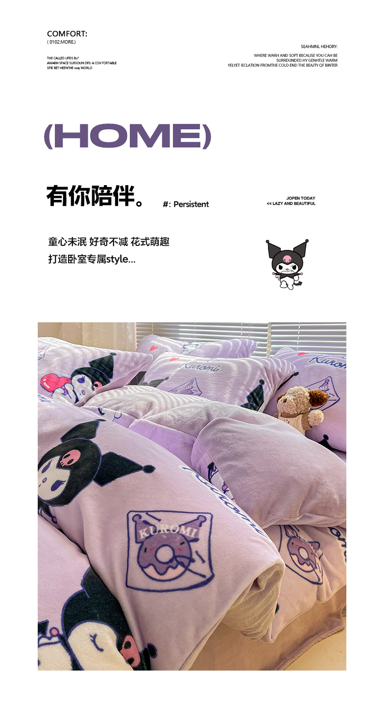 当前位置: 91家纺网 > 商品网购 > 床品套件 > 四件套 > 牛奶绒四件套 > 美澳家纺 2024新款200克三丽鸥系列卡通印花牛奶绒单被套三四件套 巴库库洛米