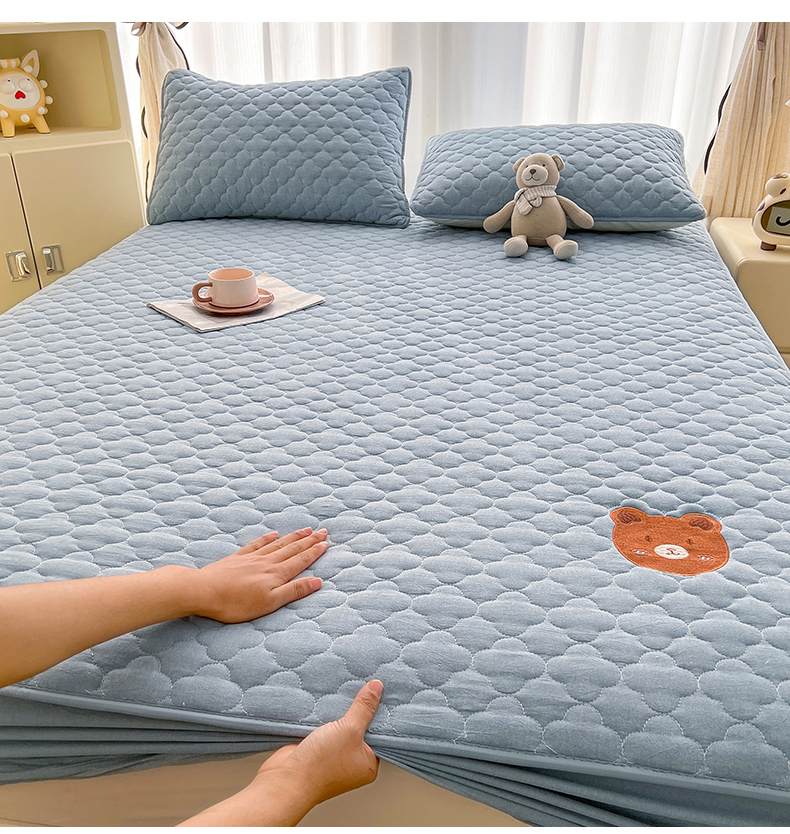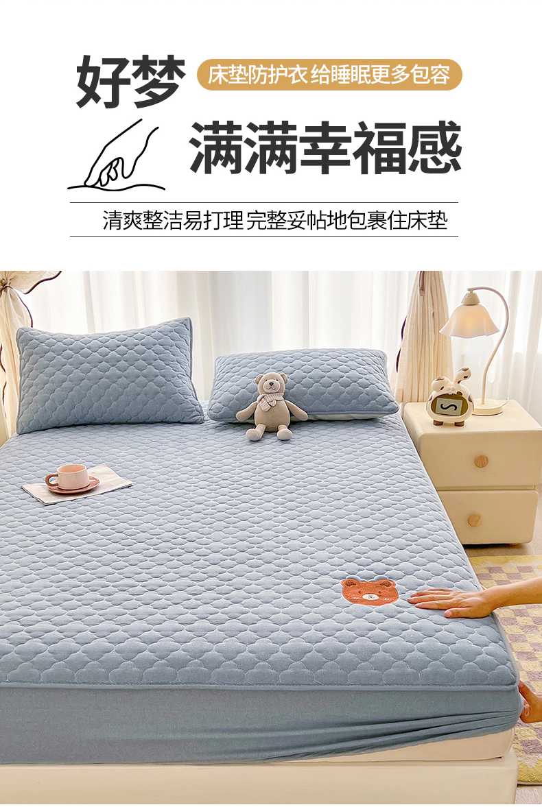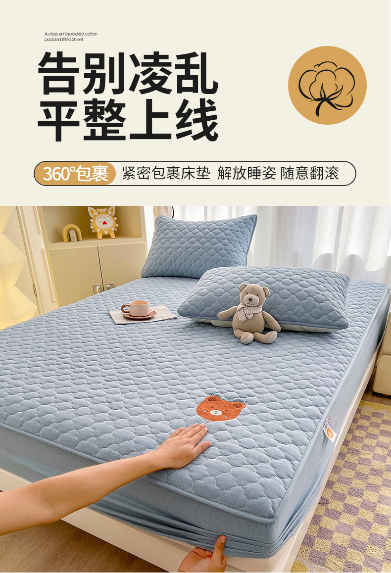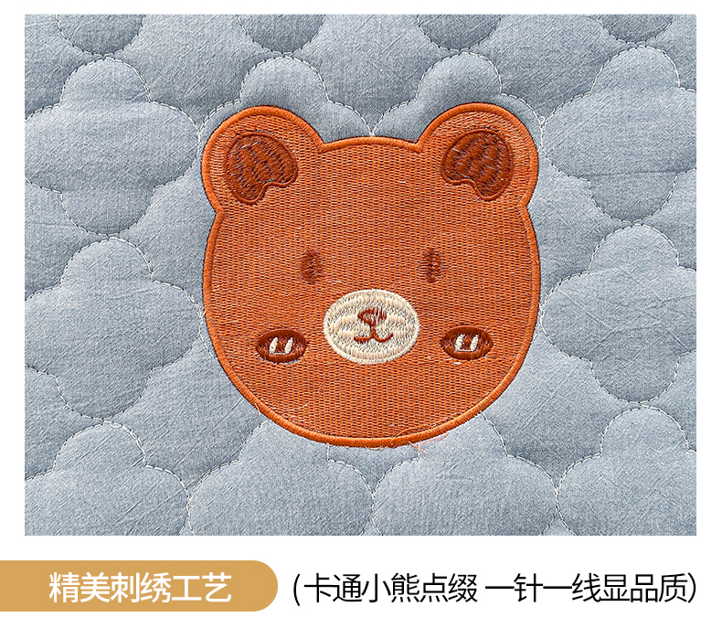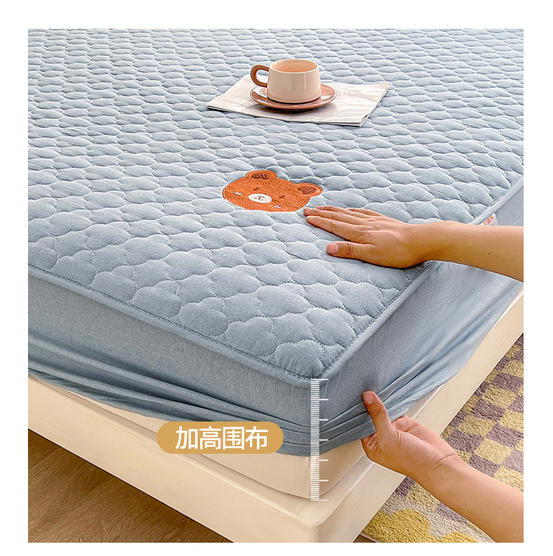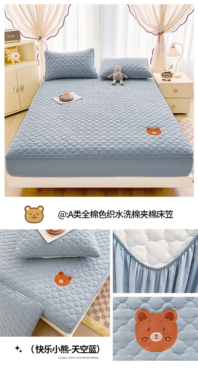 商品名称:伊人坊 2025新款全棉色织水洗棉夹棉床笠床垫保护套刺绣款 快乐小熊-天空蓝