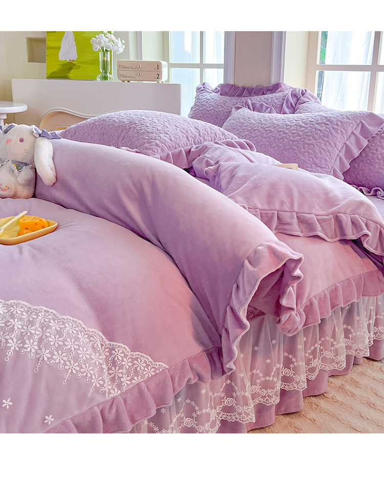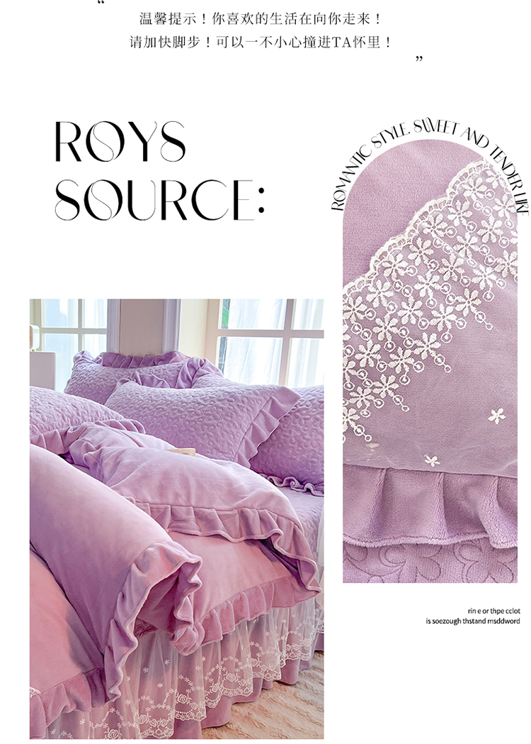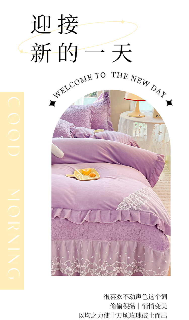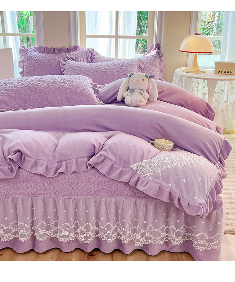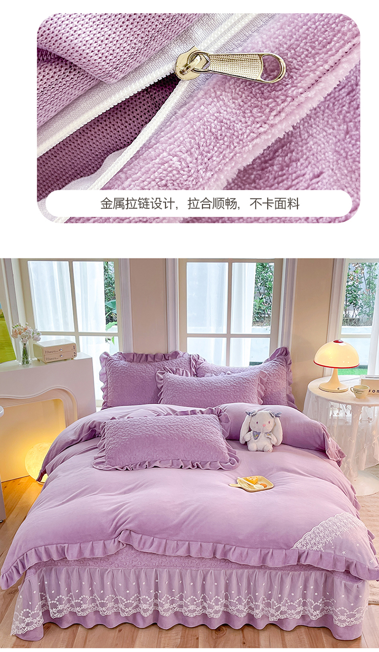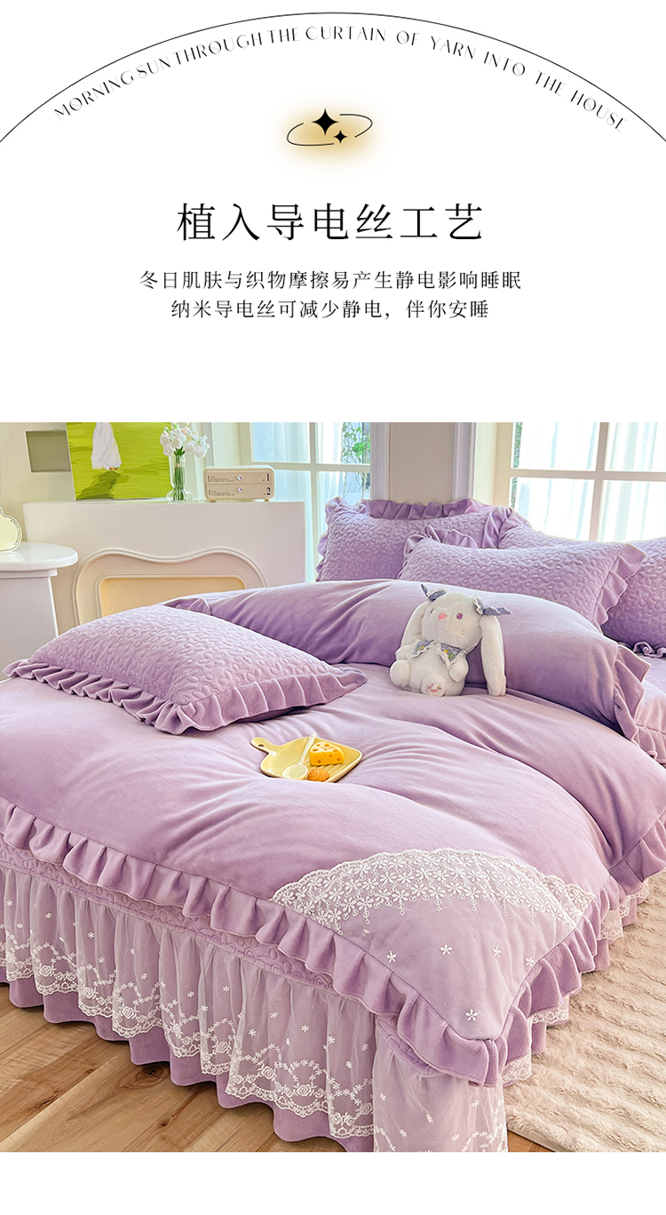 商品名称:2025秋冬新款220g全消光牛奶绒床盖四件套12斤重加厚婴儿绒法莱绒床裙款床盖款四件套 浪漫花语—梦幻紫