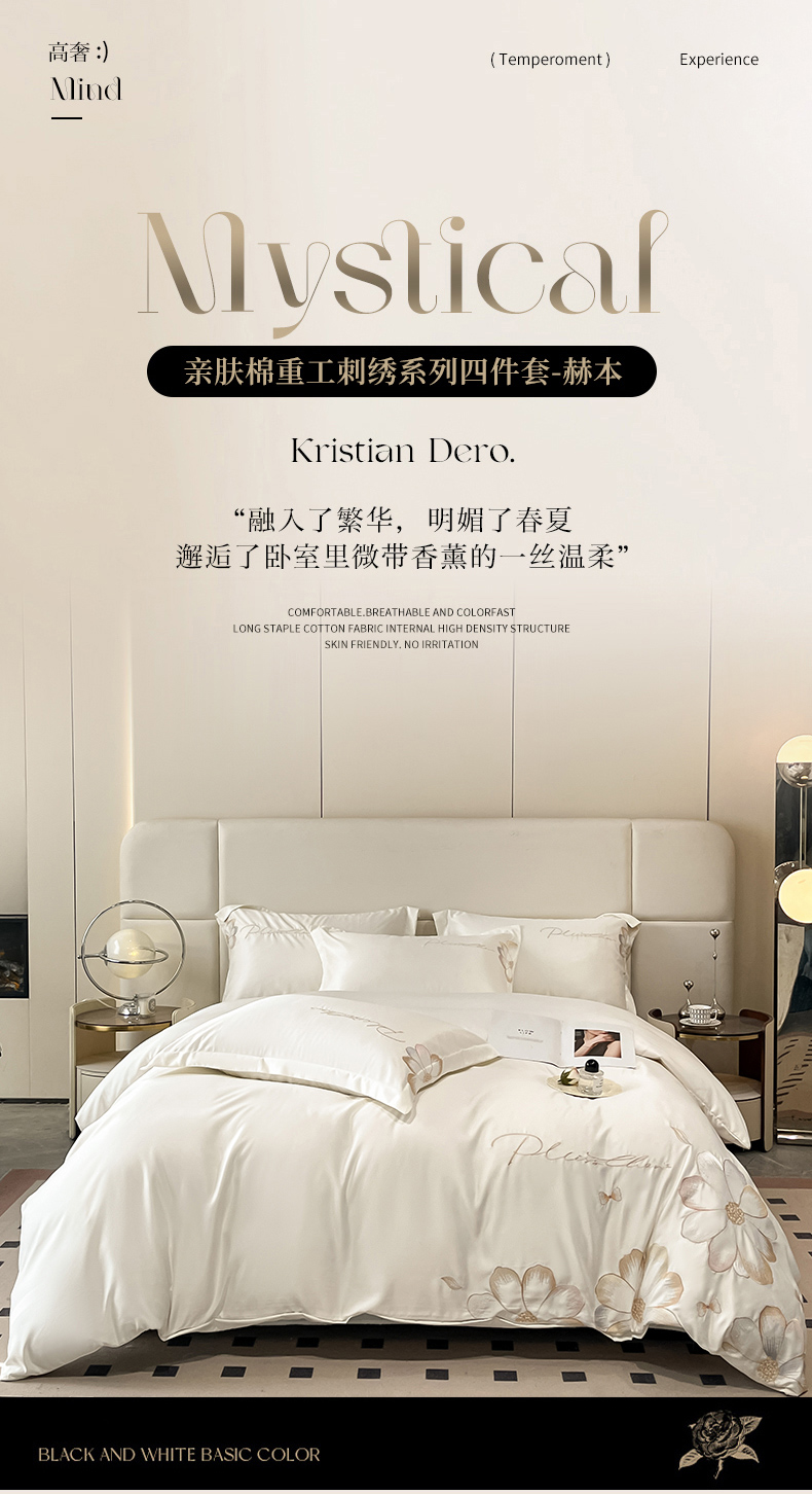 金牛座家纺 2025新款重工刺绣亲肤棉四件套-赫本系列 赫本-奶白