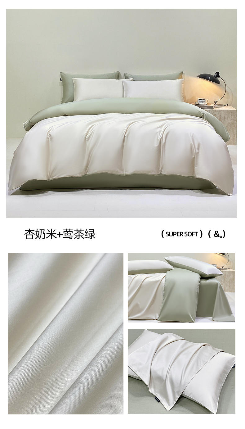 商品名称:拼社家纺 2025新款轻奢高支贡缎长绒棉四件套全棉四件套简约纯色纯棉床上用品(买家秀) 杏奶米+莺茶绿