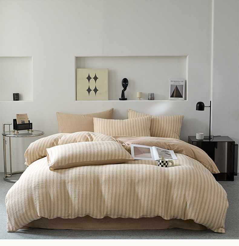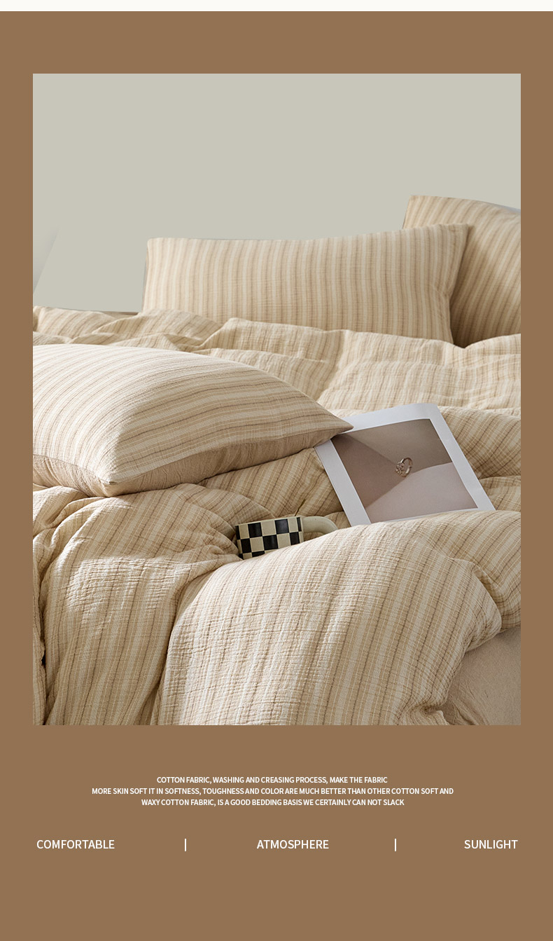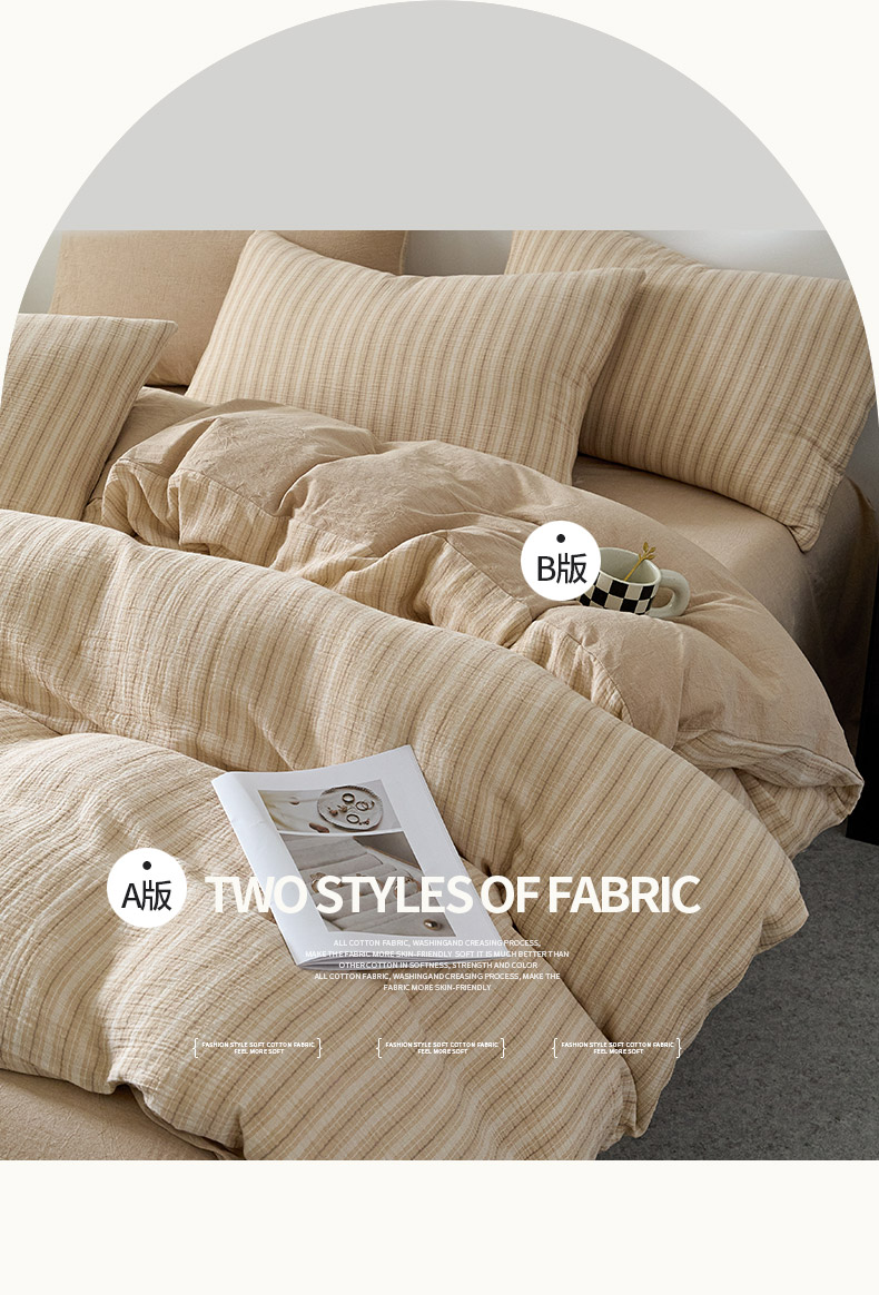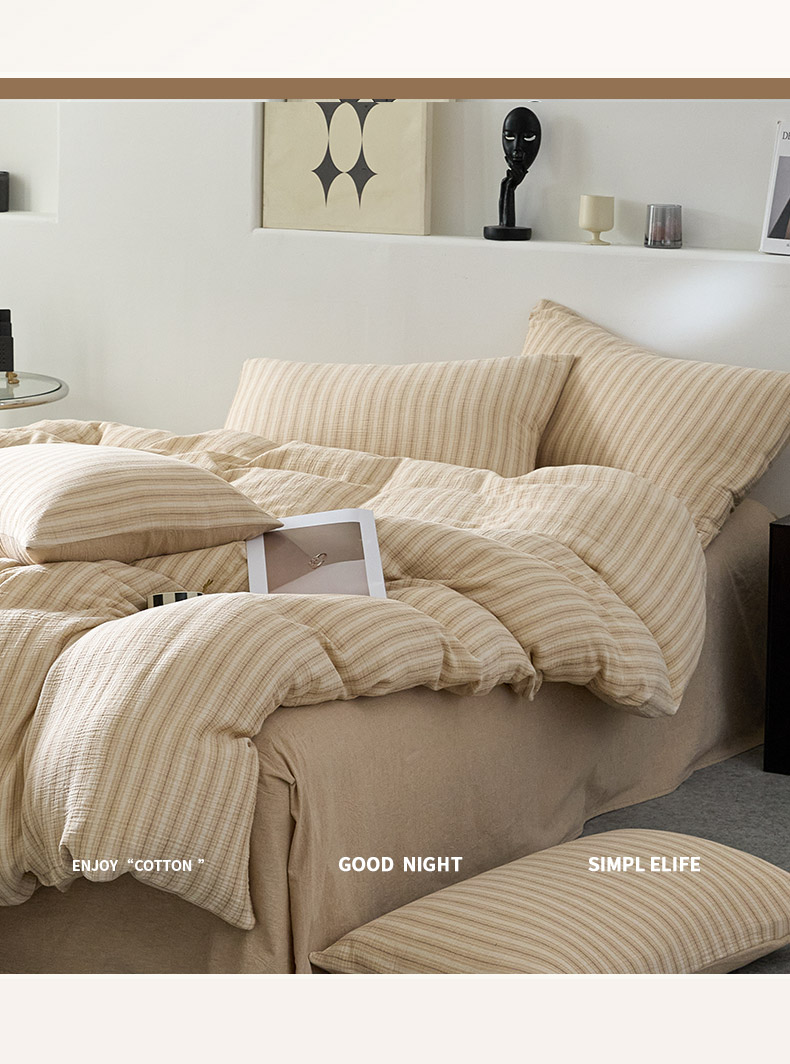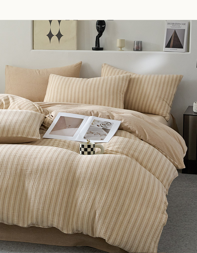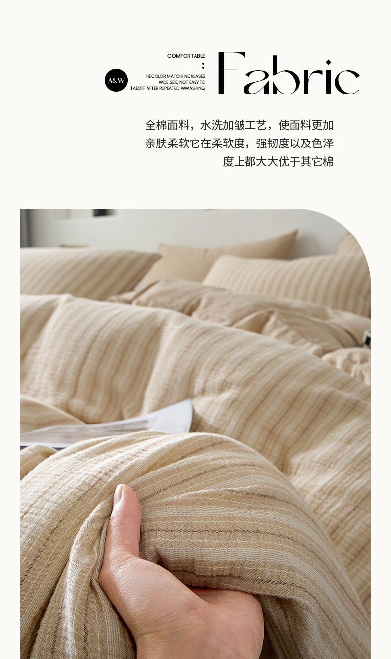 当前位置: 91家纺网 > 商品网购 > 床品套件 > 四件套 > 全棉普通四件套 > AB家纺 2025新款三层款皱皱纱条纹四件套 小半-奶茶棕