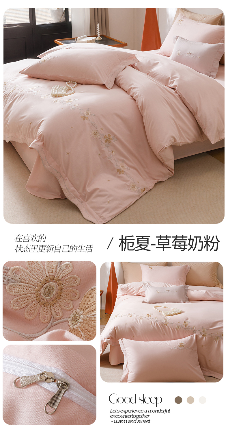 商品名称:艾莱家纺 2025新款A类水洗棉加厚绣花四件套-栀夏 栀夏-草莓奶粉