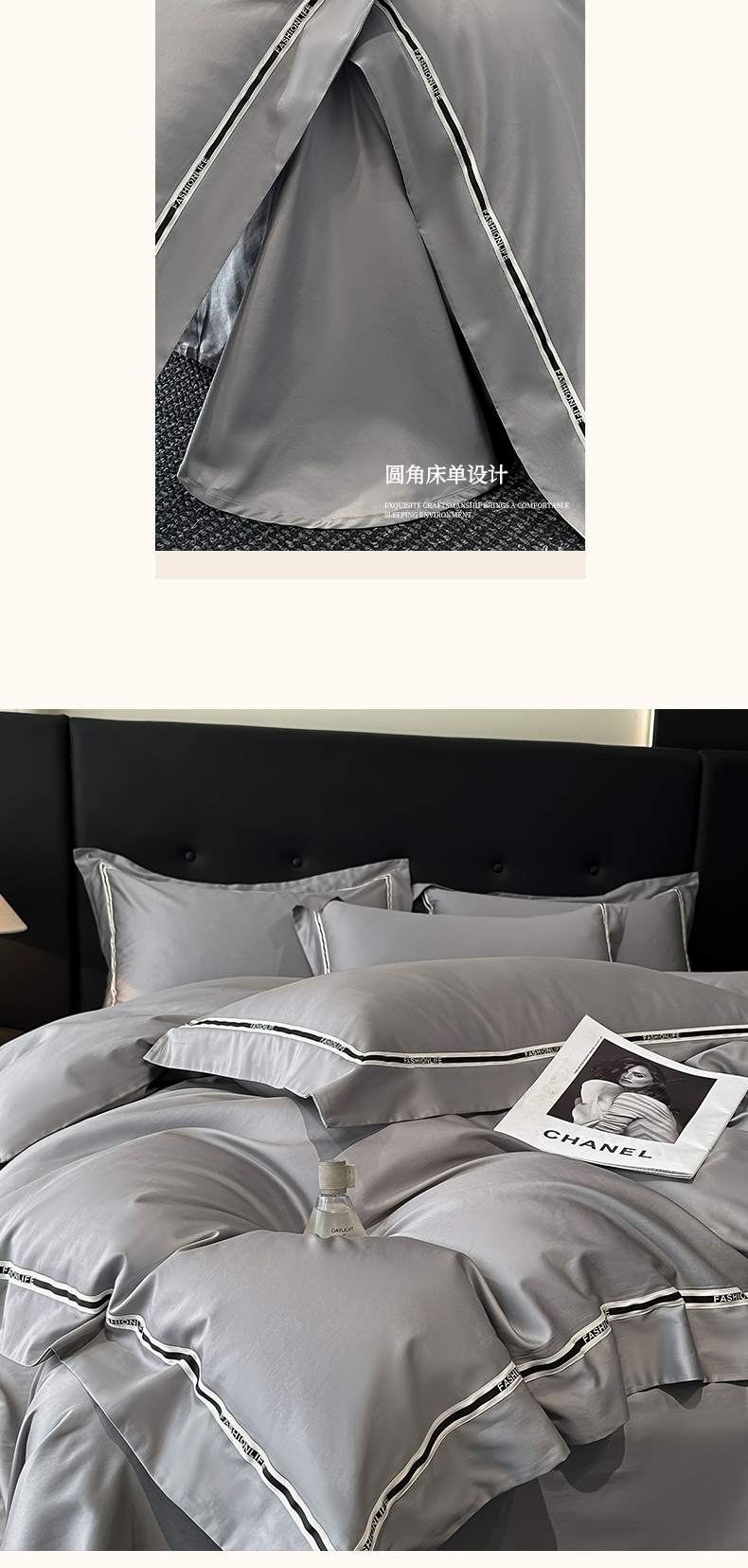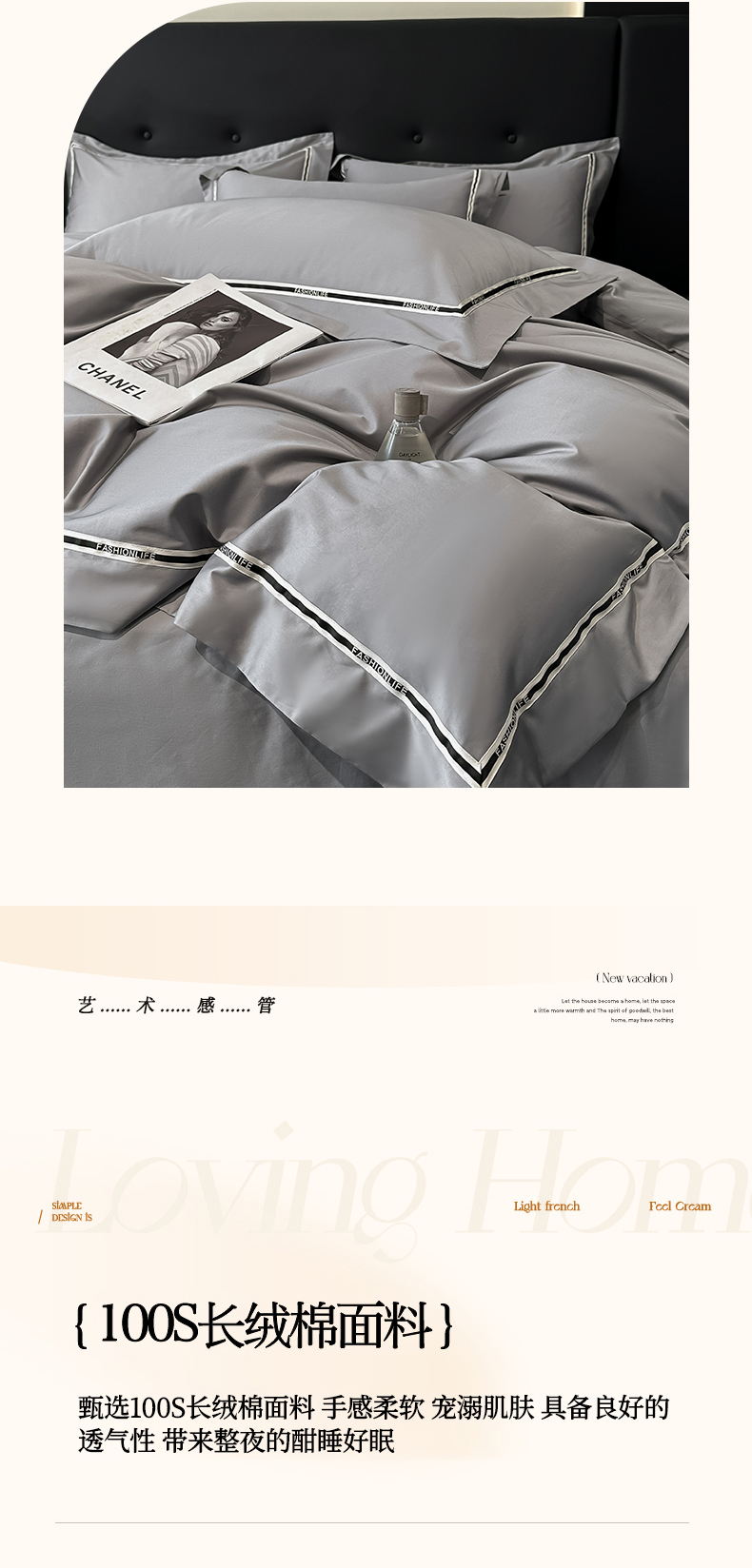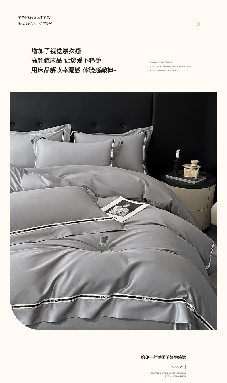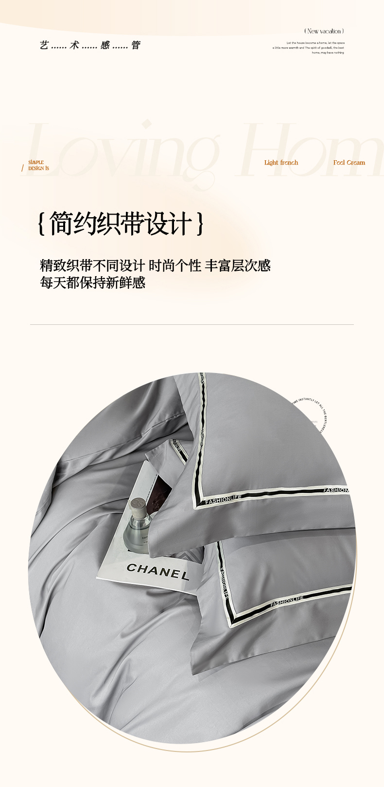 魅都 2025新款100支长绒棉简约织带轻奢风四件套-罗伊 浅灰