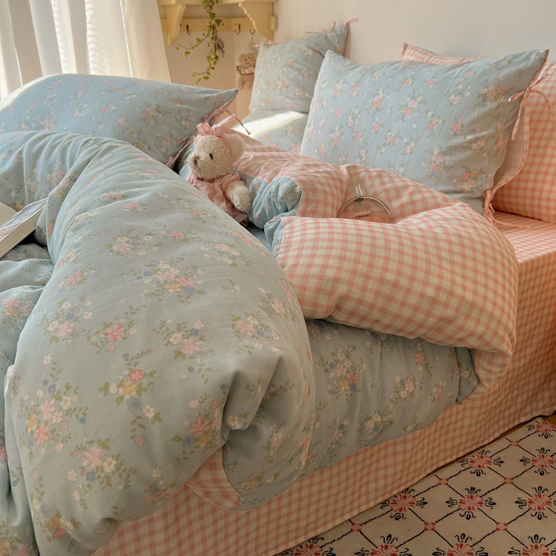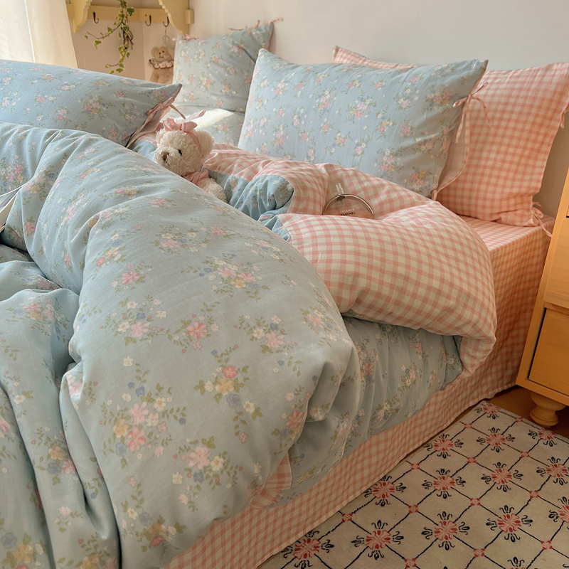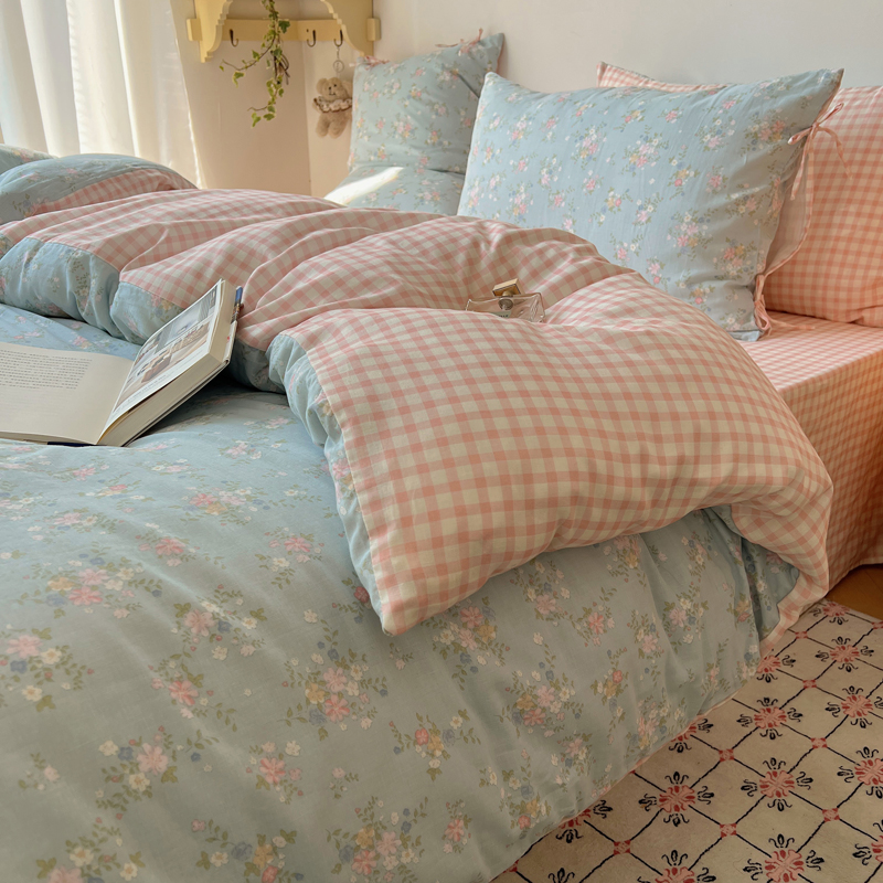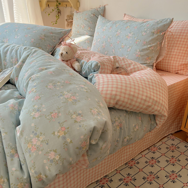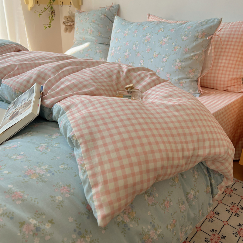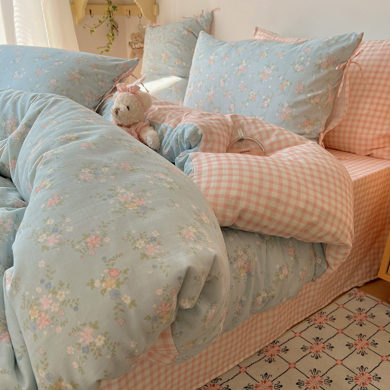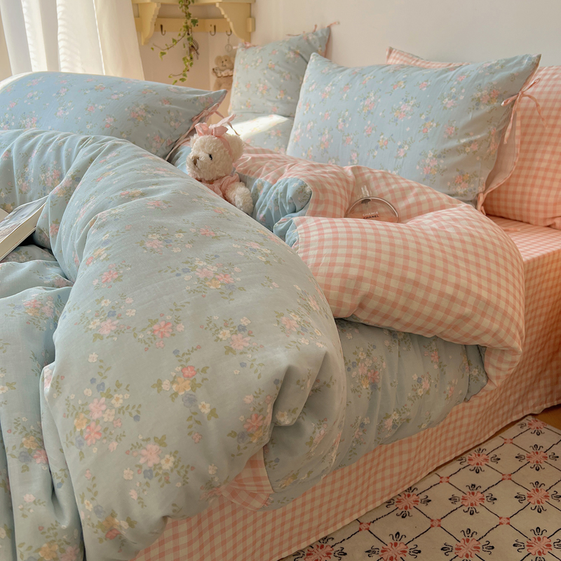 桃喜 2025双层纱碎花格子蝴蝶结系列四件套 悠蓝粉格
