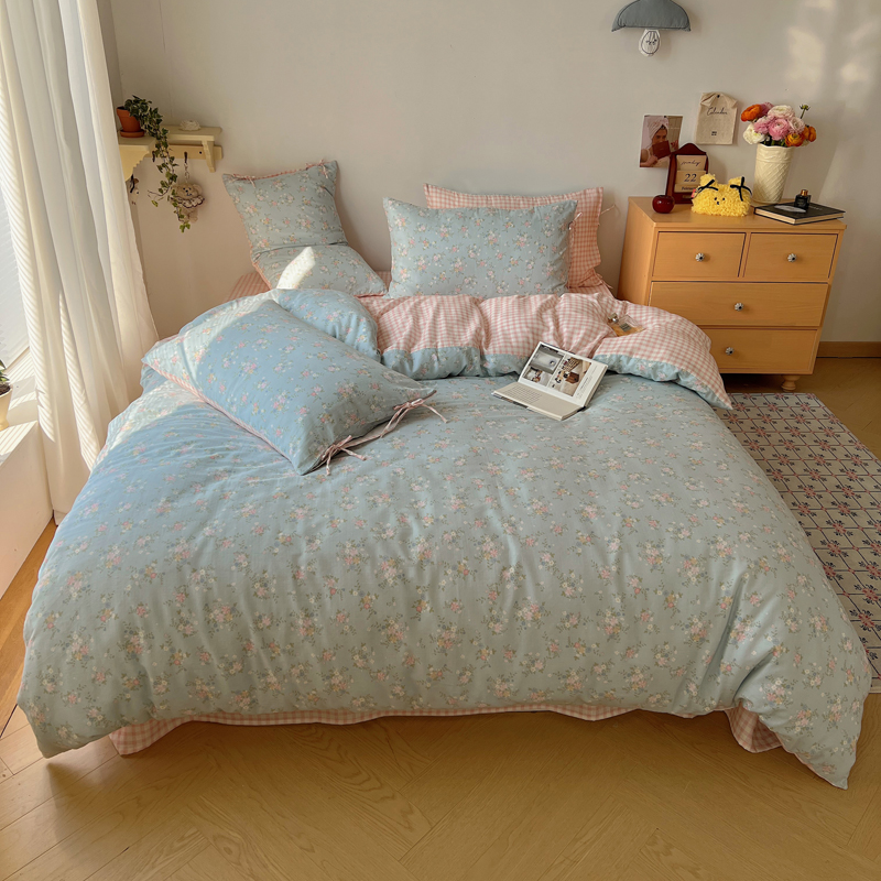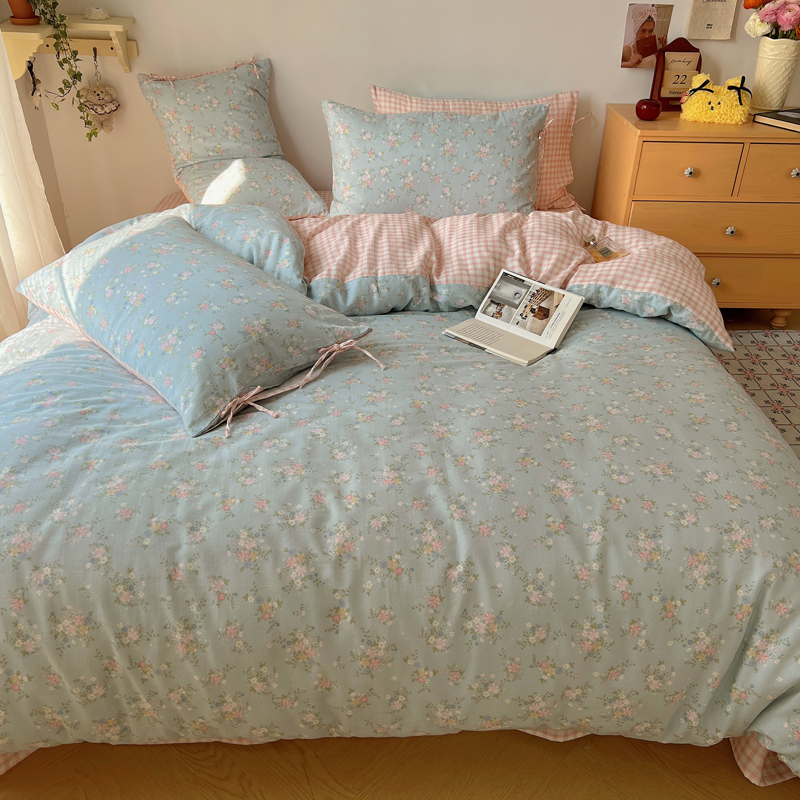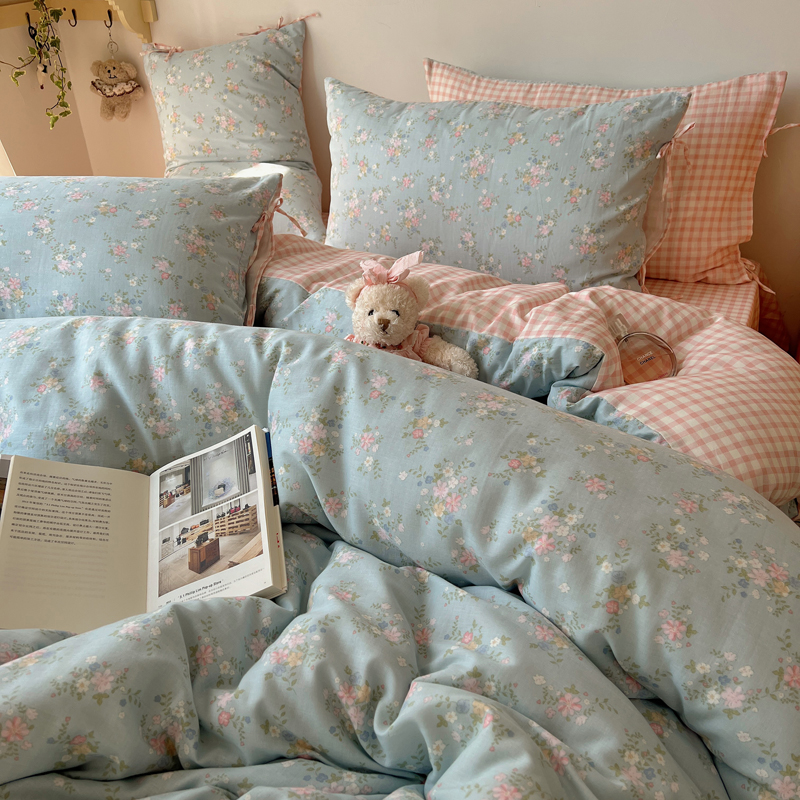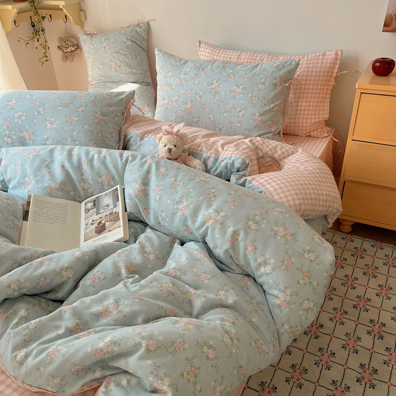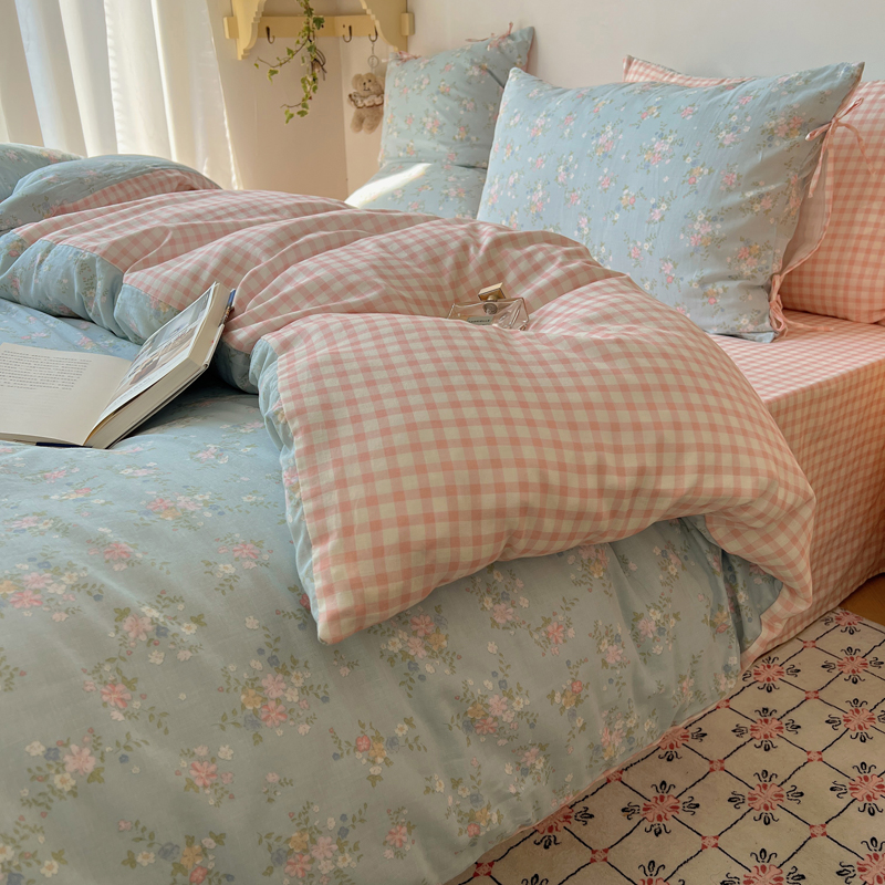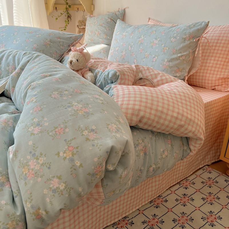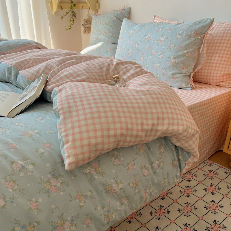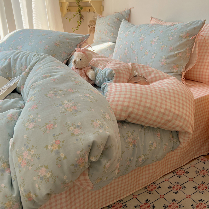 桃喜 2025双层纱碎花格子蝴蝶结系列四件套 悠蓝粉格