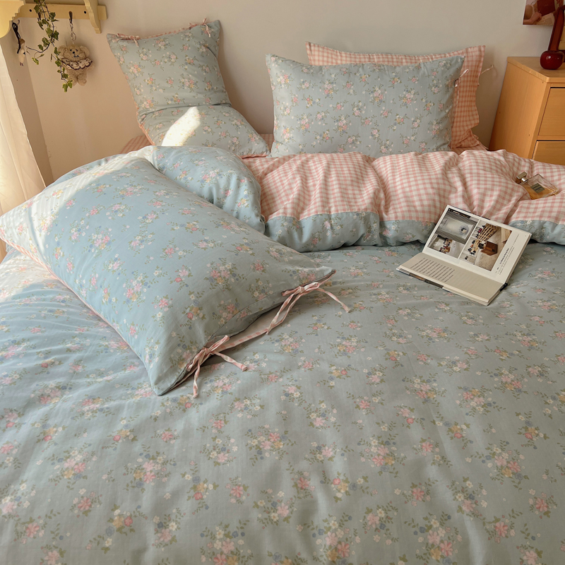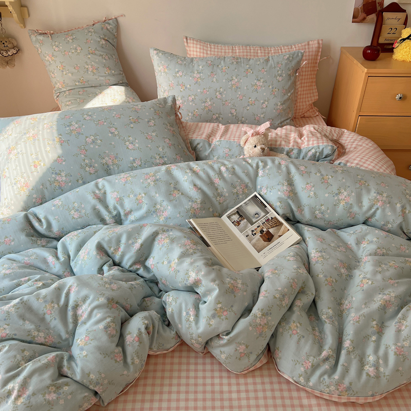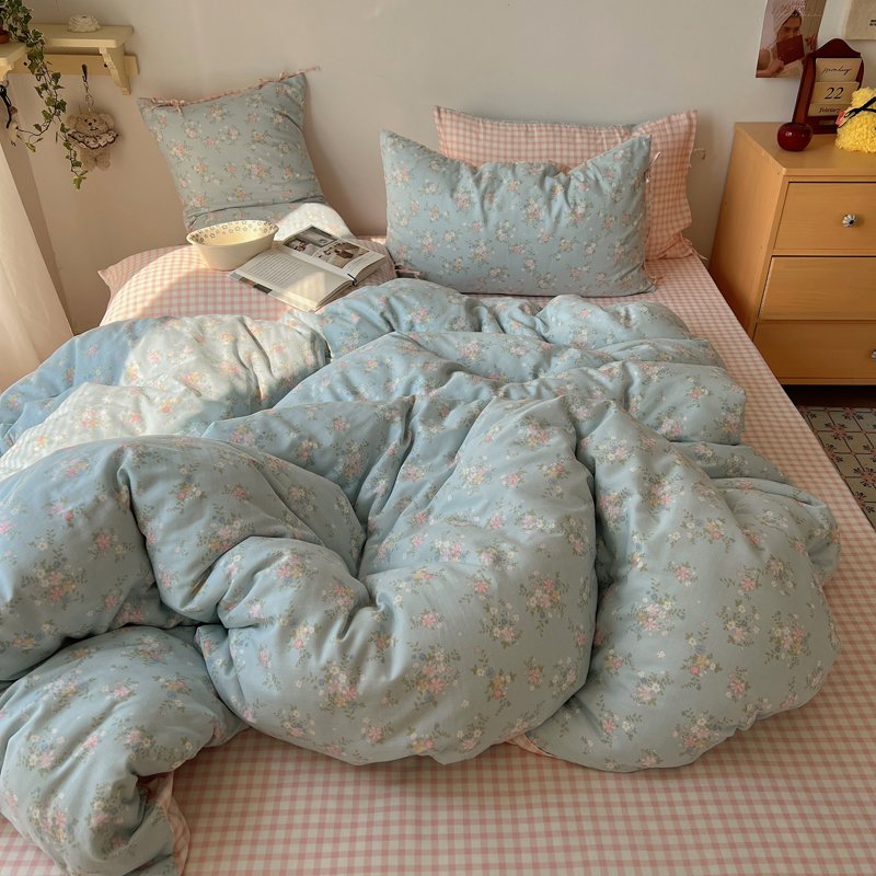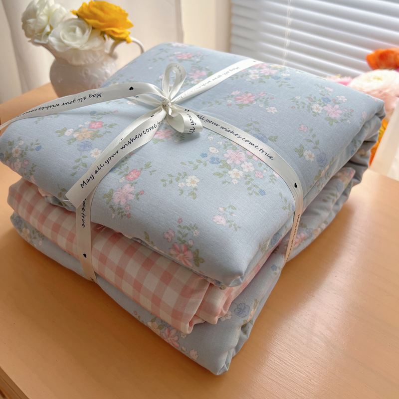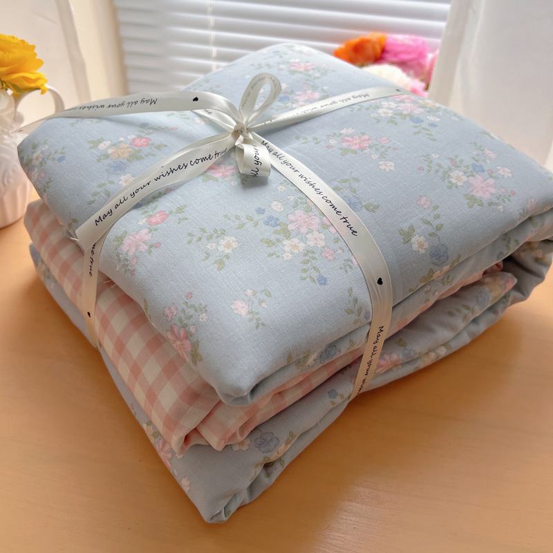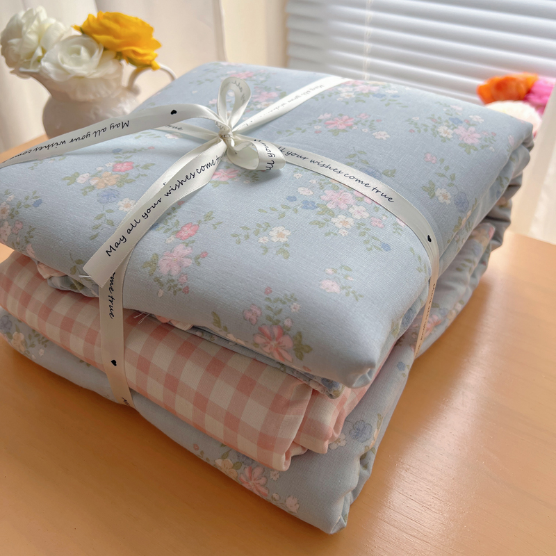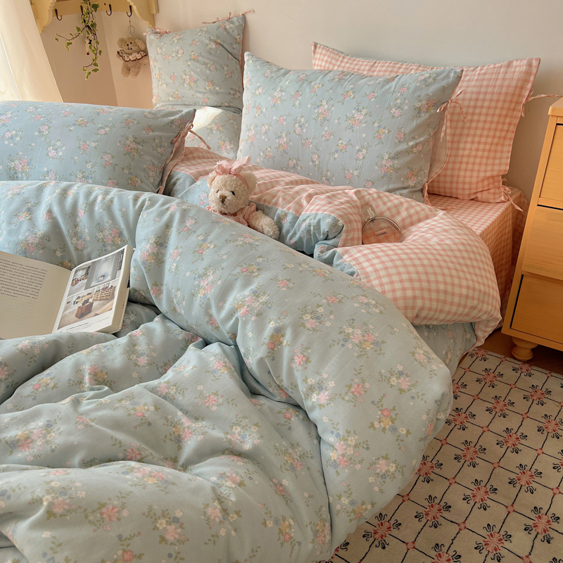 桃喜 2025双层纱碎花格子蝴蝶结系列四件套 悠蓝粉格