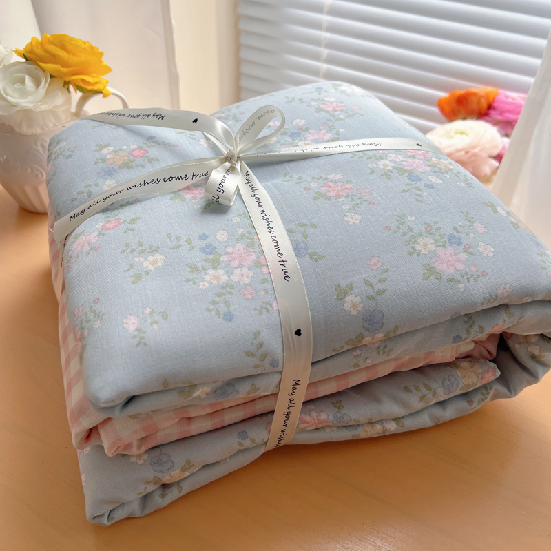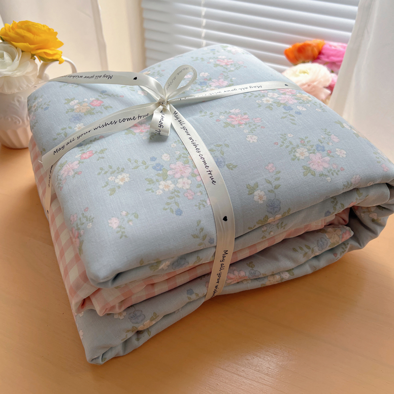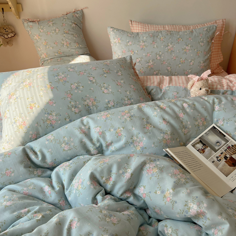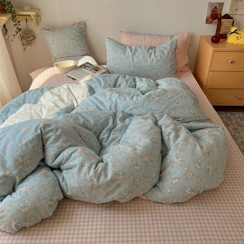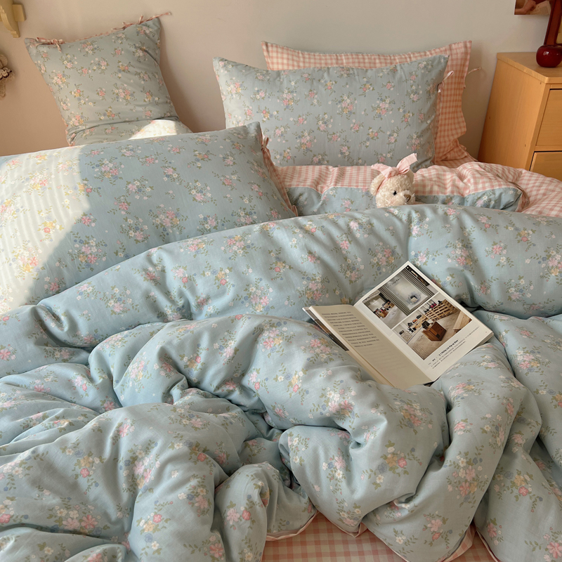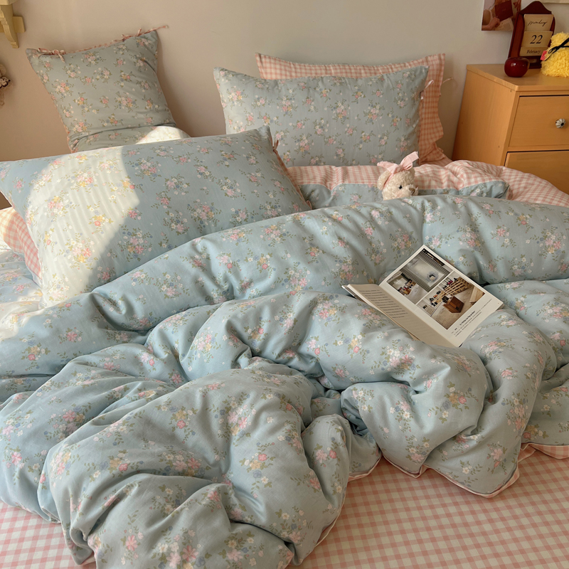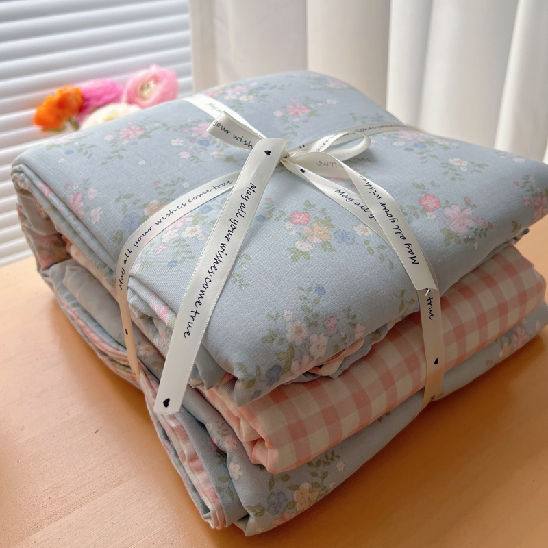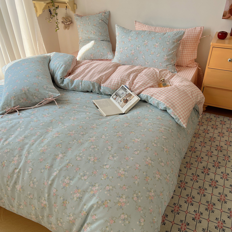 桃喜 2025双层纱碎花格子蝴蝶结系列四件套 悠蓝粉格