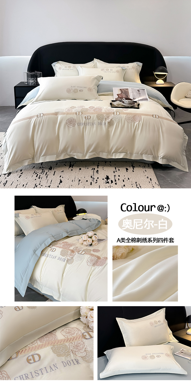 商品名称:懒猫家纺 高精密40支13374全棉喷气绣花四件套 【带礼盒】 奥尼尔-白