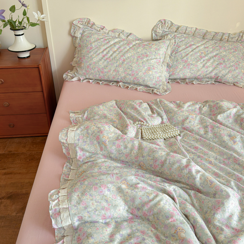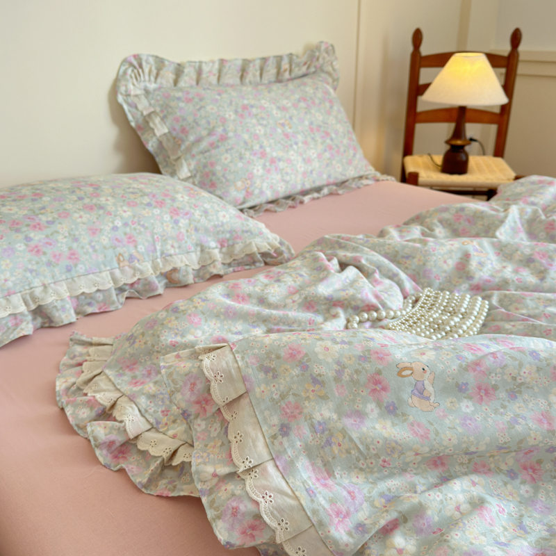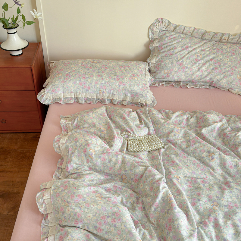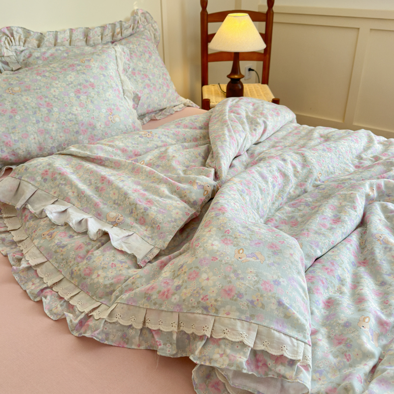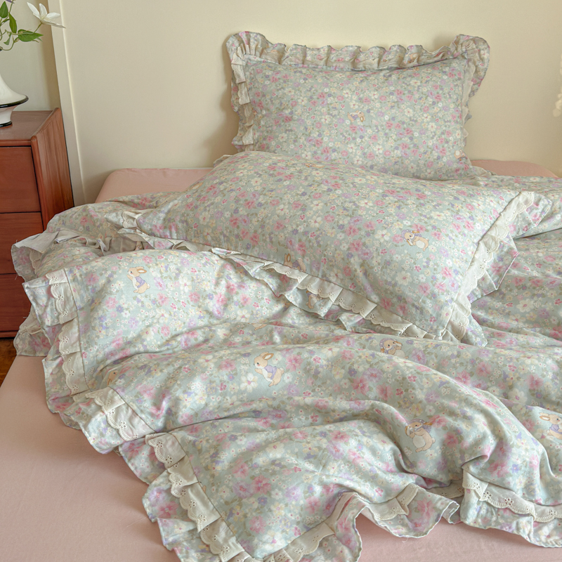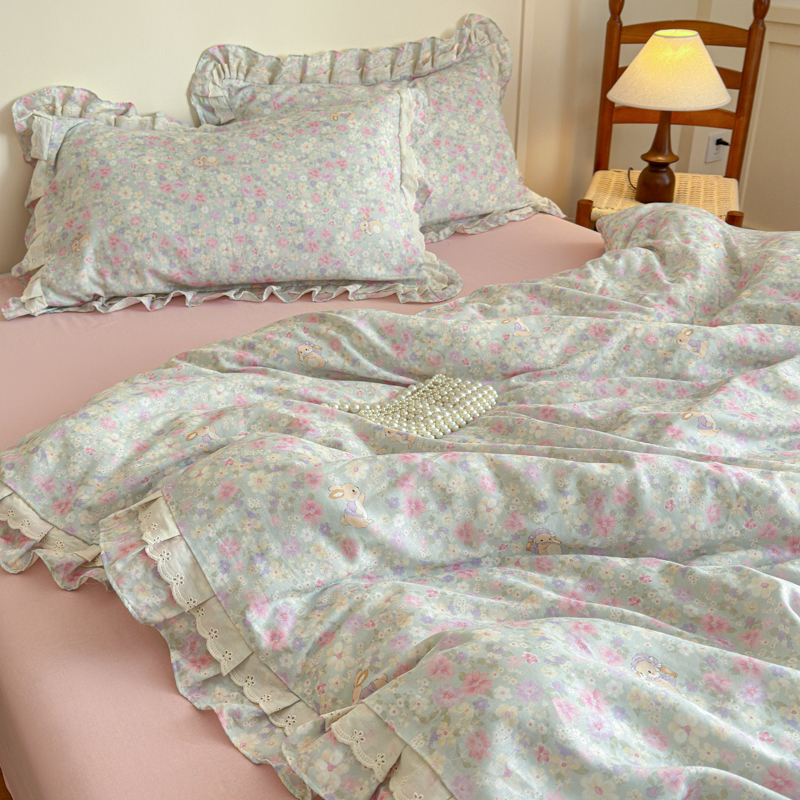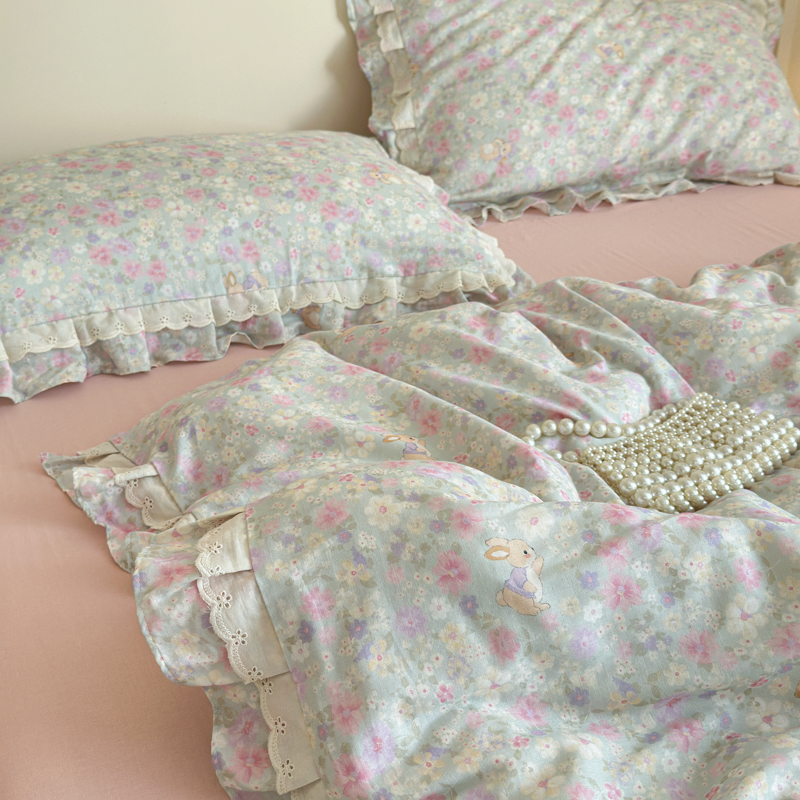 当前位置: 91家纺网 > 商品网购 > 床品套件 > 四件套 > 双层纱四件套 > 乐童家纺 2025纯棉A类双层纱双花边工艺小清新四件套 油画小兔