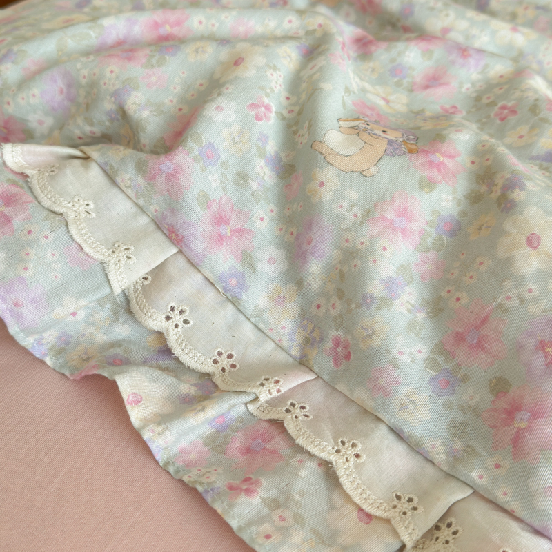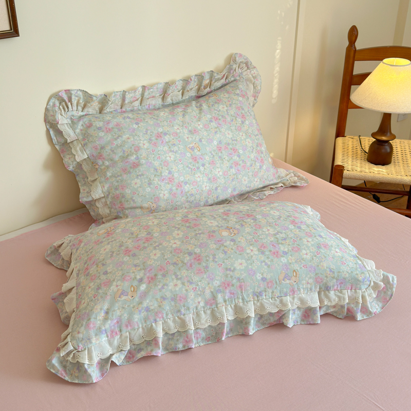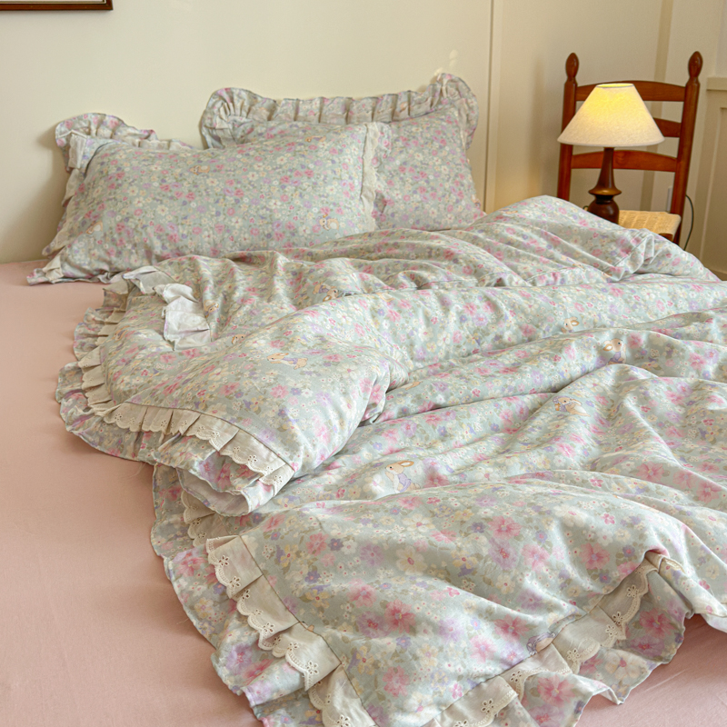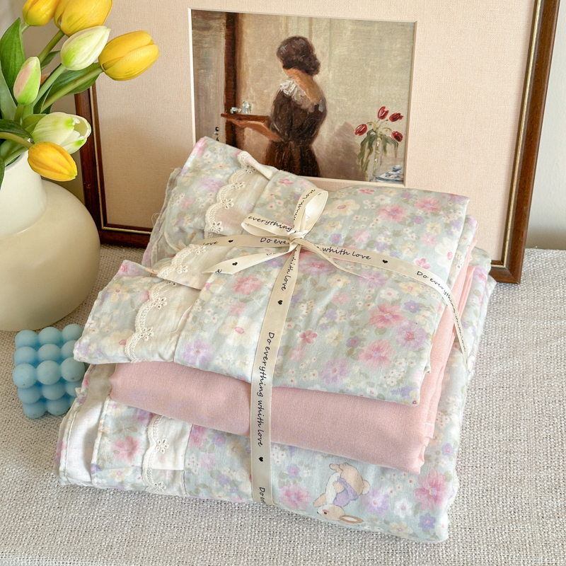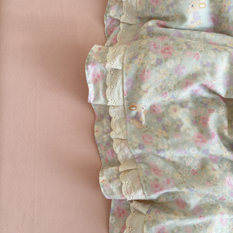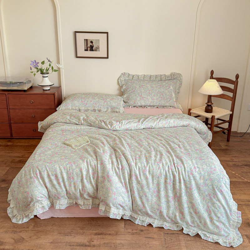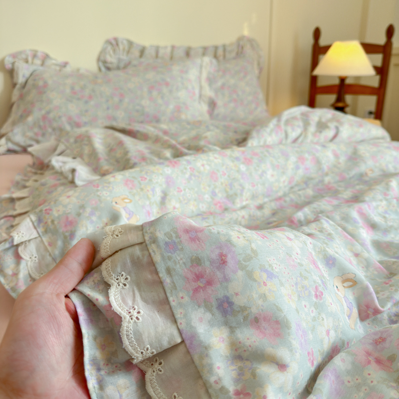 当前位置: 91家纺网 > 商品网购 > 床品套件 > 四件套 > 双层纱四件套 > 乐童家纺 2025纯棉A类双层纱双花边工艺小清新四件套 油画小兔