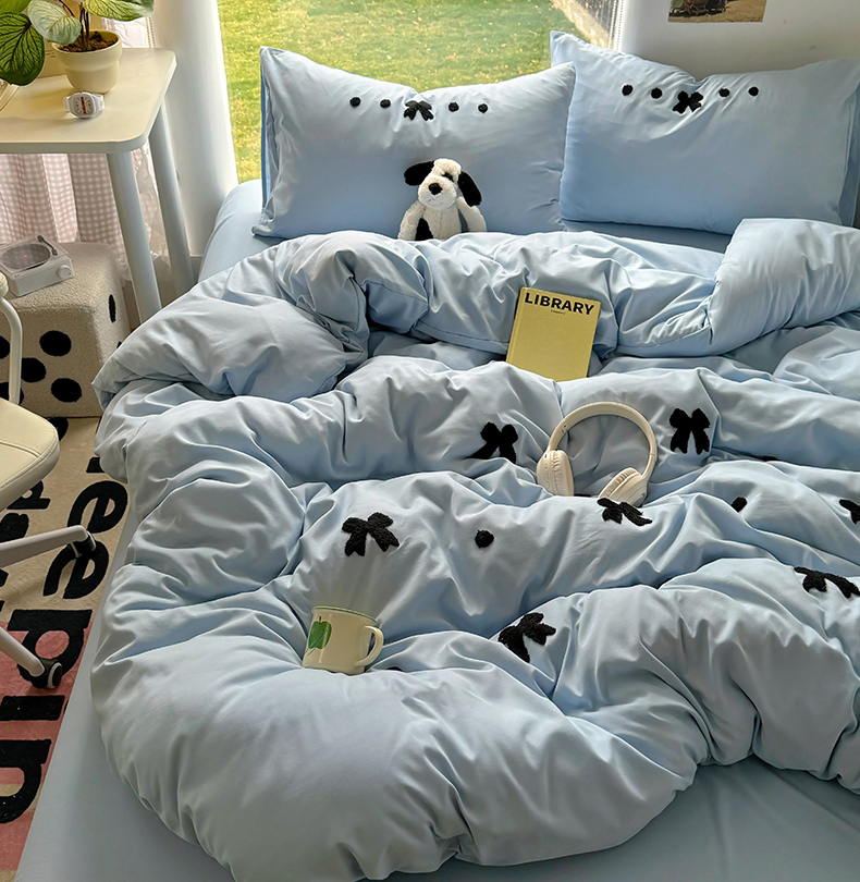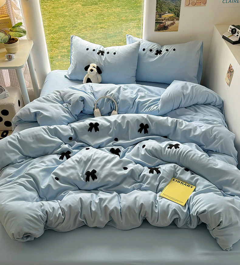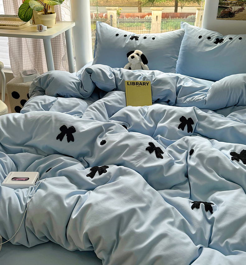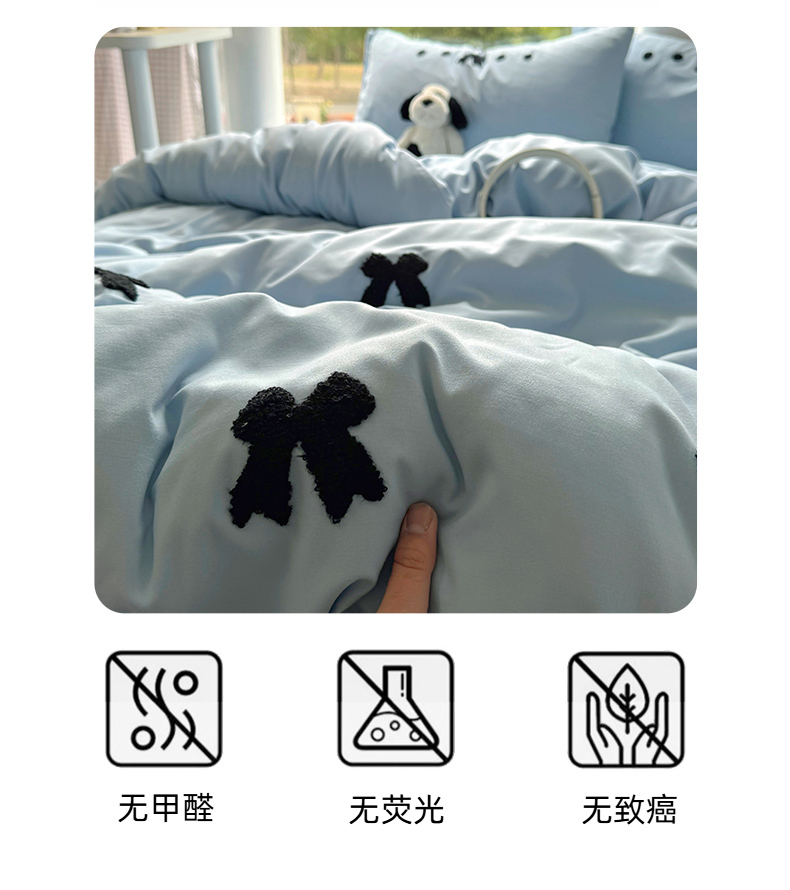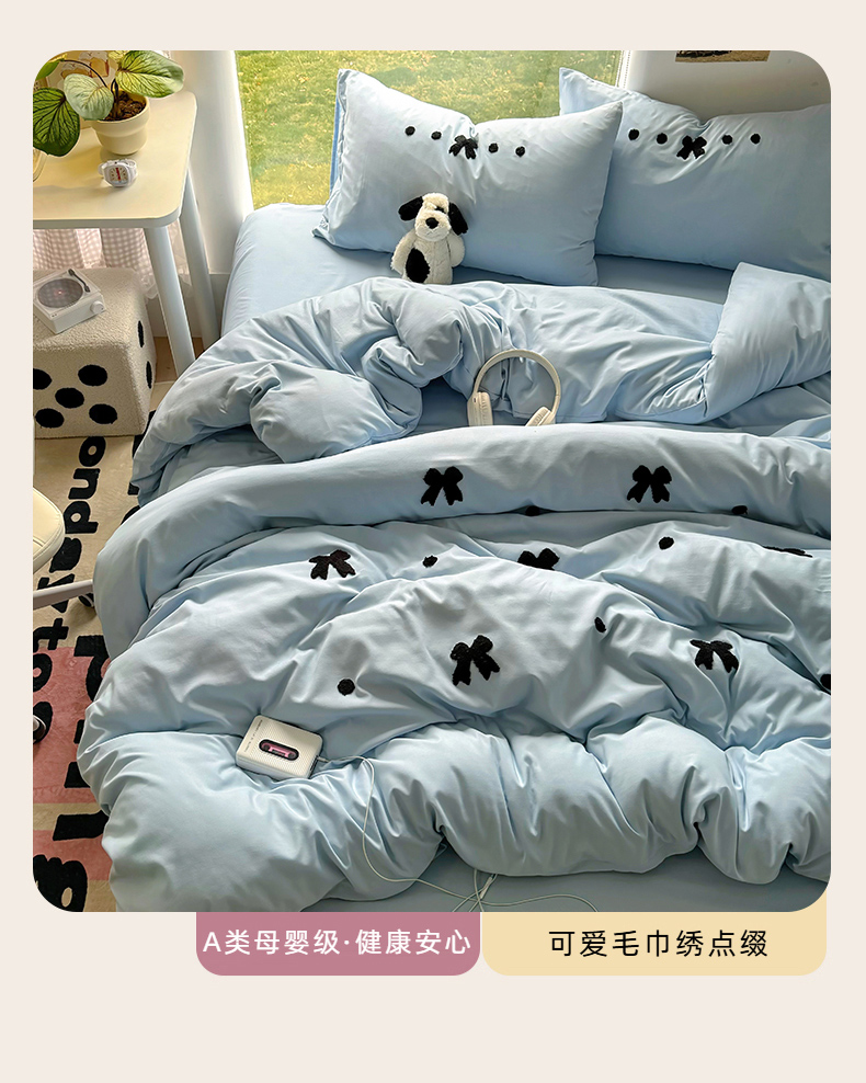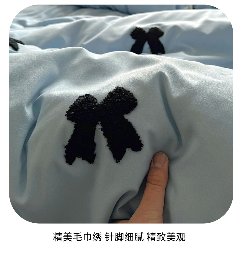 当前位置: 91家纺网 > 商品网购 > 床品套件 > 四件套 > 水洗棉四件套 > 耀达家居 2025新款A类水洗棉毛巾绣四件套 蝴蝶结-蓝
