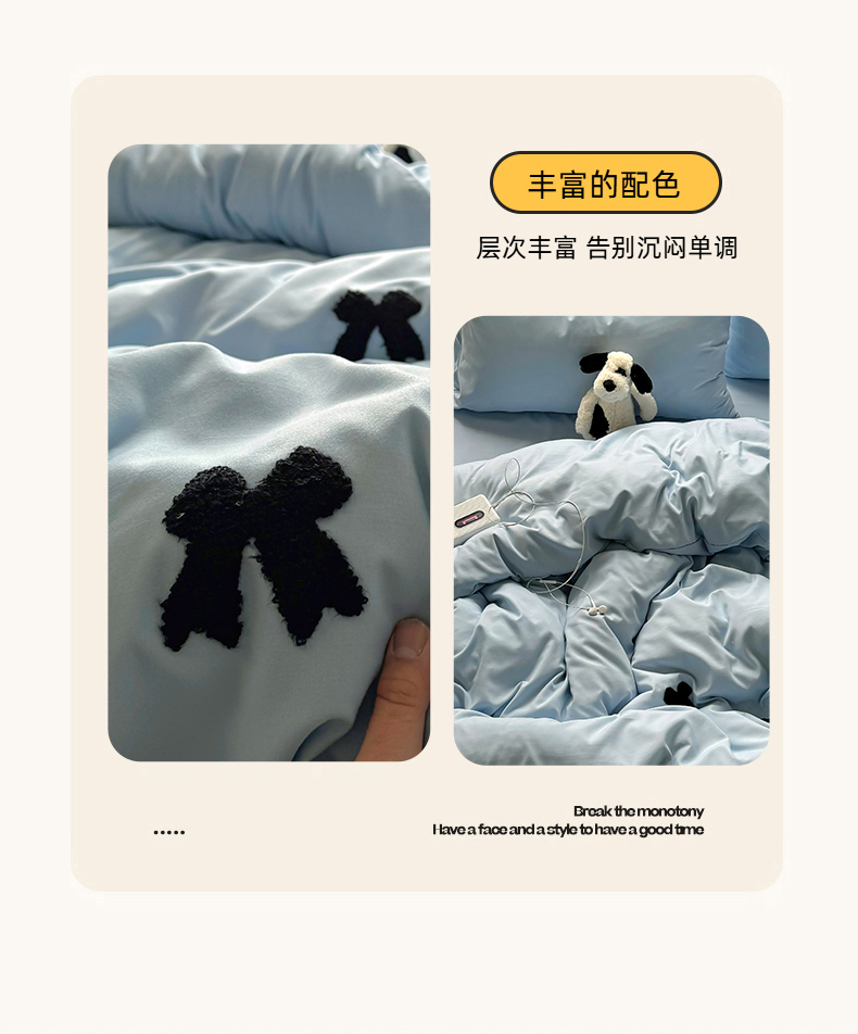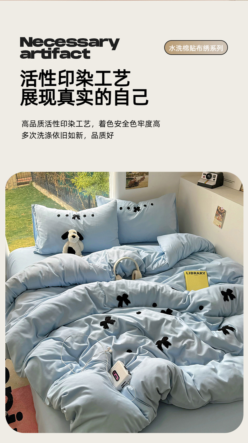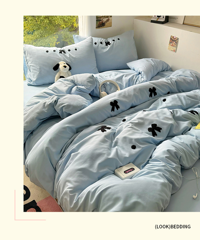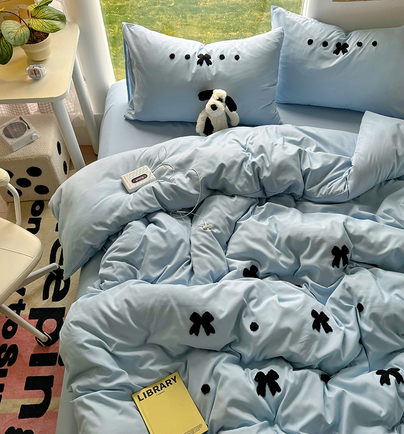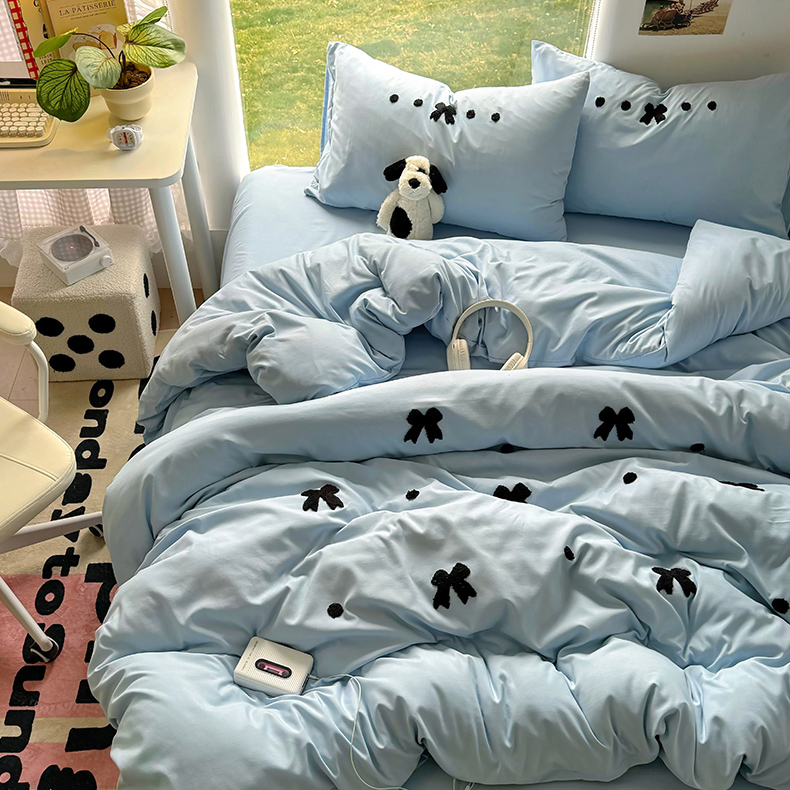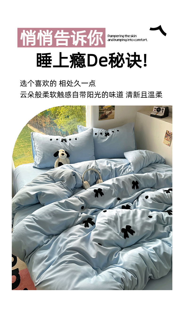 当前位置: 91家纺网 > 商品网购 > 床品套件 > 四件套 > 水洗棉四件套 > 耀达家居 2025新款A类水洗棉毛巾绣四件套 蝴蝶结-蓝