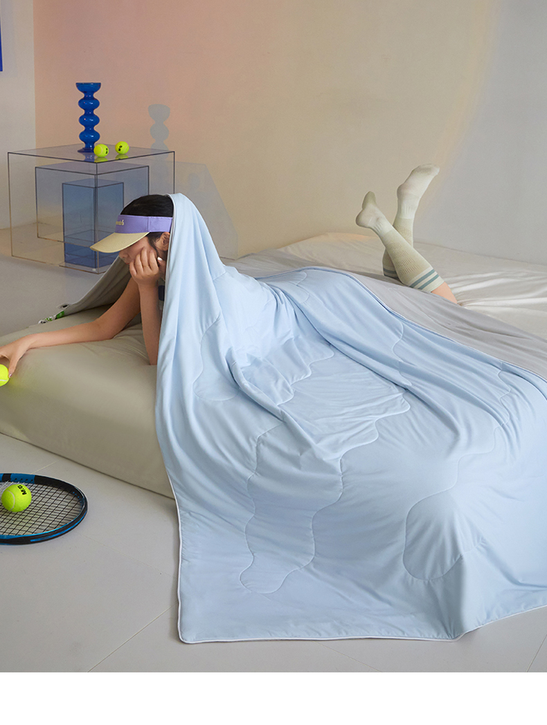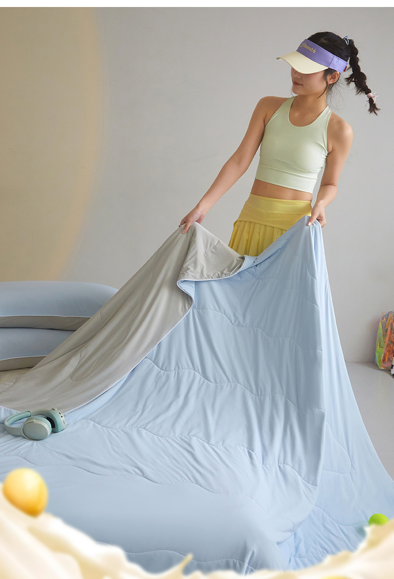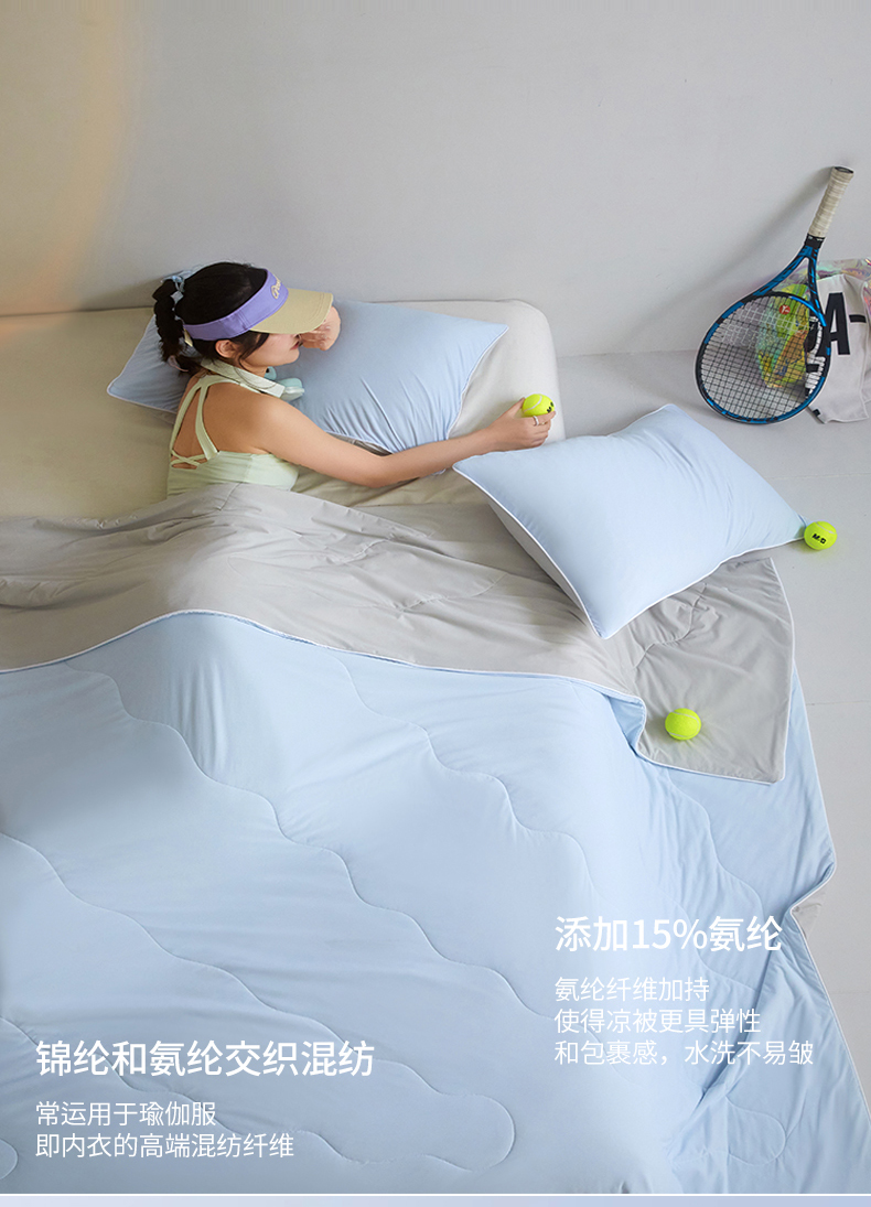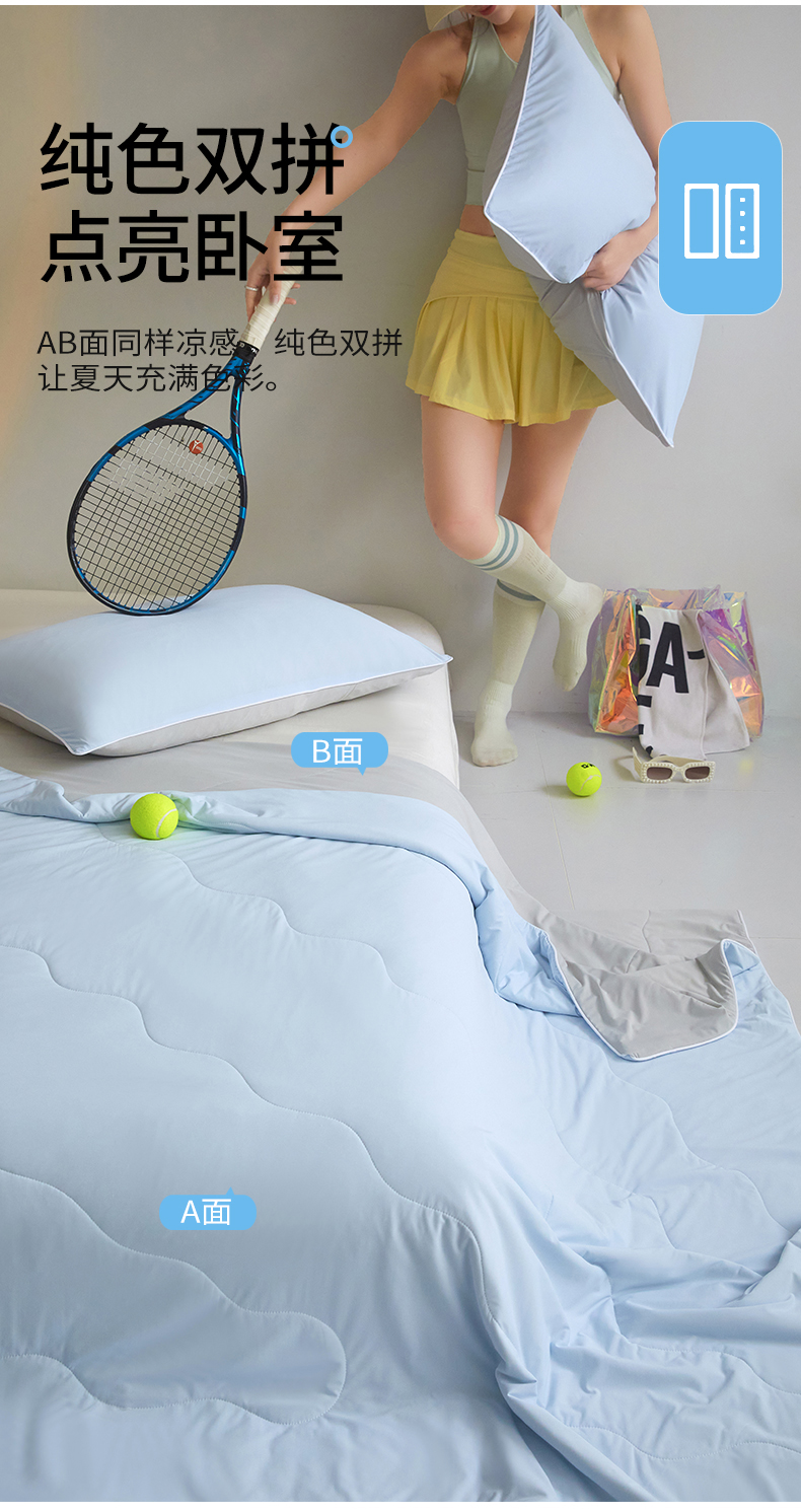 被子 > 夏被 > 头等舱 2025新款4.0版凉感A类锦氨(165克)55大豆抗菌夏凉被夏被配礼盒模特图 典雅兰拼浅灰