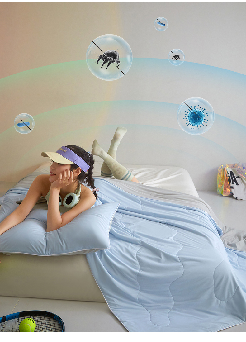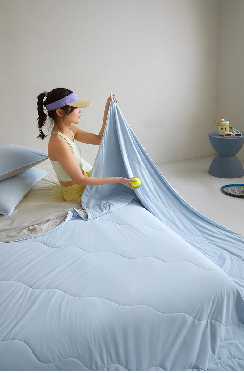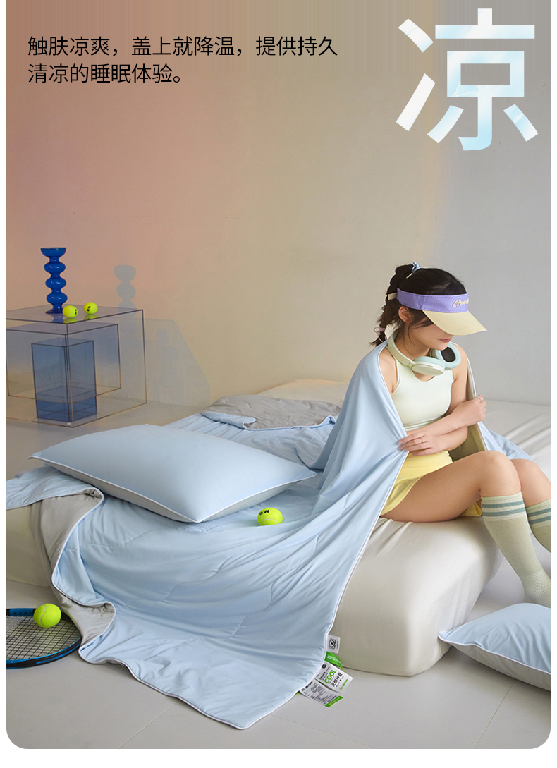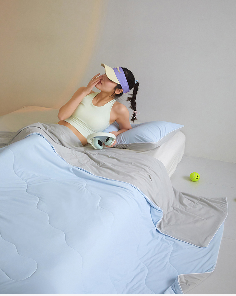 被子 > 夏被 > 头等舱 2025新款4.0版凉感A类锦氨(165克)55大豆抗菌夏凉被夏被配礼盒模特图 典雅兰拼浅灰