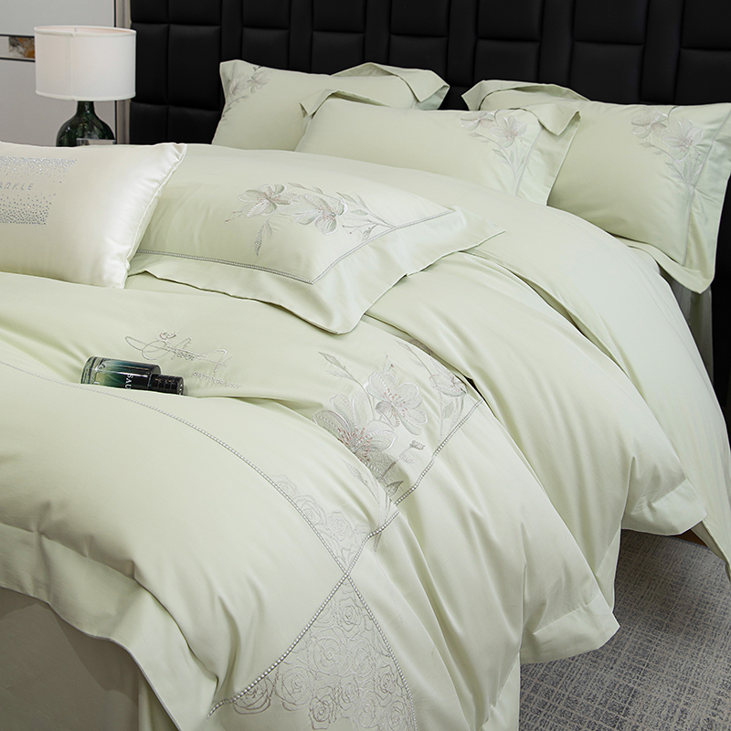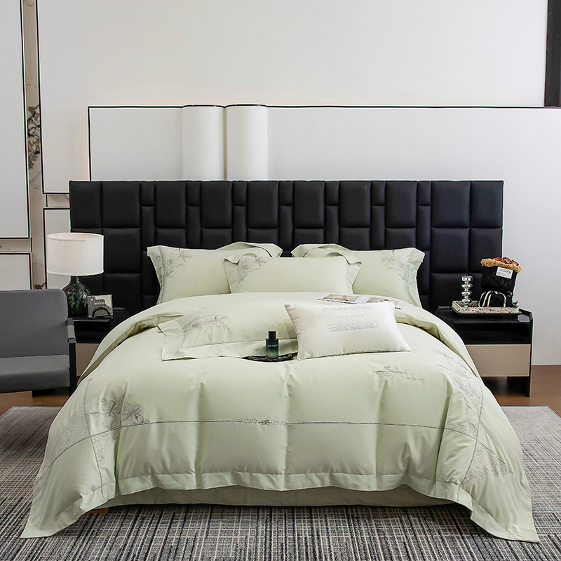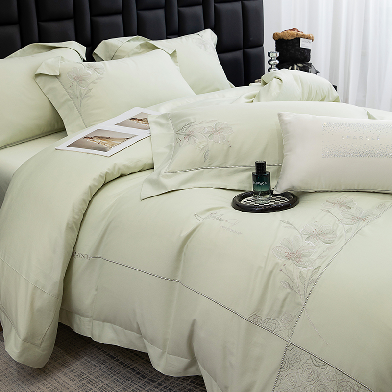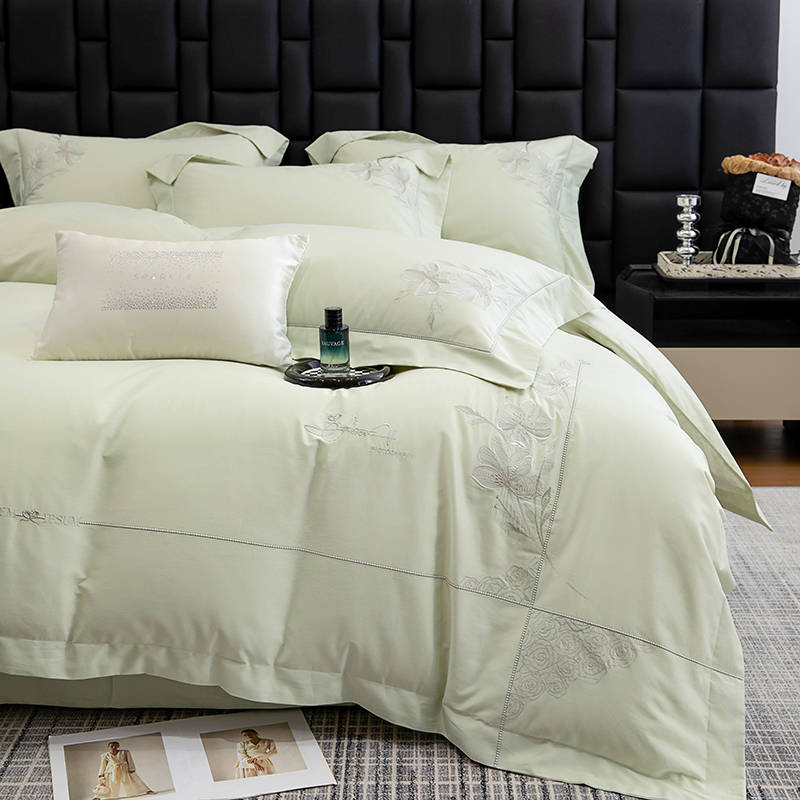 商品名称:张公子婚庆馆 2025新款120支新疆长绒棉居家绣花工艺系列四件套—花雾 青草绿